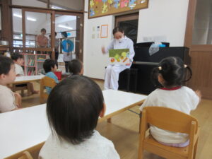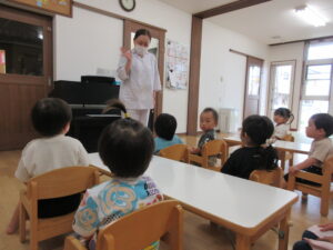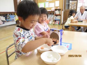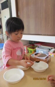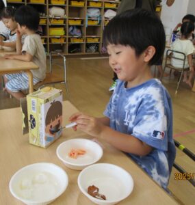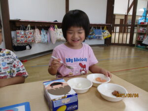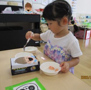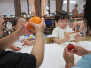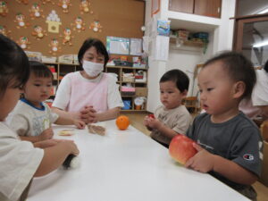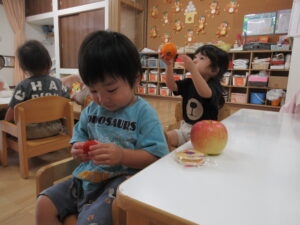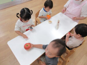 「ごっくん」「モグモグ」「美味しいなぁ」と話しながら、楽しんで活動ができました。