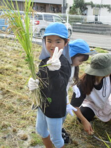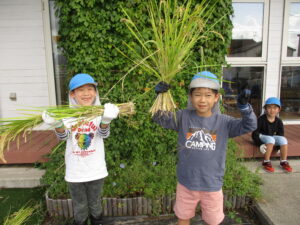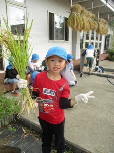 作物が育つには、「土・太陽・雨」が必要なこと、みんながご飯を食べるまでには、たくさんの作業があることを知りました。刈り取った籾を、脱穀、精米などすることで、私たちが食べるお米となります。みんなが収穫したお米は、保育園でいただく予定です!