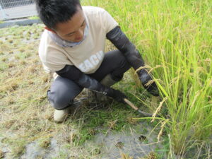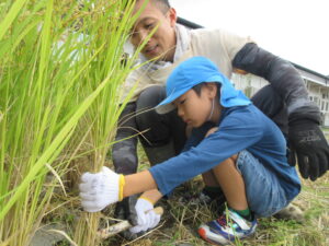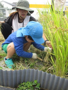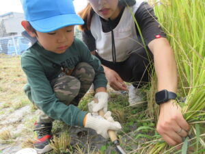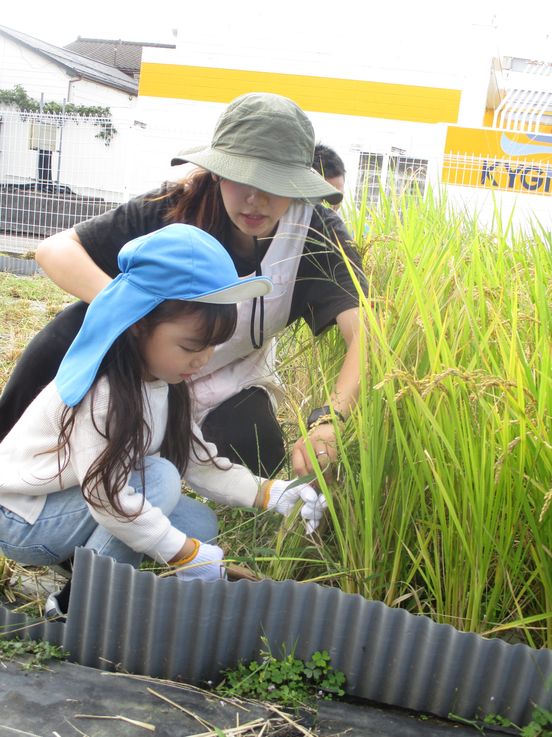 「緊張するー」と言っていたお友達もいましたが、先生と一緒に鎌を持ち、丁寧に稲刈りをすることができました。