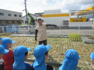 6月に田植えを行ってから、保育園の田んぼを見ながら稲刈りをずっと楽しみに待っていたくじら組さん。一面黄金色に染まった景色に大興奮!「植えた苗、大きくなってるね!」と嬉しそうに話していました。先生から稲刈りの仕方や気を付けることを教えてもらいました。