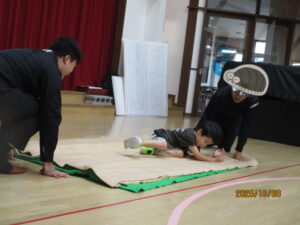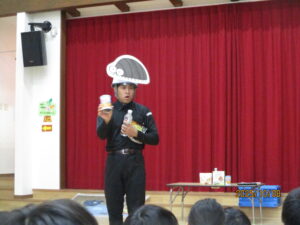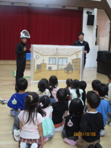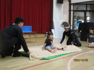 今日は、3歳以上児が、防災教室に参加しました。柏崎市役所の防災・原子力課防災係の方が保育園に来てくれ、防災について分かりやすく話をしてくれました。ダンゴ虫先生と一緒にたくさん勉強しました。まずは、地震体験。ぐらぐらした時、立っていると転んだり上から物が落ちてきたりして危ないよ!膝をついて頭を隠そうね。