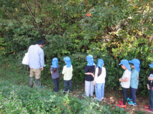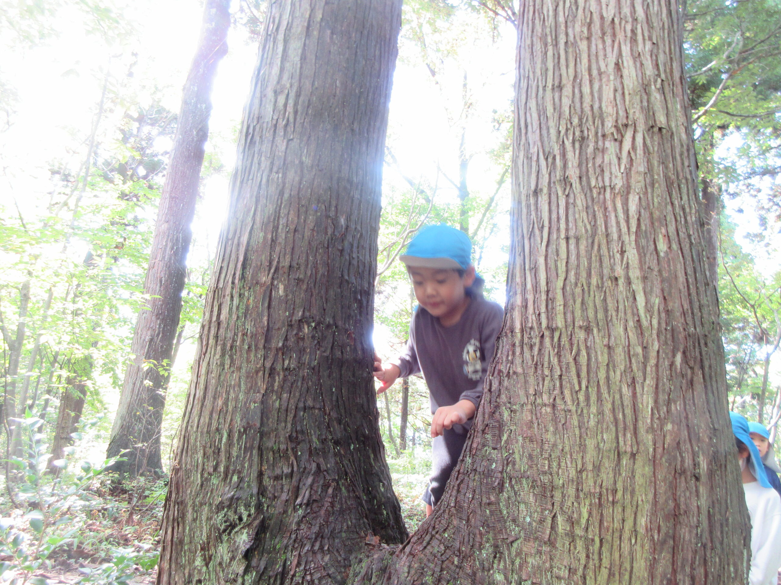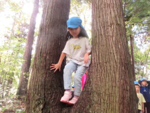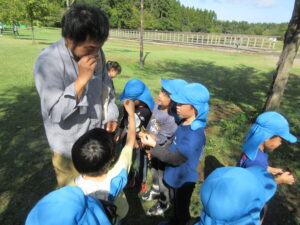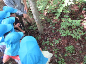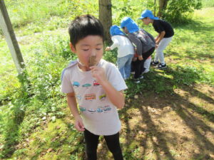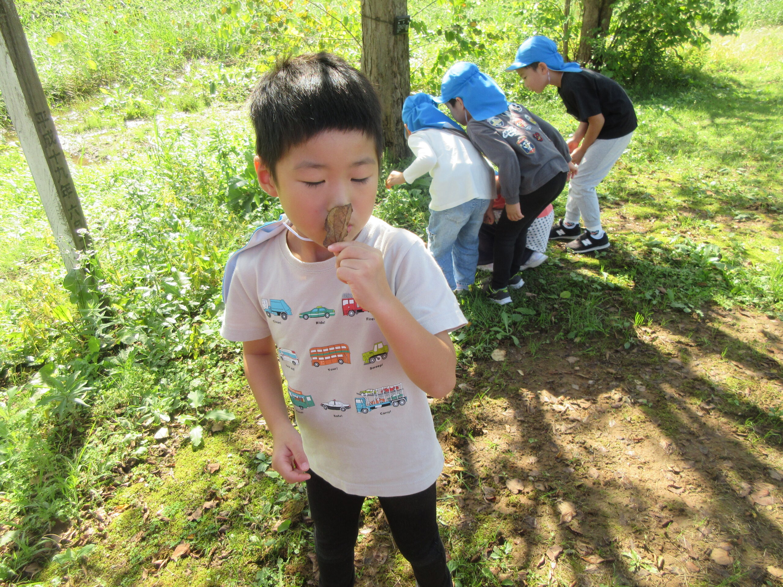 ~森の教室~  森の中を探検したよ!案内役の「たくちゃん」にメープルのような甘い香りがする葉っぱを教えてもらいました。枯れ葉を拾ってみんなで嗅いだり、ミントのような爽やかなにおいの葉っぱを教えてもらい、ちぎって嗅いだりしました。子ども達は、「ほんとだー!」「甘いにおいがする~!」と大喜びでした!