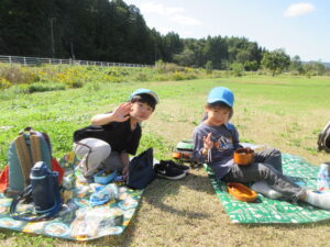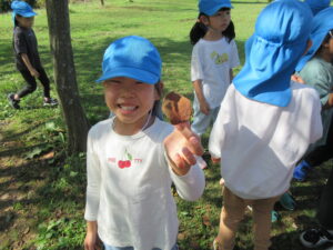 女郎蜘蛛、カマキリ、カエルなどを発見して見つけると「えっ!どこどこ??」とすぐにかけ寄り、群がっていました。大きなドングリや栗も拾いました!