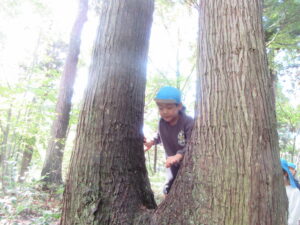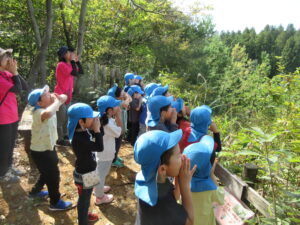 木に土がついているのを見て、イノシシの泥あそびの後だと教えてもらいました。その後、ヤッホーの丘に行くと水溜りがあり、それはイノシシが掘ったものだと知りました。ヤッホーの丘で叫び、「ヤッホー」とやまびこで返ってくると「わぁー聞こえたね~」と喜んでいました。