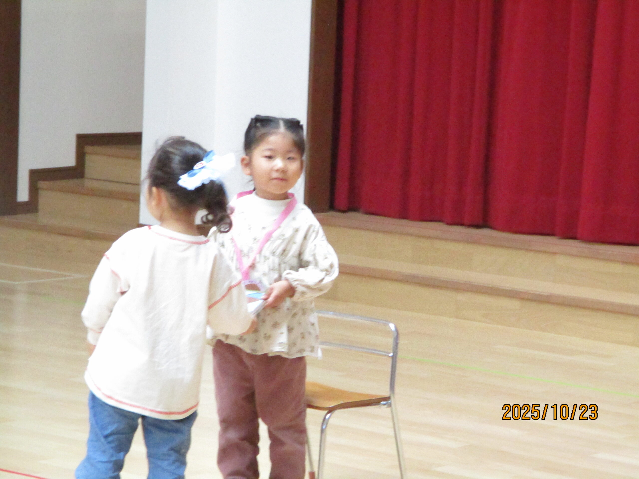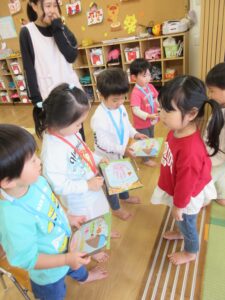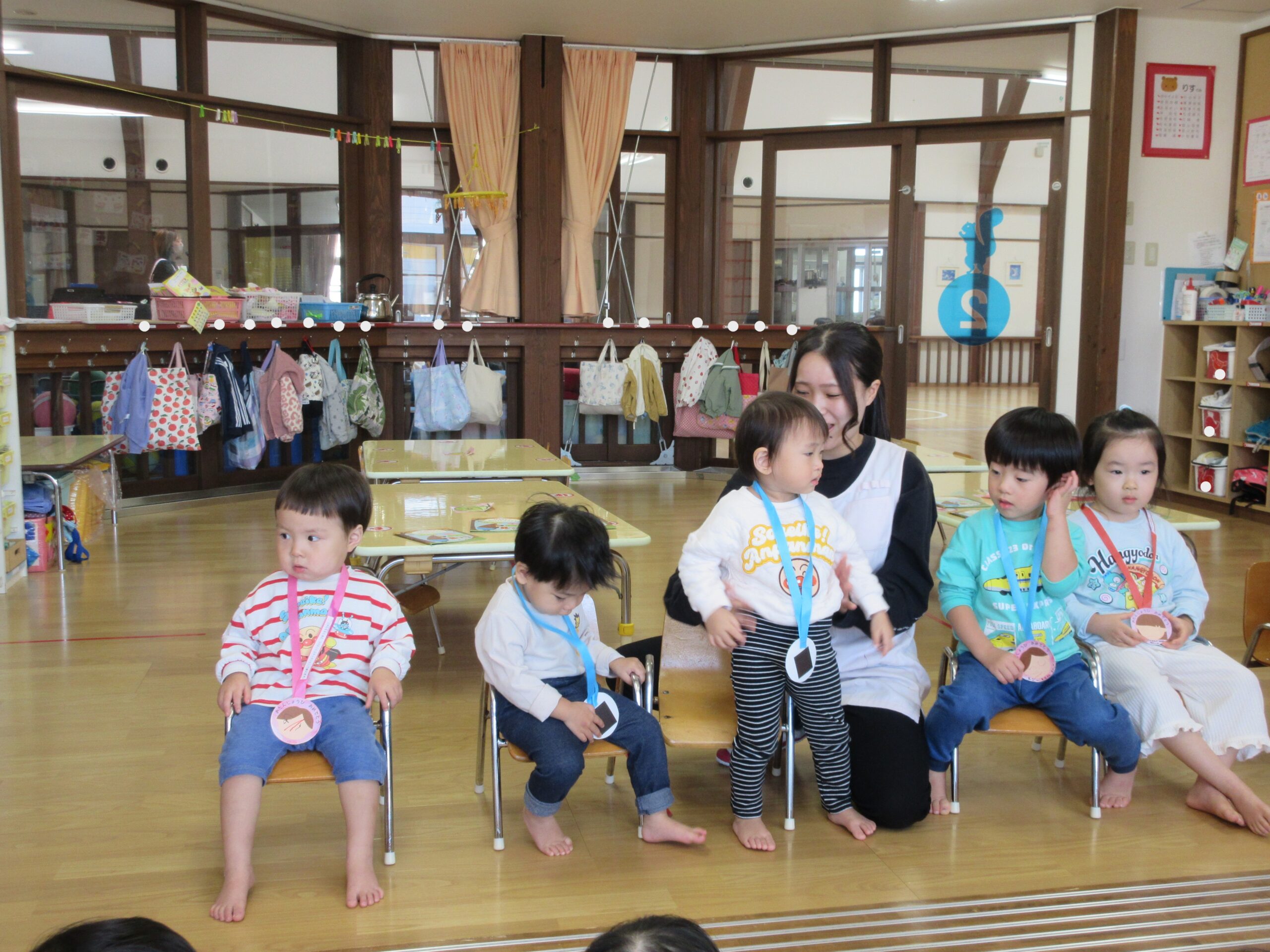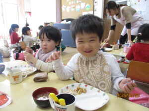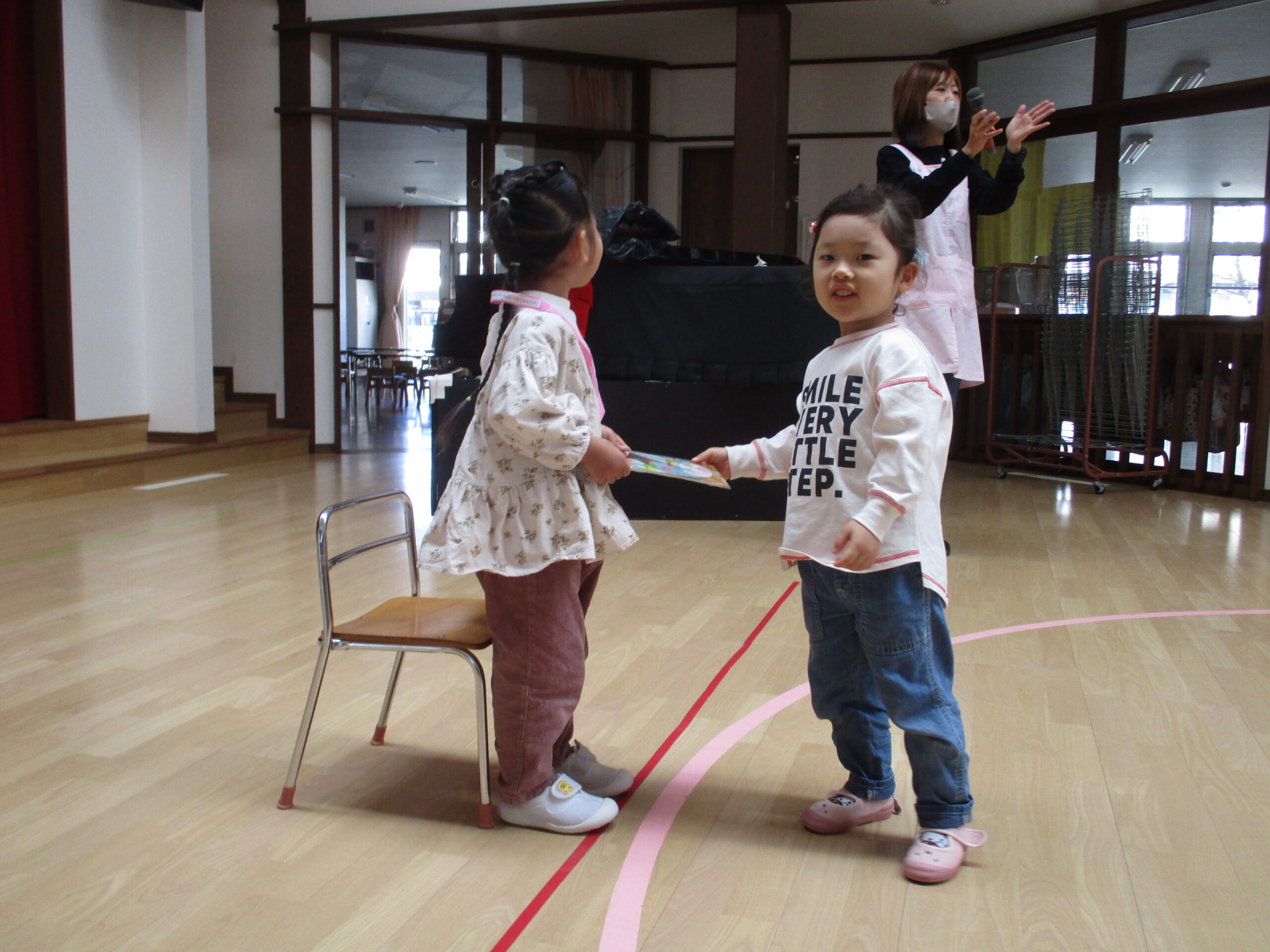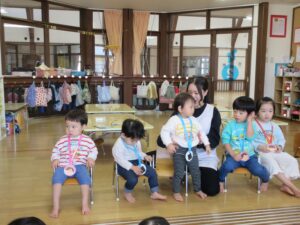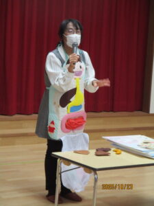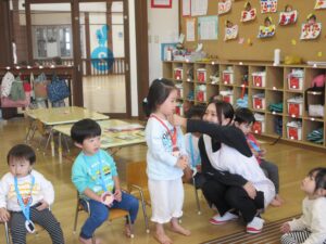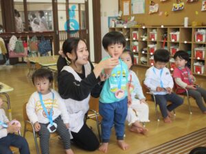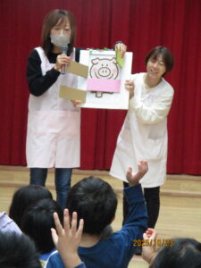 エプロンシアターで、ご飯を食べる大切さも教えてくれました。朝ご飯は、バランスよく食べるといいんだね!好き嫌いをしないで、栄養のあるものをよく噛んで食べ、いいウンチをすると1日元気に過ごすことができるよ!