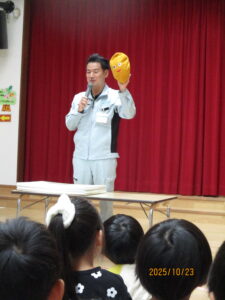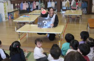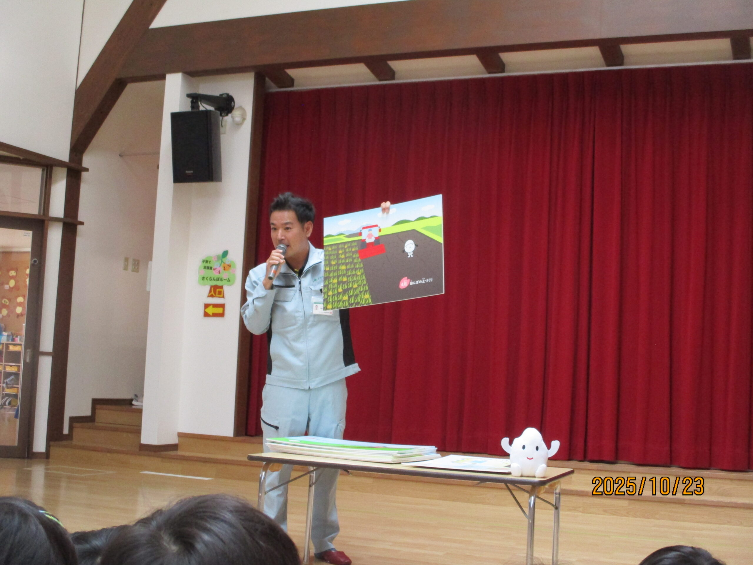 今日のお誕生会は、「しゃかしゃかおにぎり作り」をするということで、JA農協の方が園に来てくださり、お米についてのお話をしてくれました。パネルを使って、お米の育て方やお米のできるまでの話をしてくれました。