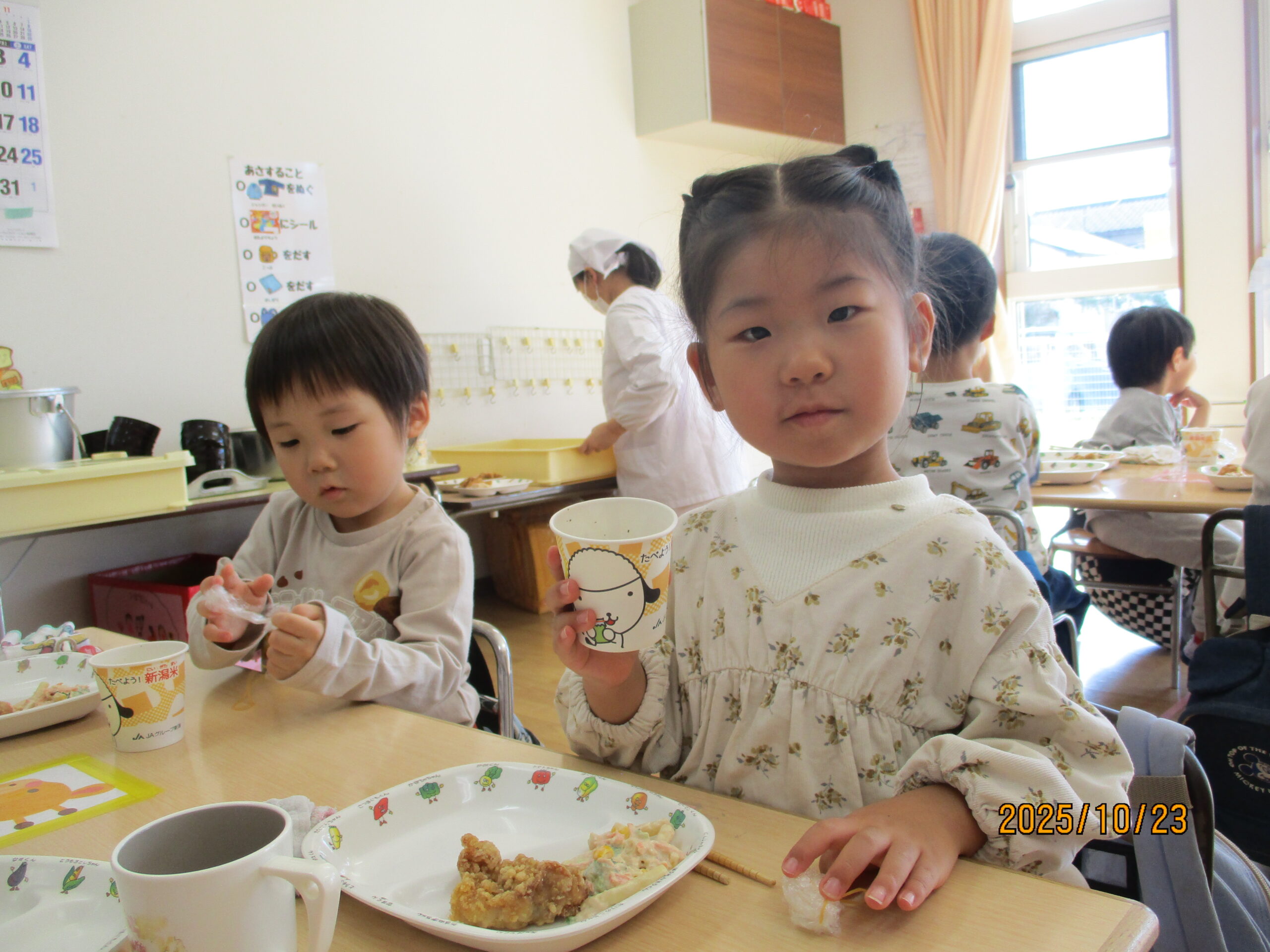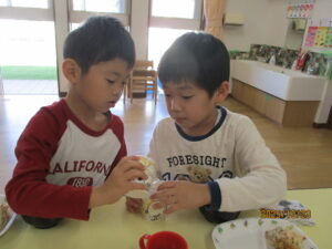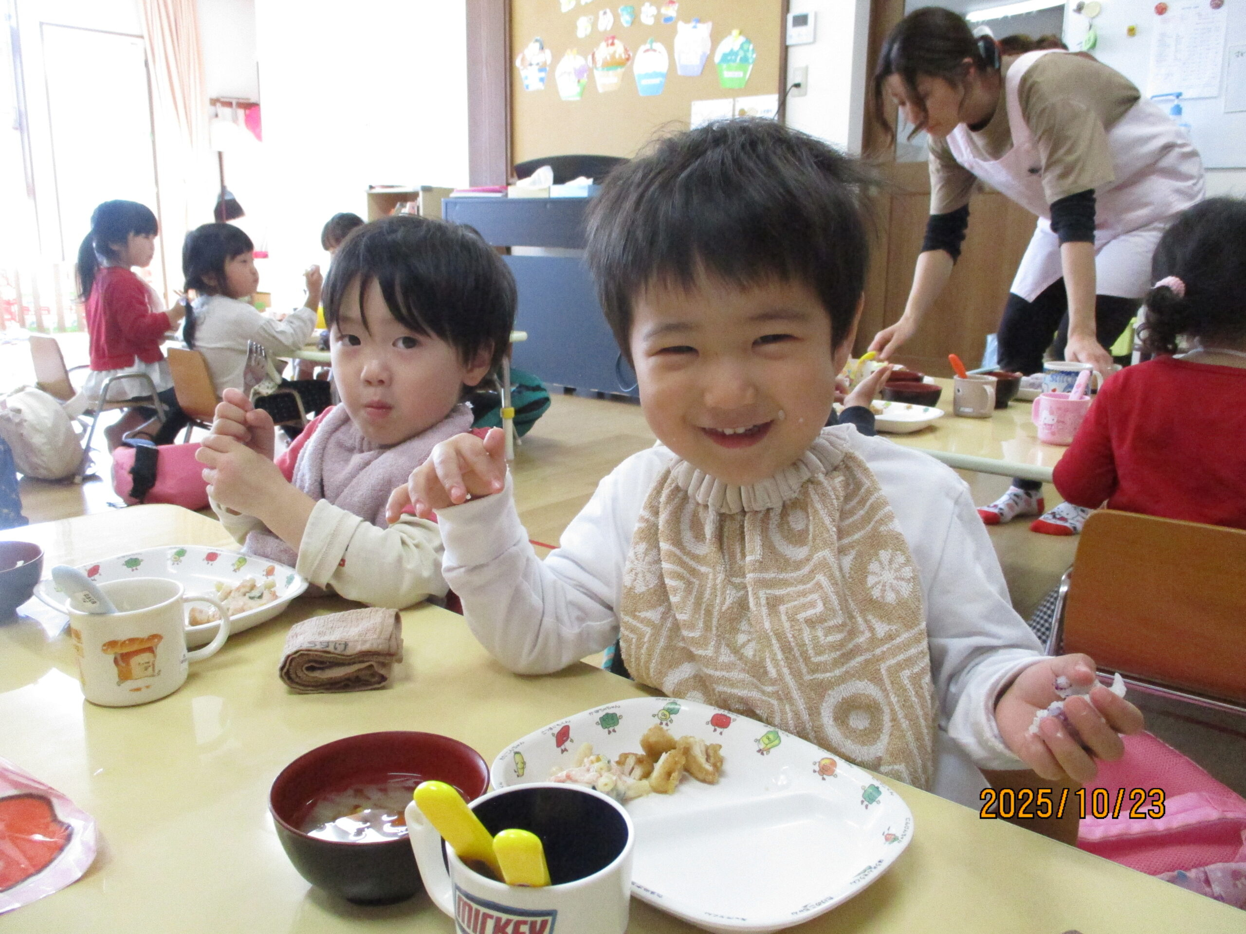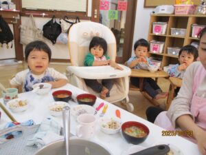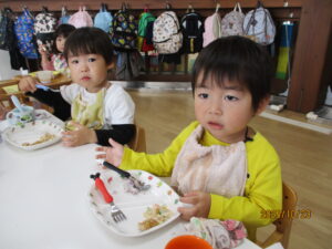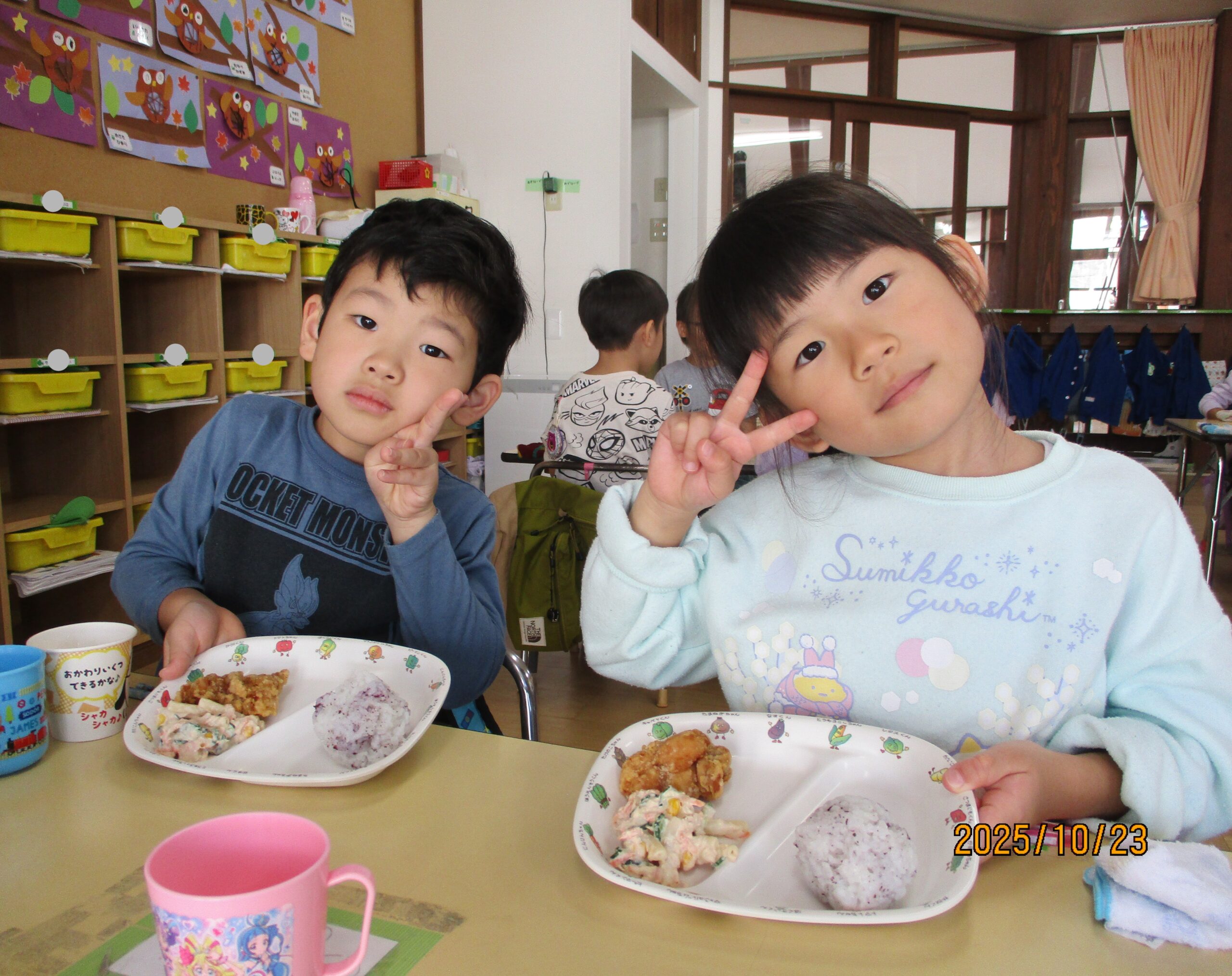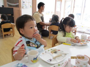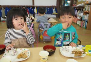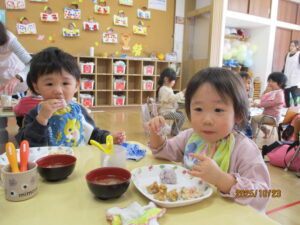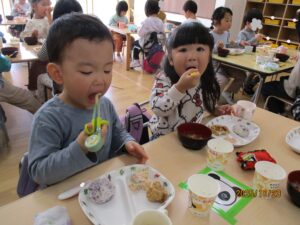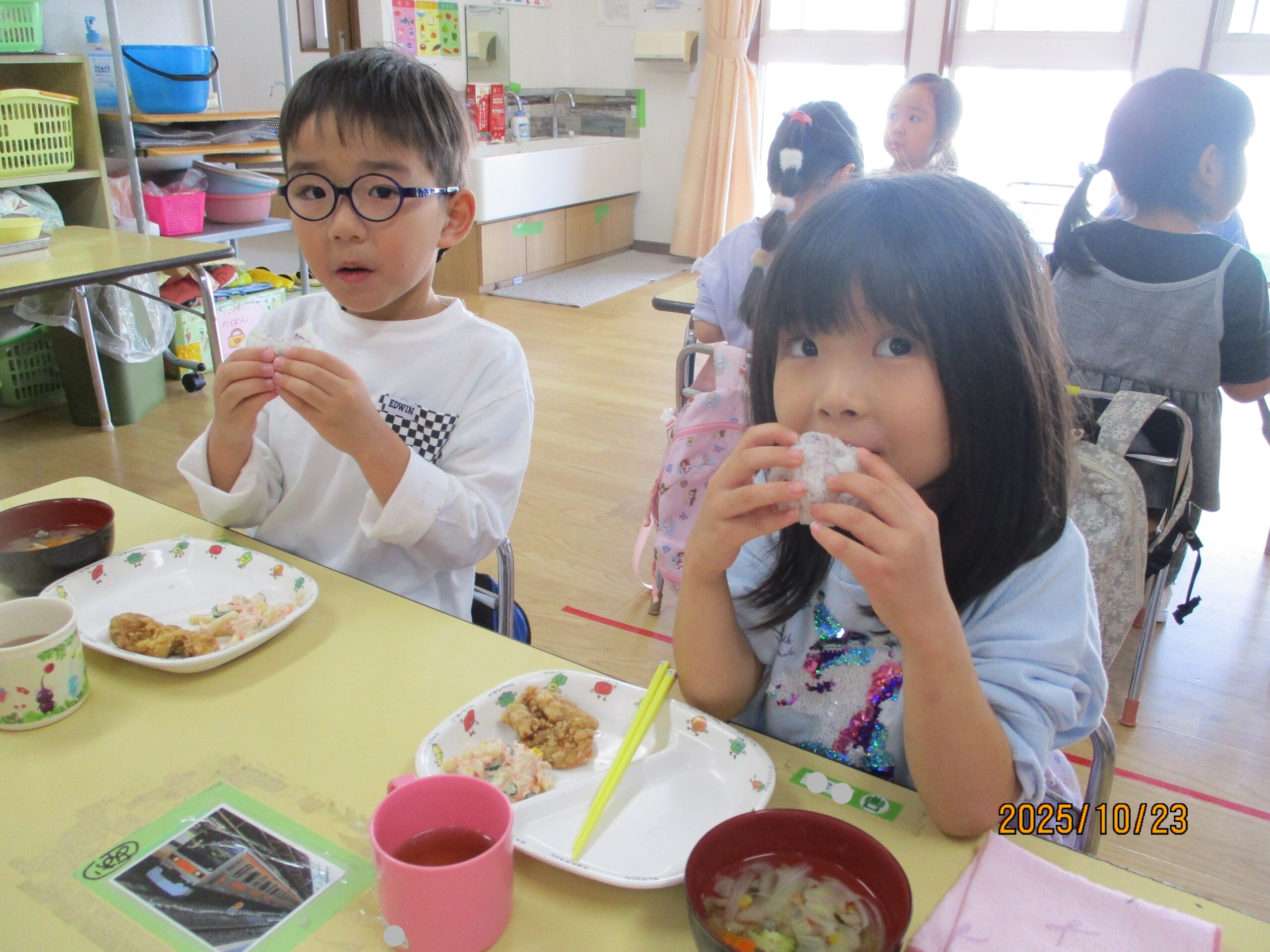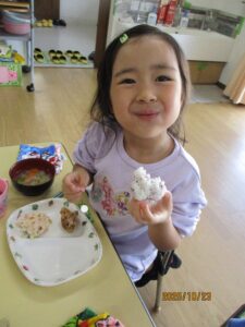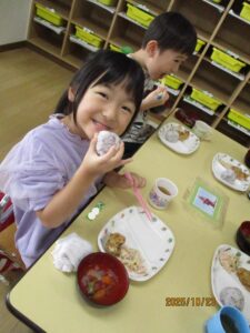 自分で作ったおにぎりを手で頬張って食べました!「おいしーい!」「さいこー!」との声。みんなあっという間に完食していました。