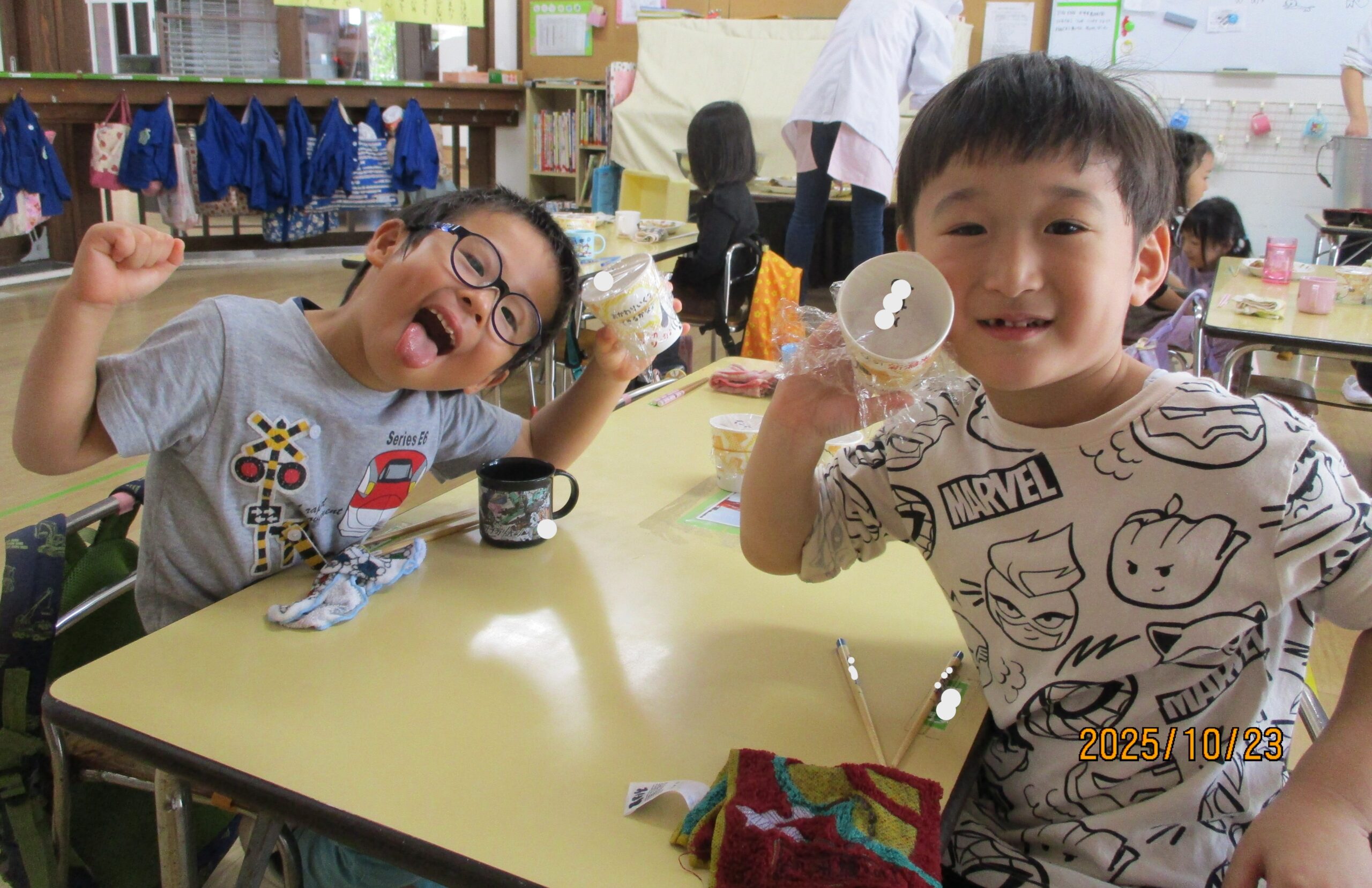 「しゃかしゃかおにぎり作り」をしました!紙コップの中にご飯を入れ、ラップをしてしゃかしゃか振るよ!あっという間にまーるいおにぎりに変身!