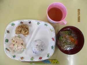 メニューは、「しゃかしゃかおにぎり(ゆかりごはん)・鶏のから揚げ・マカロニサラダ・野菜スープ」でした。
