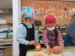 ~玉ねぎの皮むきです。~ 中々、皮がむけないなぁ。一枚いちまい剝がしていこうね!