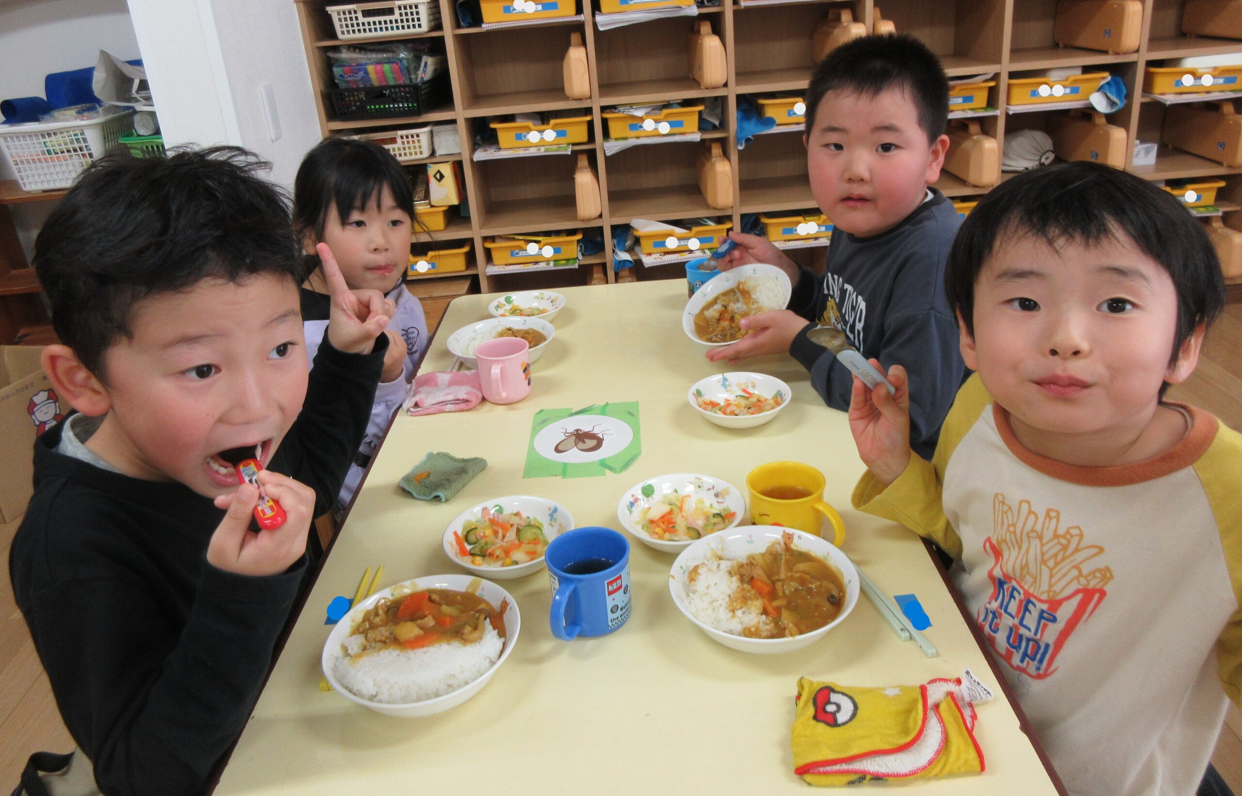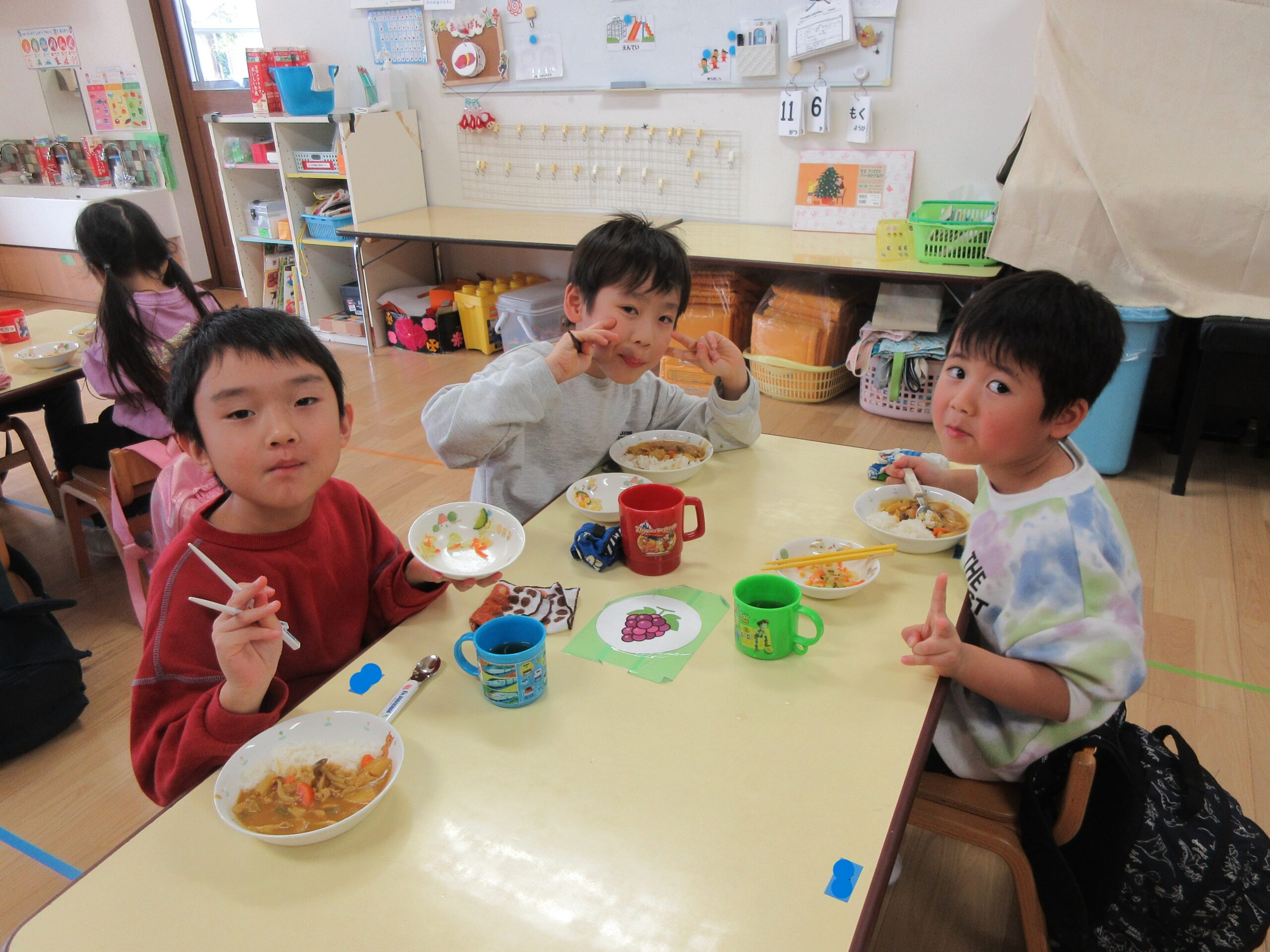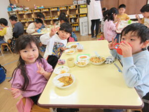 具材を切った後は、給食室の先生にお肉と一緒に煮込んでもらいました。給食の時間が待ち遠しく、「まだかな、まだかな?」「もうできたかな?」と給食室を覗き込んでいる姿が見られました。楽しみにしていた給食の時間です!「きのこのカレーとりんごのサラダ」を美味しくいただきました。