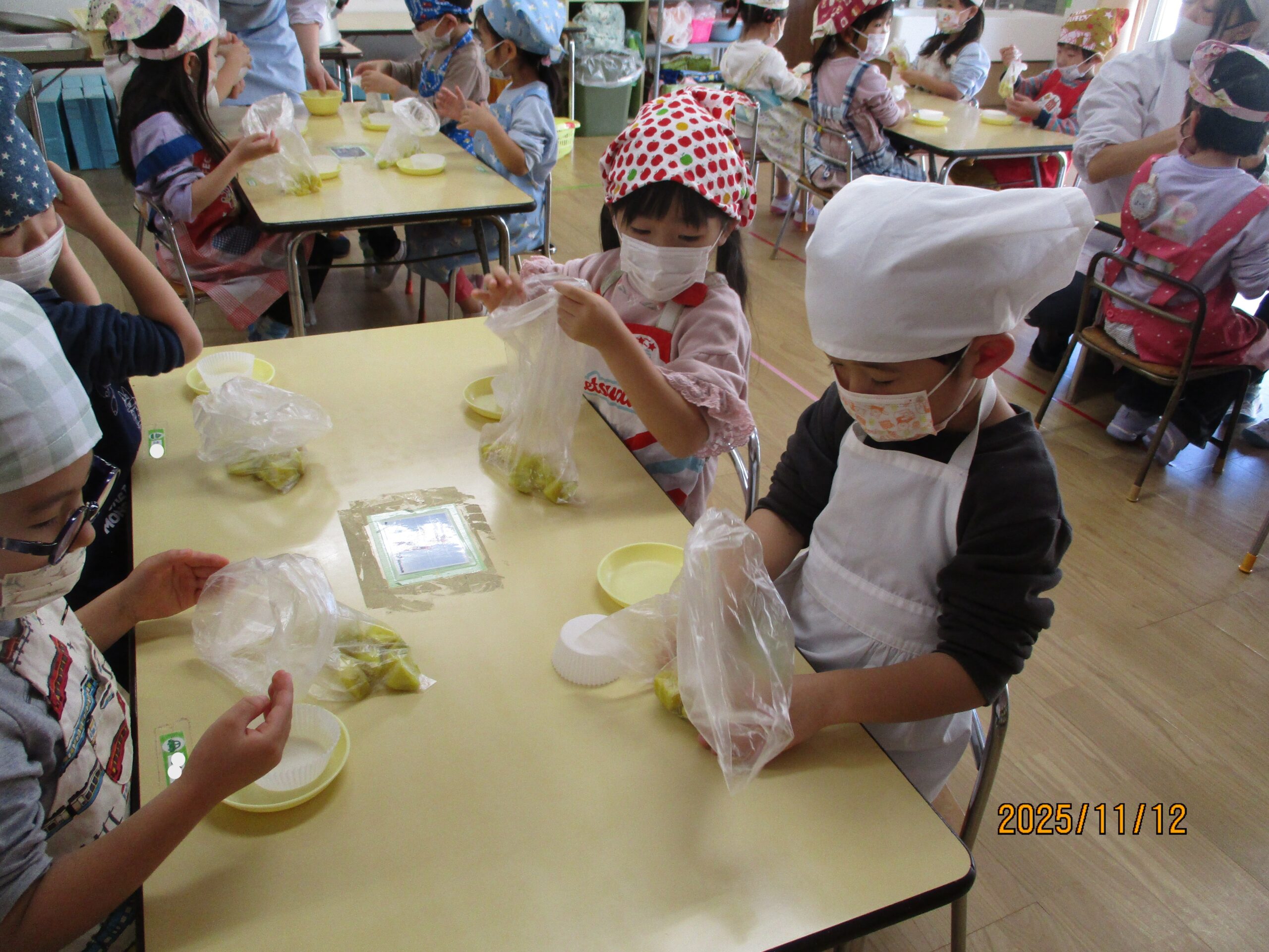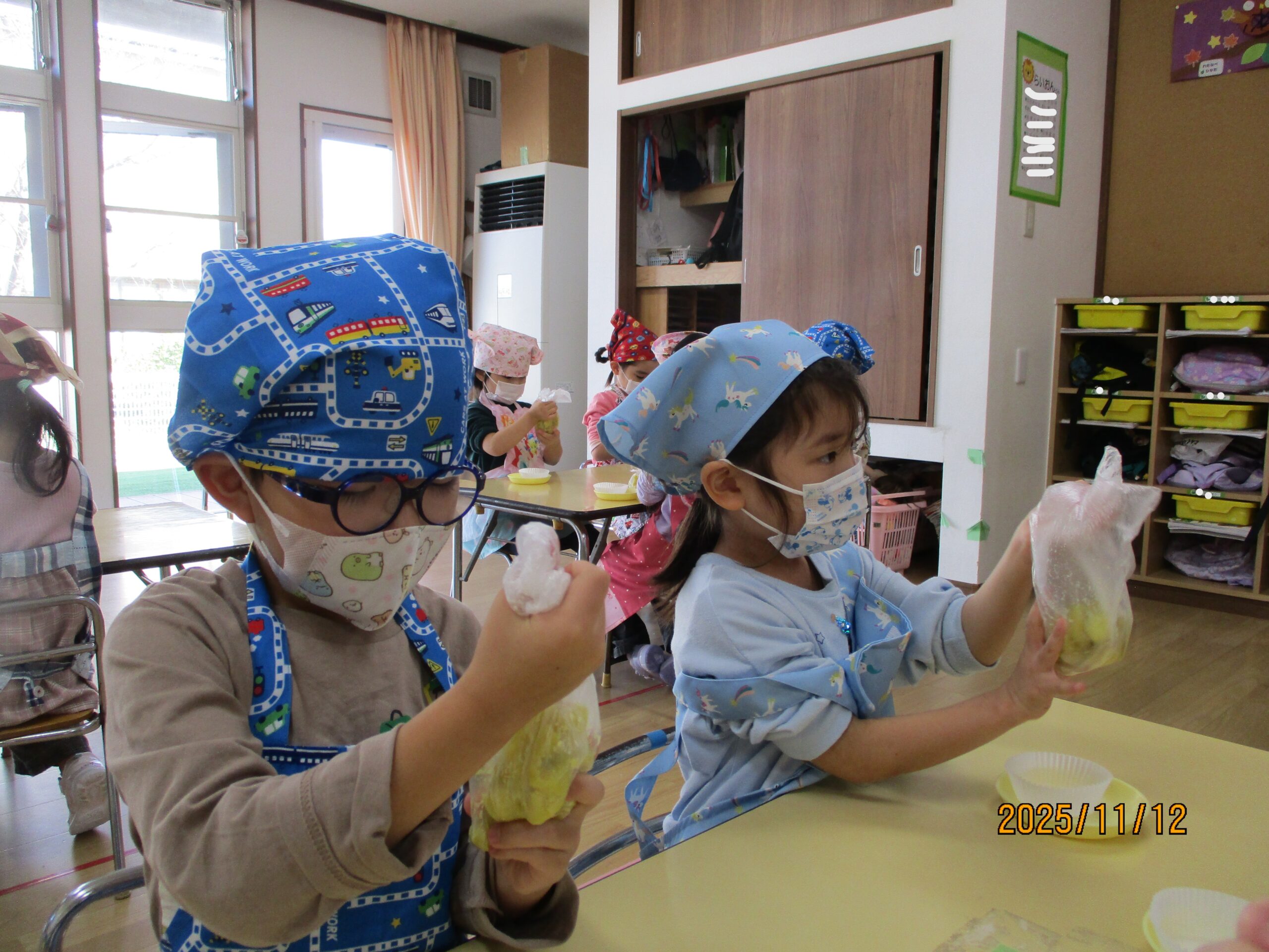 11月12日(水) ~スイートポテト作り~ らいおん組 今日は、らいおん組がスイートポテト作りを行いました。園で収穫したさつま芋とやまゆりさんからいただいたさつま芋です。ビニール袋に蒸したさつま芋、砂糖、牛乳を入れ、袋を優しく揉んでスイートポテトを作ります。さつま芋の固まりがないように優しく揉みます。優しく揉むと滑らかなトローリとしたスイートポテトができるよ!「よいしょ、よいしょ」「おいしくなぁれ!」と掛け声をかけながら作っていたのは、Aさん。「お芋の匂いがほんとにするー!!」とkさん。楽しい活動の時間でした。