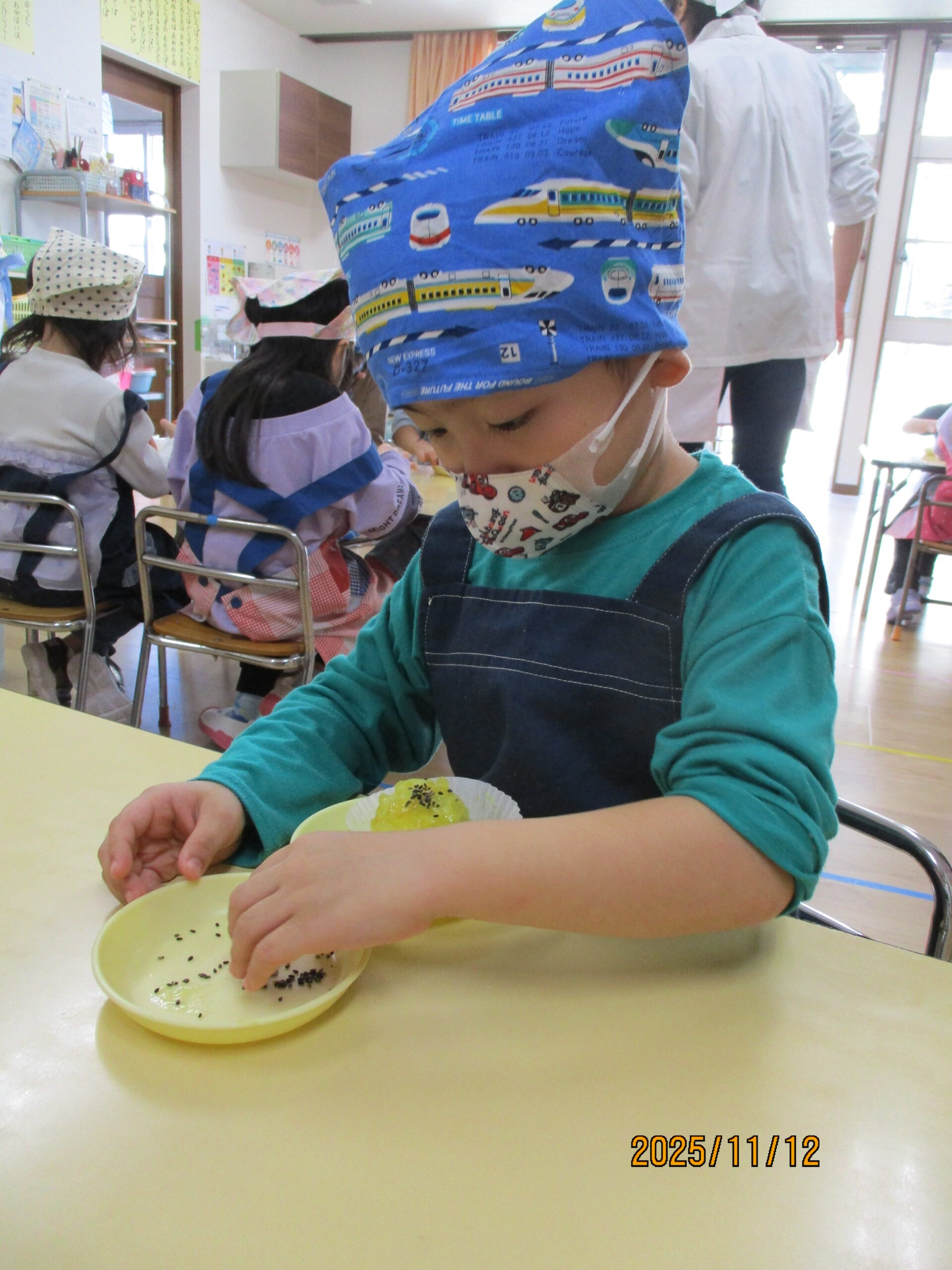 潰したさつま芋は、丸い形にして、ジャムを塗ってゴマをかけて出来あがり!最後の仕上げは、給食の先生にお任せしました。