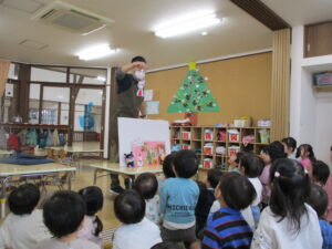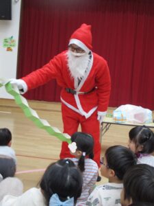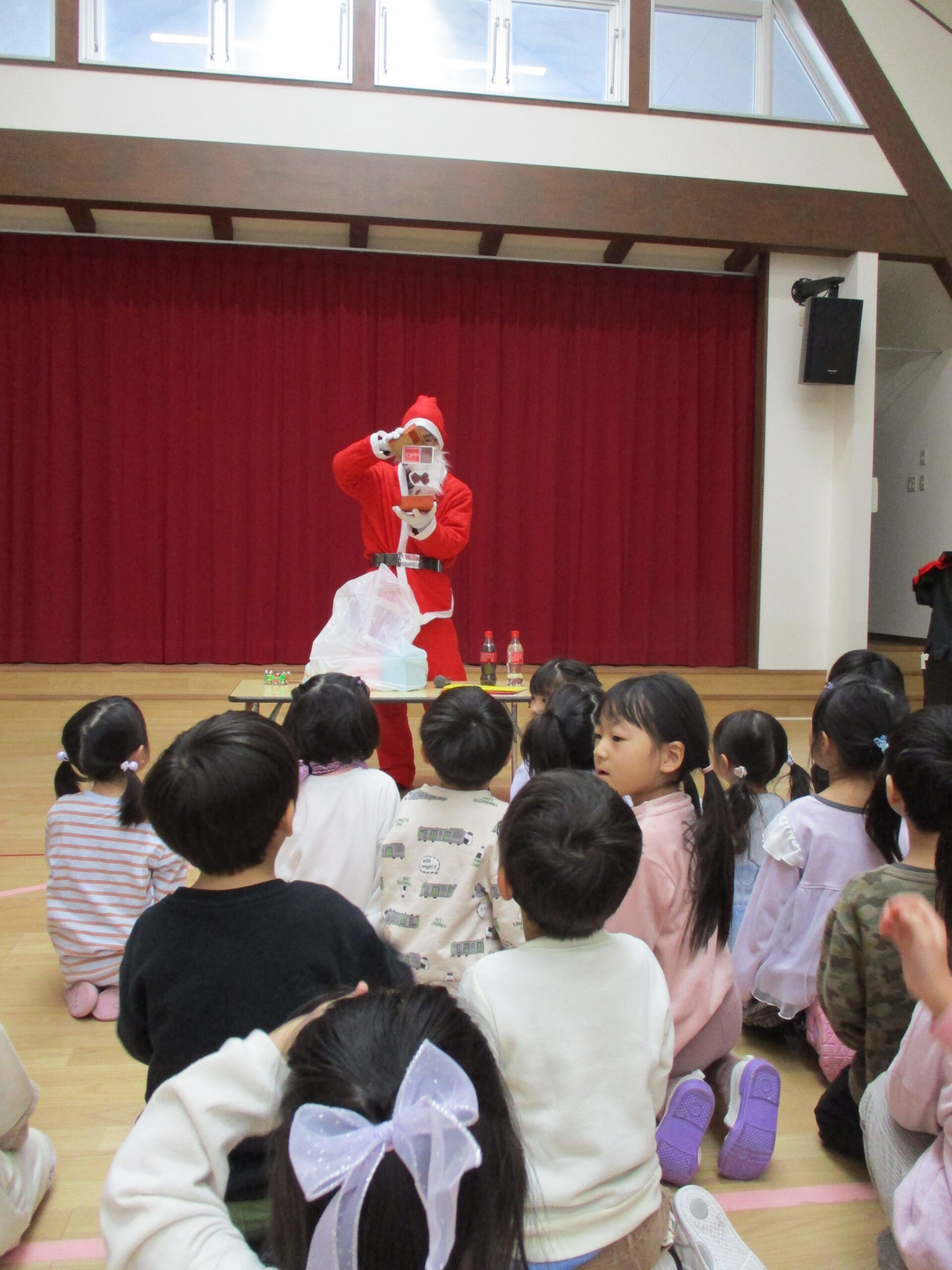 3歳以上児ー先生からのお楽しみは、「サンタさんからのマジック」でした。透明のコーラに色が付いたり戻ったりすると、「なんで~?」「どうして~?」「すごーい!」と子ども達。プレゼントの箱からは、色んな物が出てきて目が釘づけ。一足早いサンタさんのマジックを楽しんで見ていた子ども達でした。