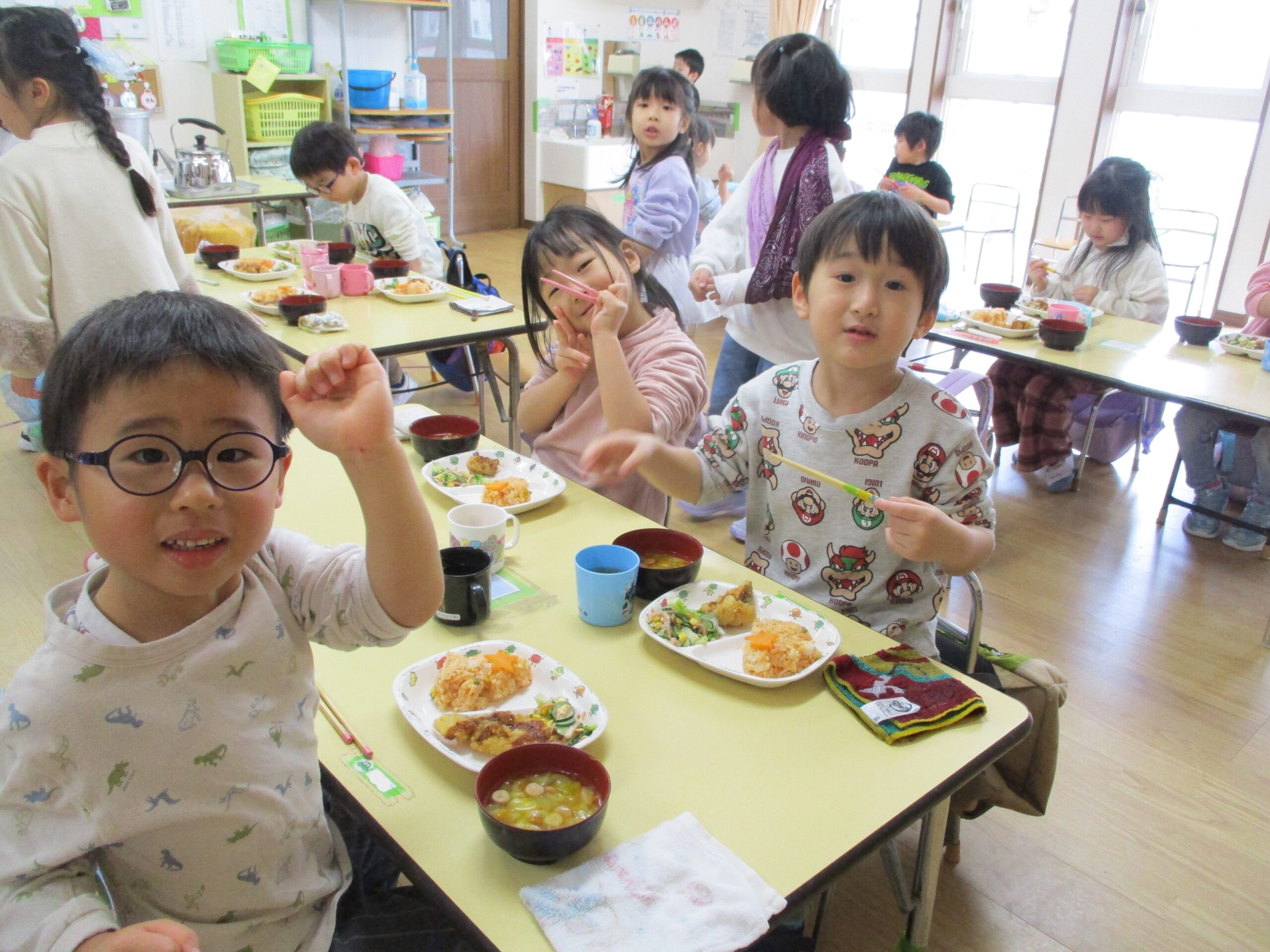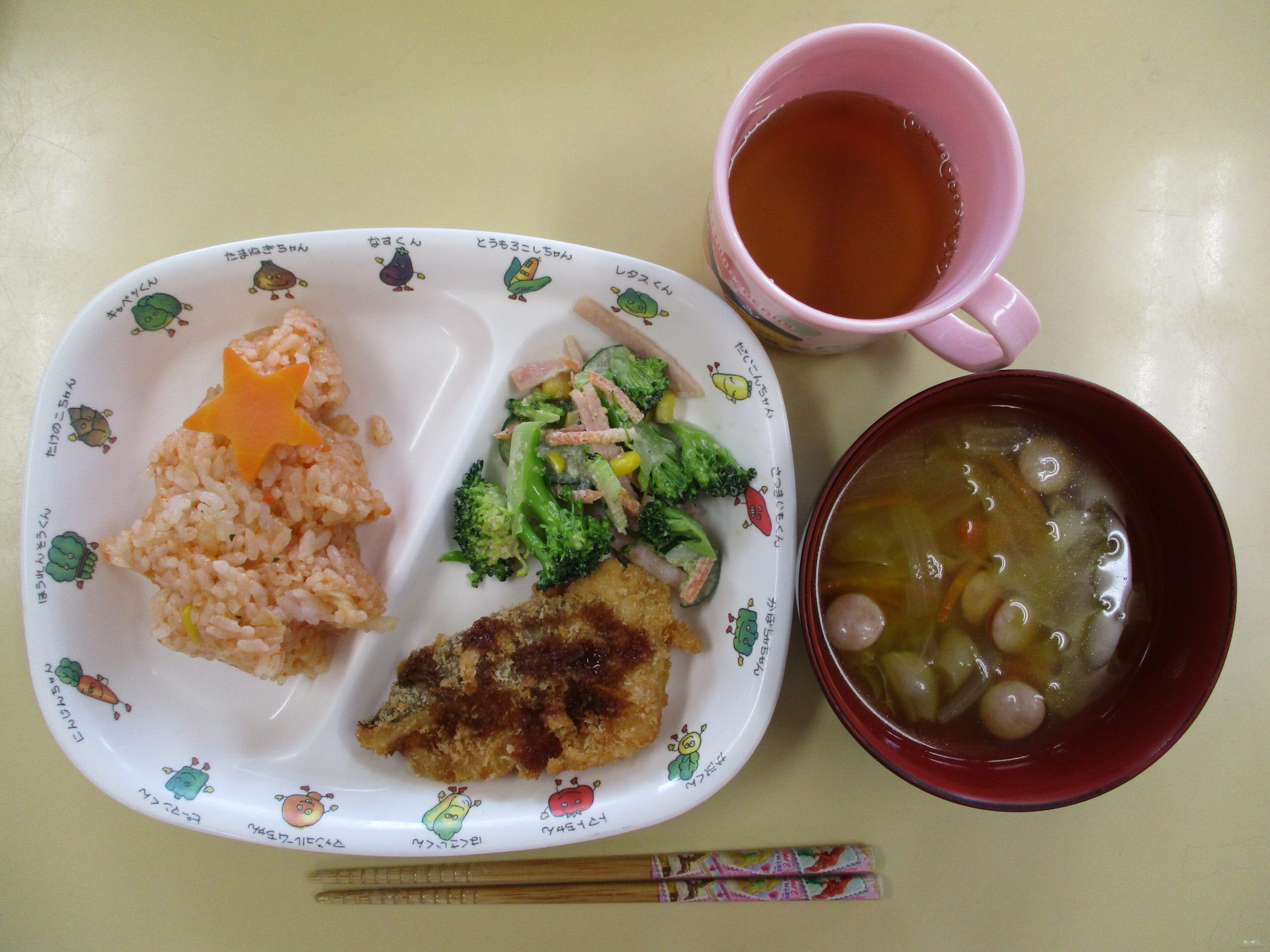 ~給食の様子~ メニューは、「チキンライス・白身魚のフライ・ブロッコリーサラダ・かぼちゃのスープ」でした。美味しかったよ!
