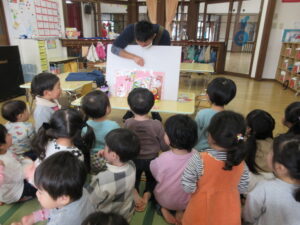 未満児ー先生からのお楽しみは、「アンパンマンのクリスマスパーティー」のパネルシアターでした。窓から誰かやってきたよ!誰だか分かるかな?カレーパンマン・しょくぱんまん・釜めしどん等など、子ども達の大好きなキャラクターがたくさん出てきて、大喜びでした😊