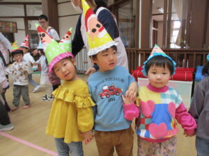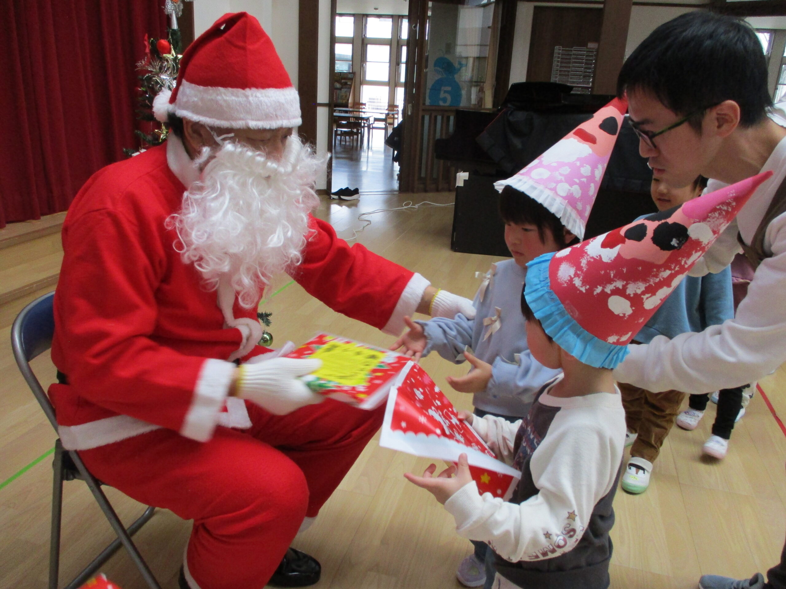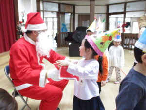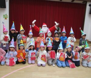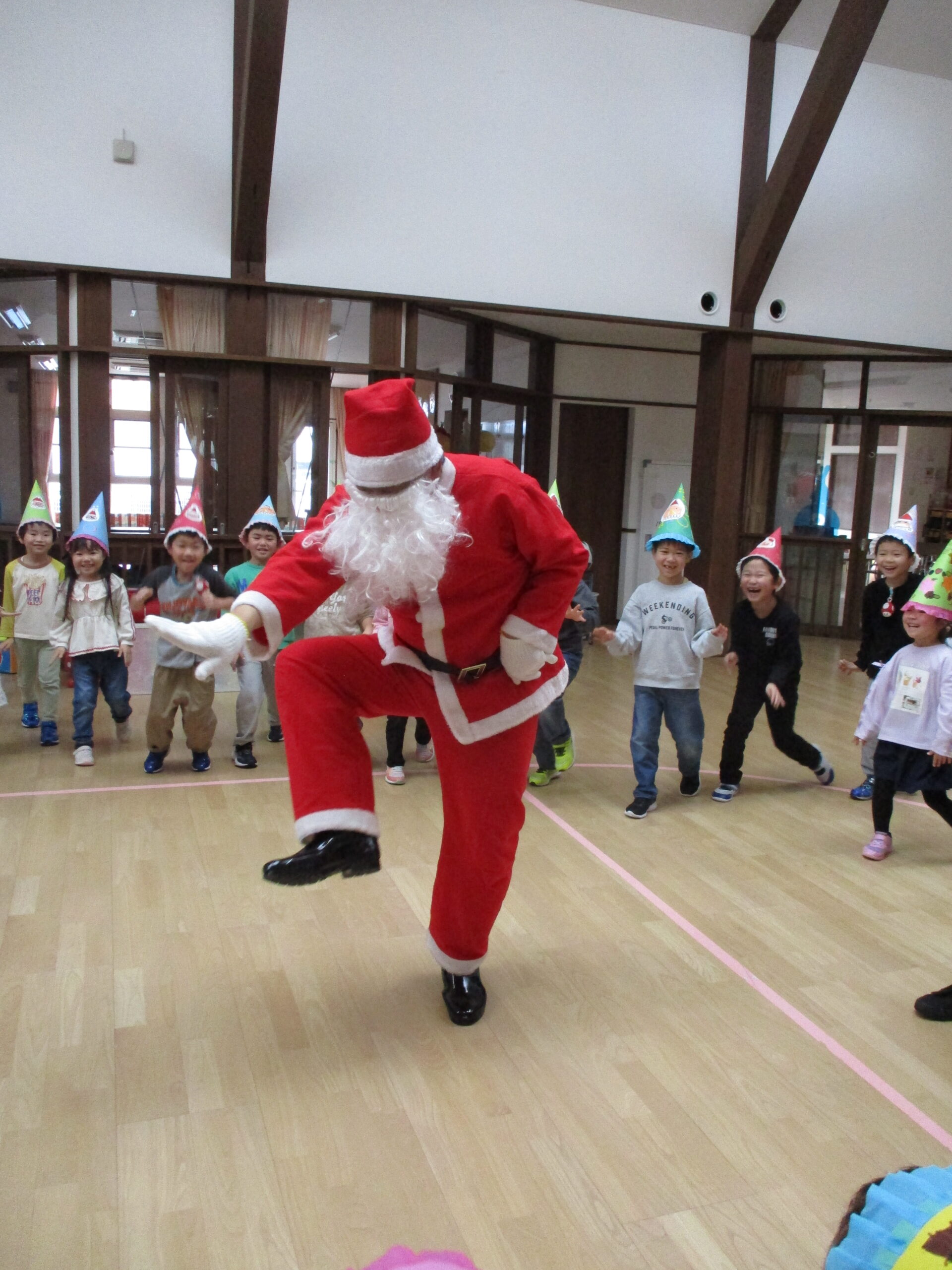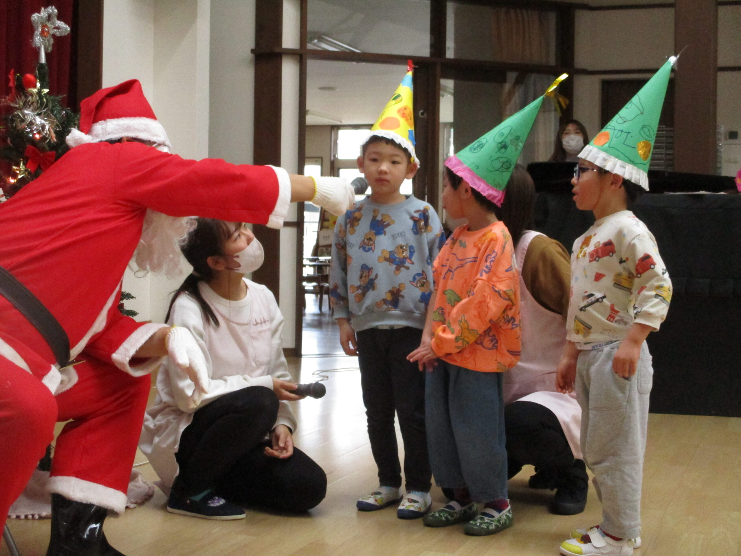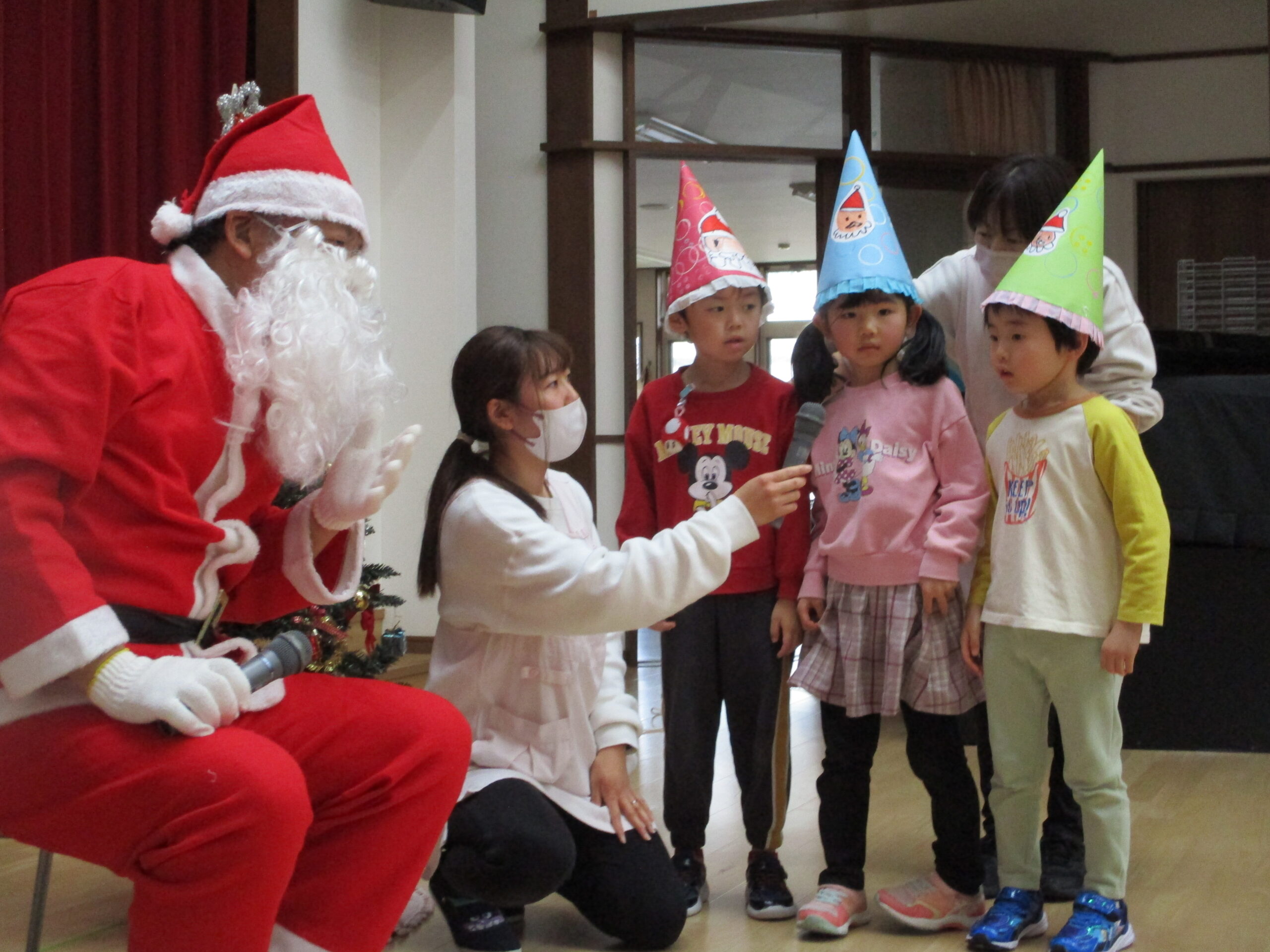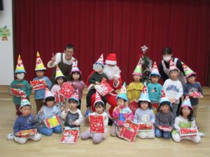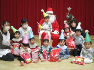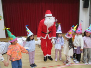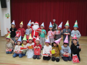 歌をうたったり、サンタさんに質問をしたりしました。「サンタさんの服は、なんで赤いの?」「子ども達の温かい気持ちと素直な気持ちを願っているからだよ!」「どうやってプレゼントを作っているの?」「プレゼントは、世界中の大人たちが子ども達の笑顔を思い浮かべながら作っているんだよ!大人の気持ちがたっぷり入ったプレゼント、それを一人ひとり何をあげるかを決めて運んでいるのがサンタさんなんだよ!