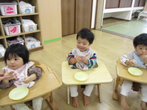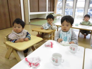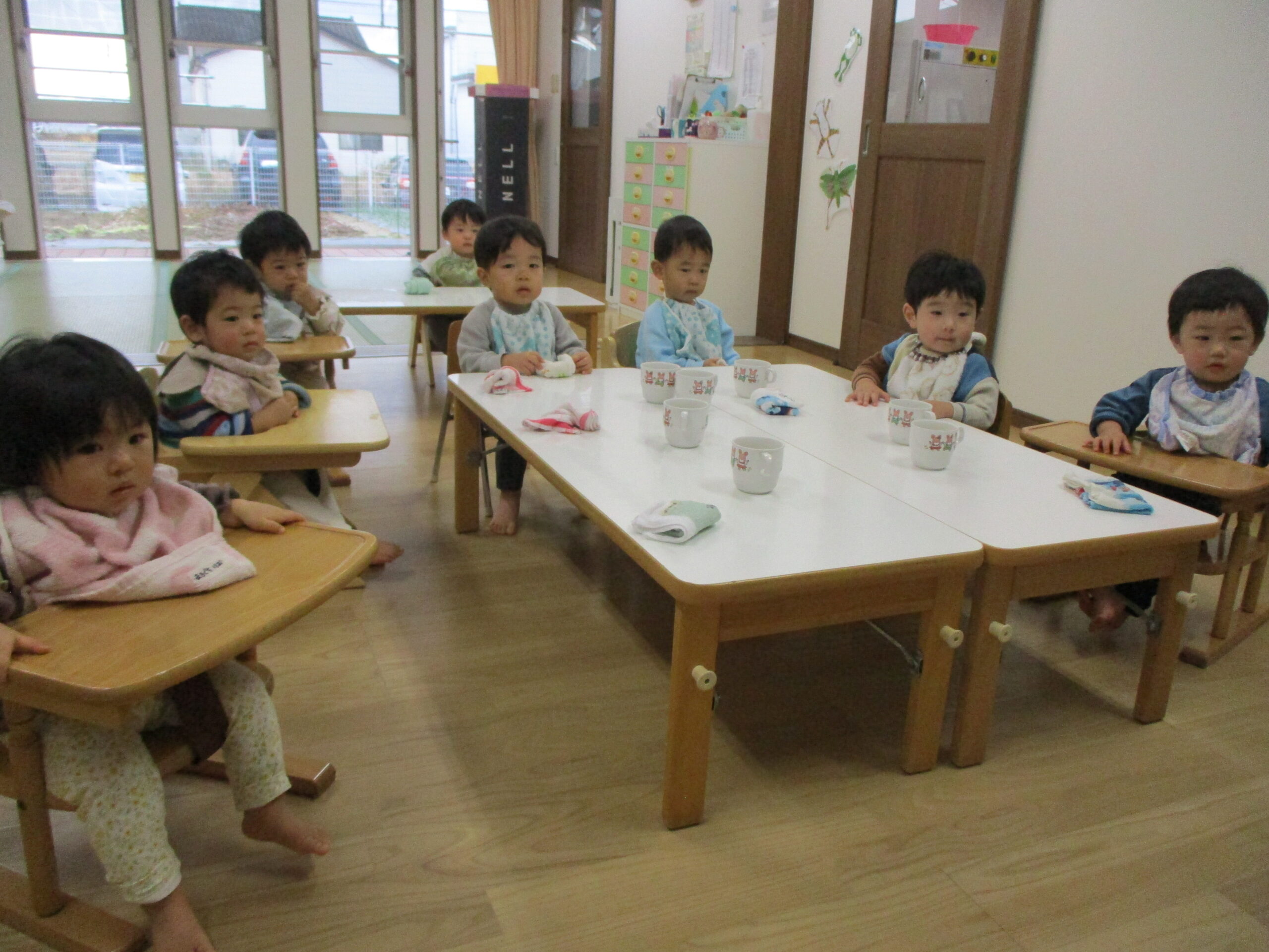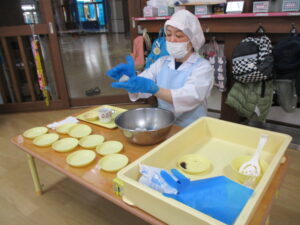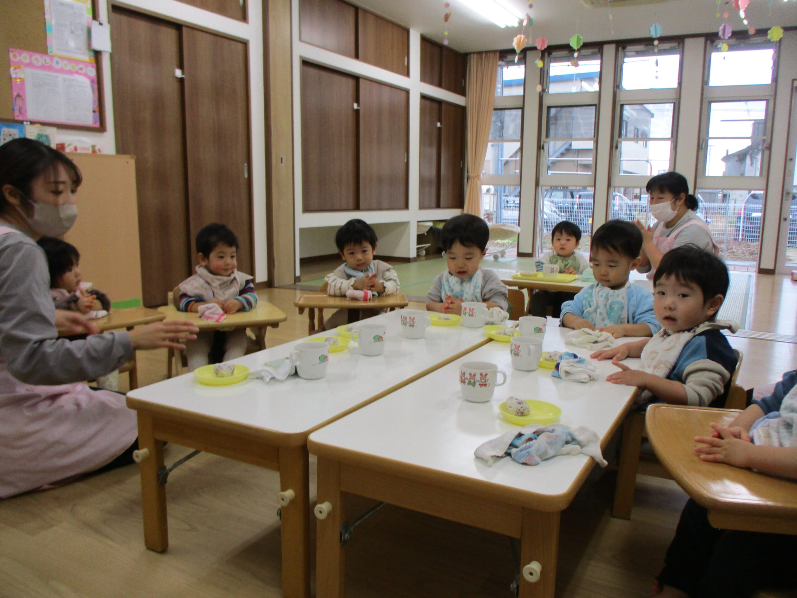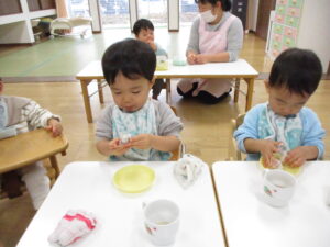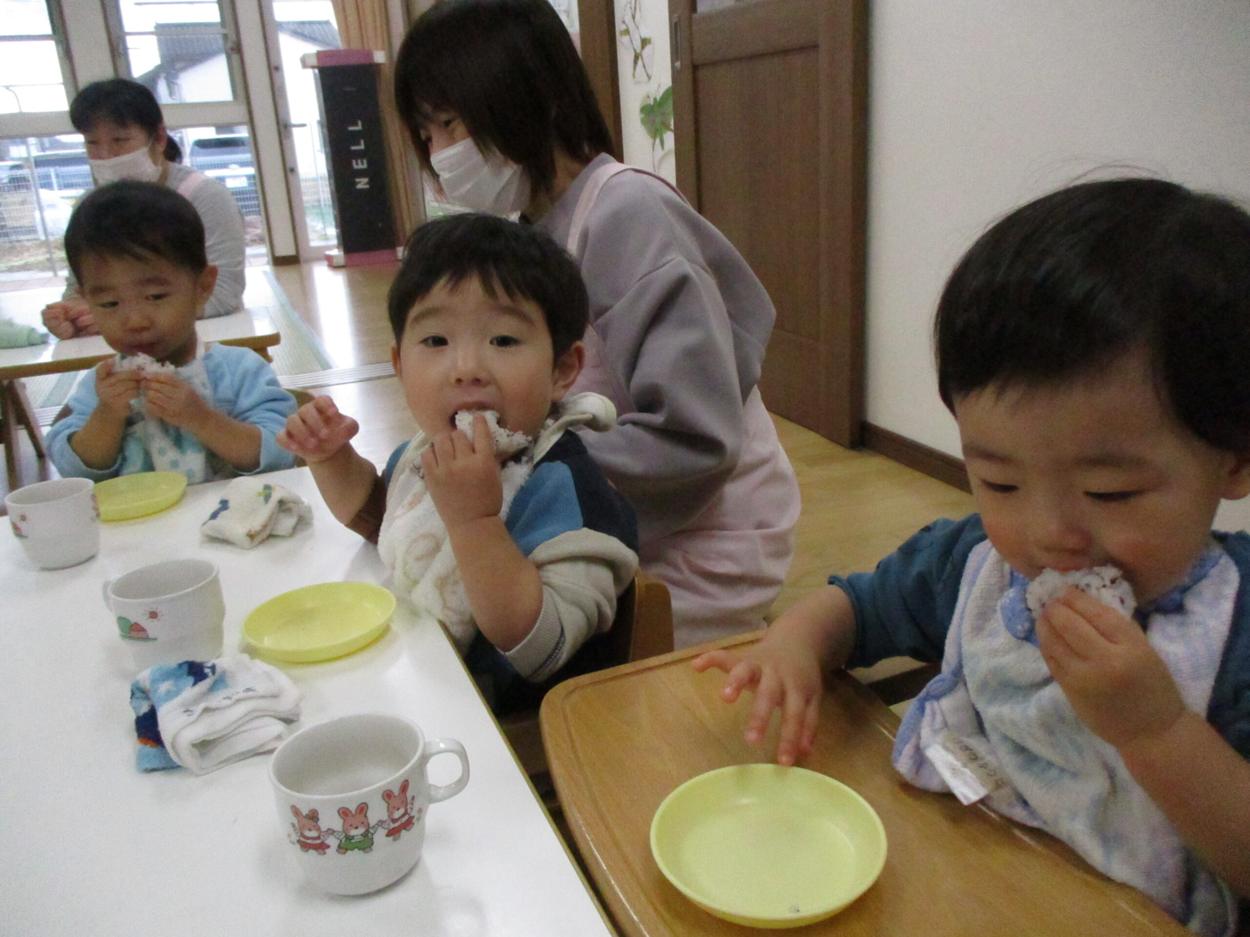 12月8日(月) ~おにぎり屋さん~ ひよこ組 給食の先生が、おやつのおにぎりを子ども達の前で作ってくれました!