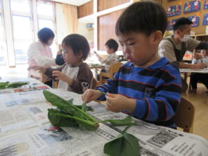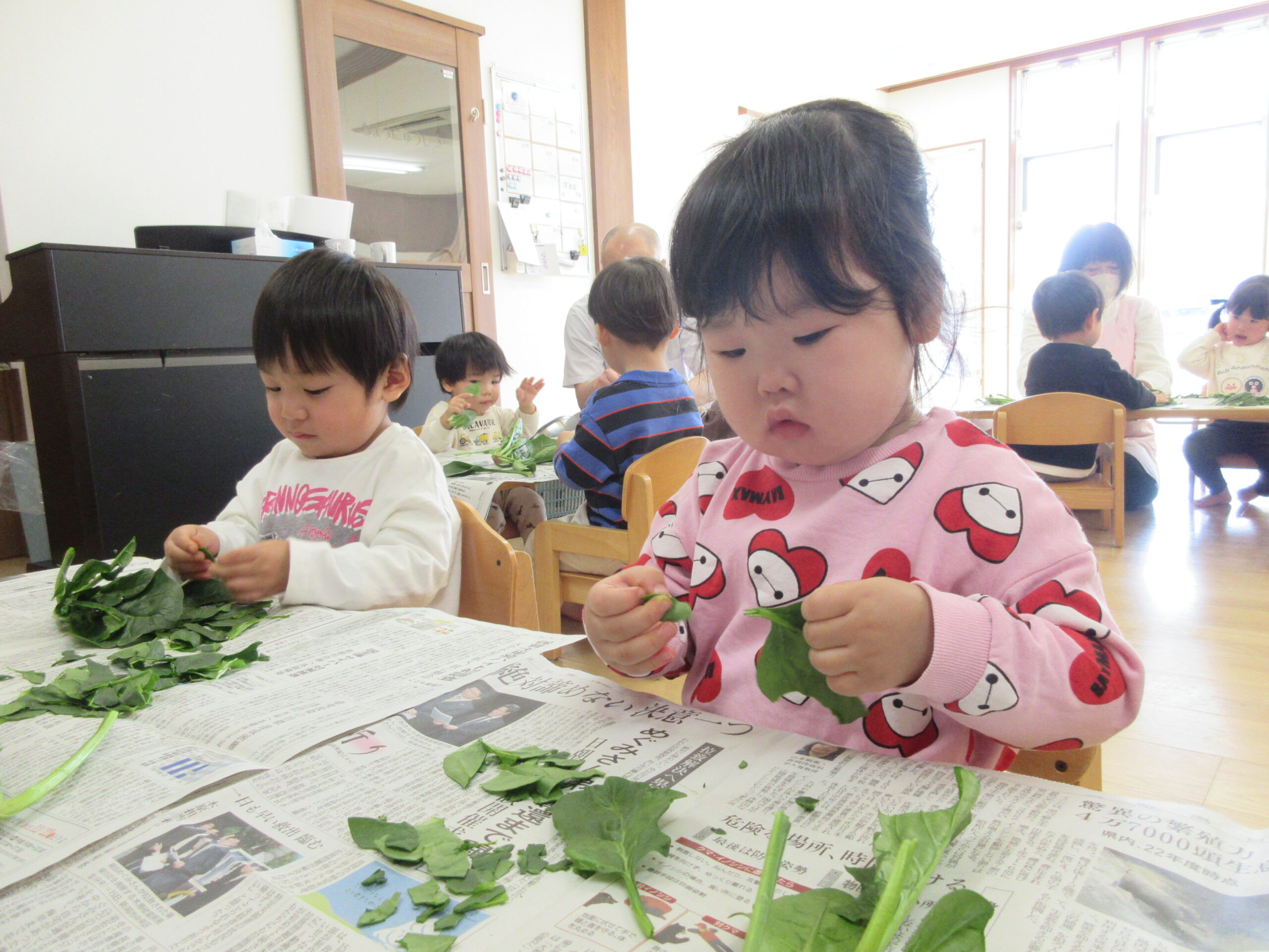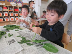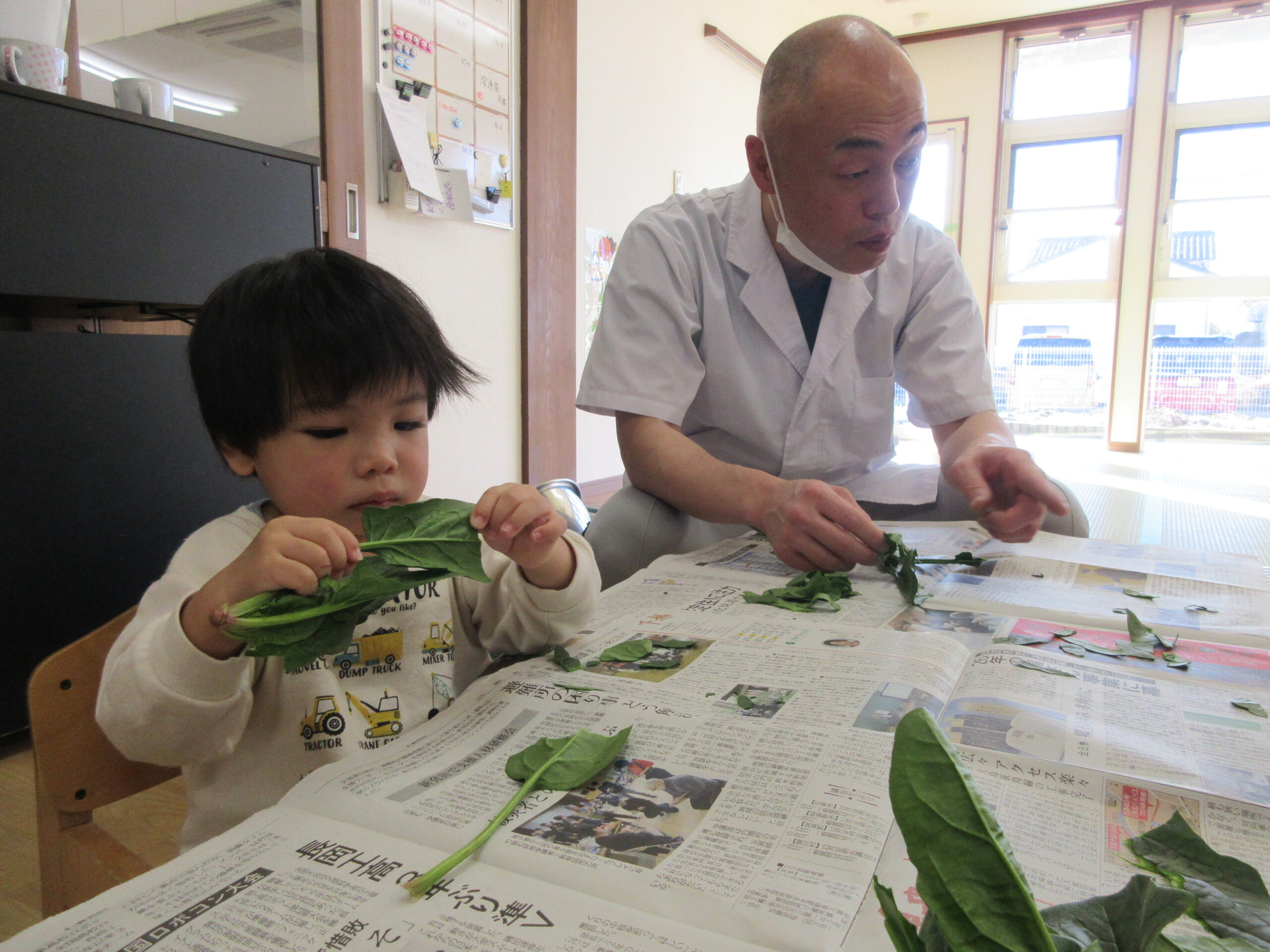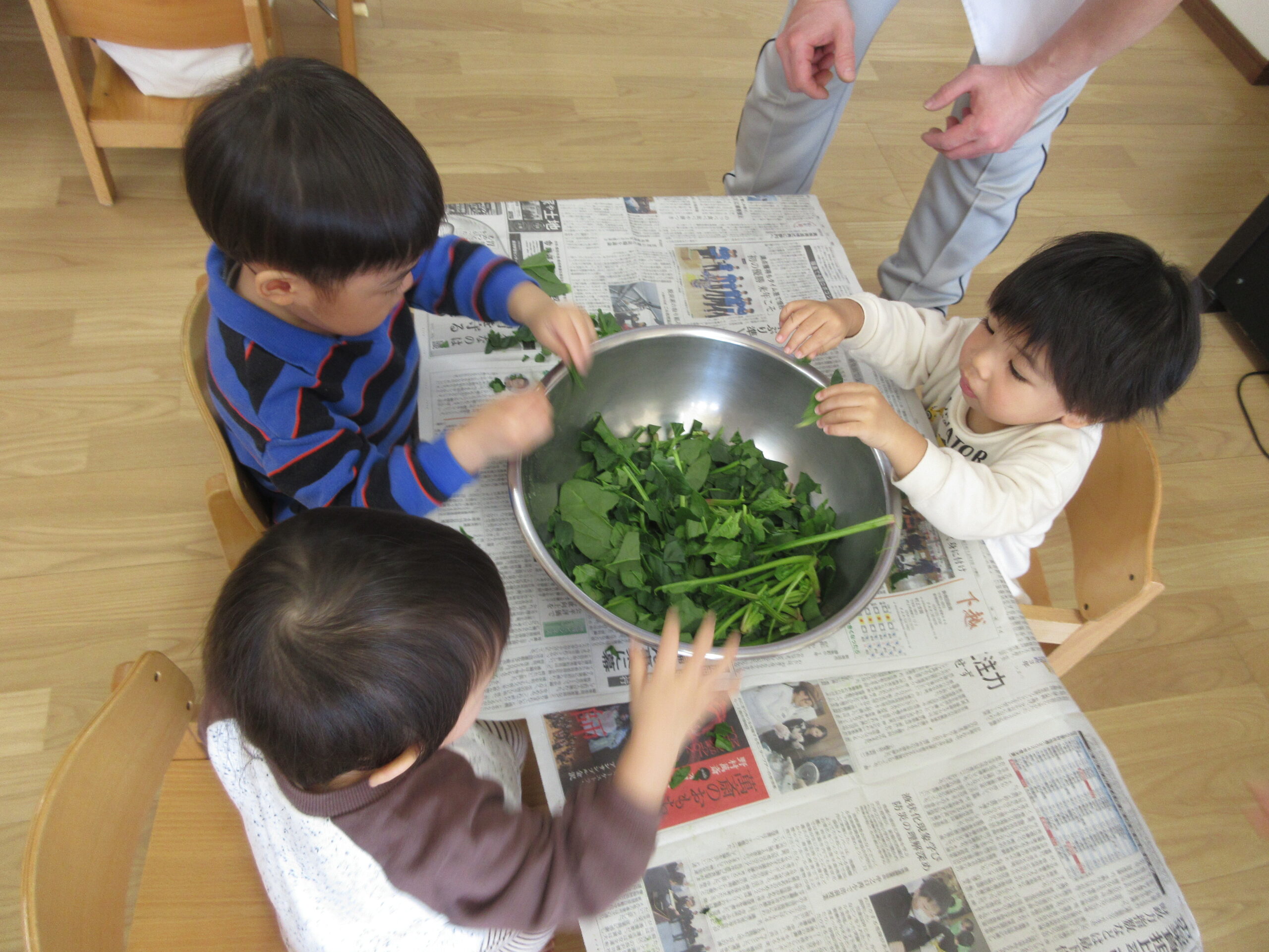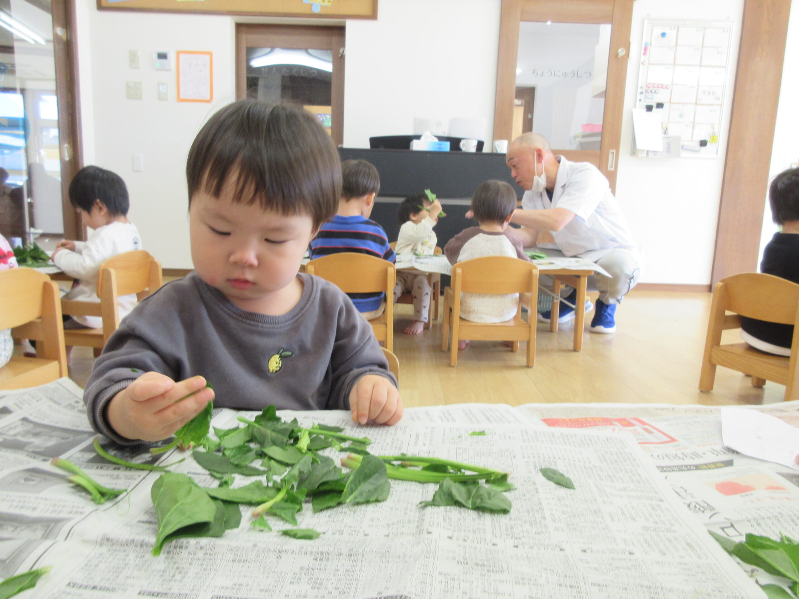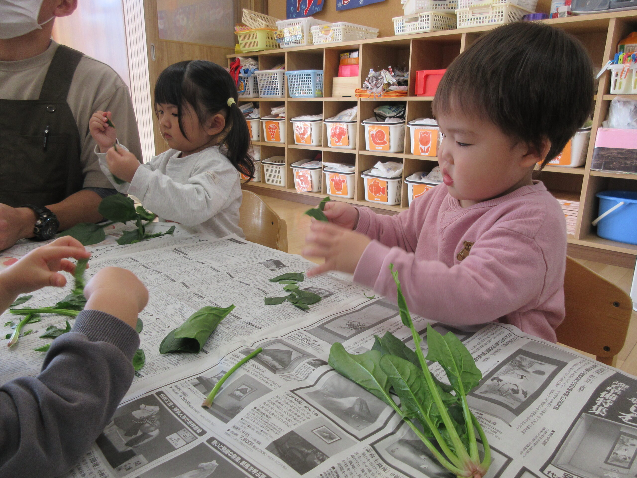12月11日(木) ~ほうれん草の葉っぱちぎり~ すずめ組 ほうれん草を手でちぎってみました!