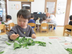 緑の葉っぱをじーっと見たり、触ったり匂いをかいだり。手先を使って、葉っぱをちぎりました。