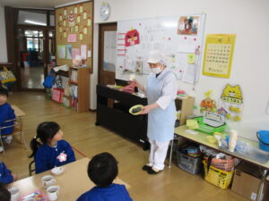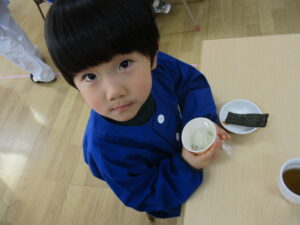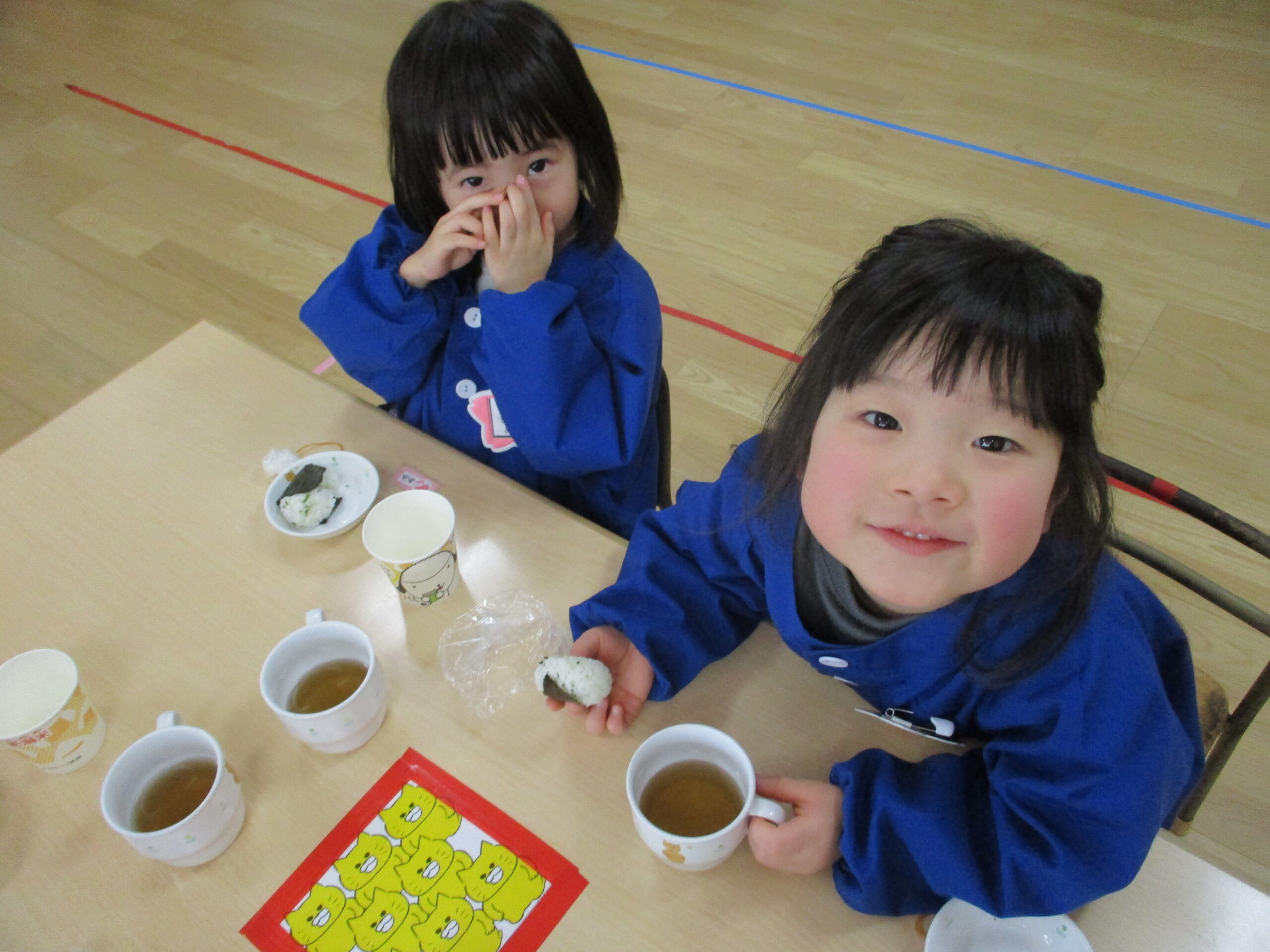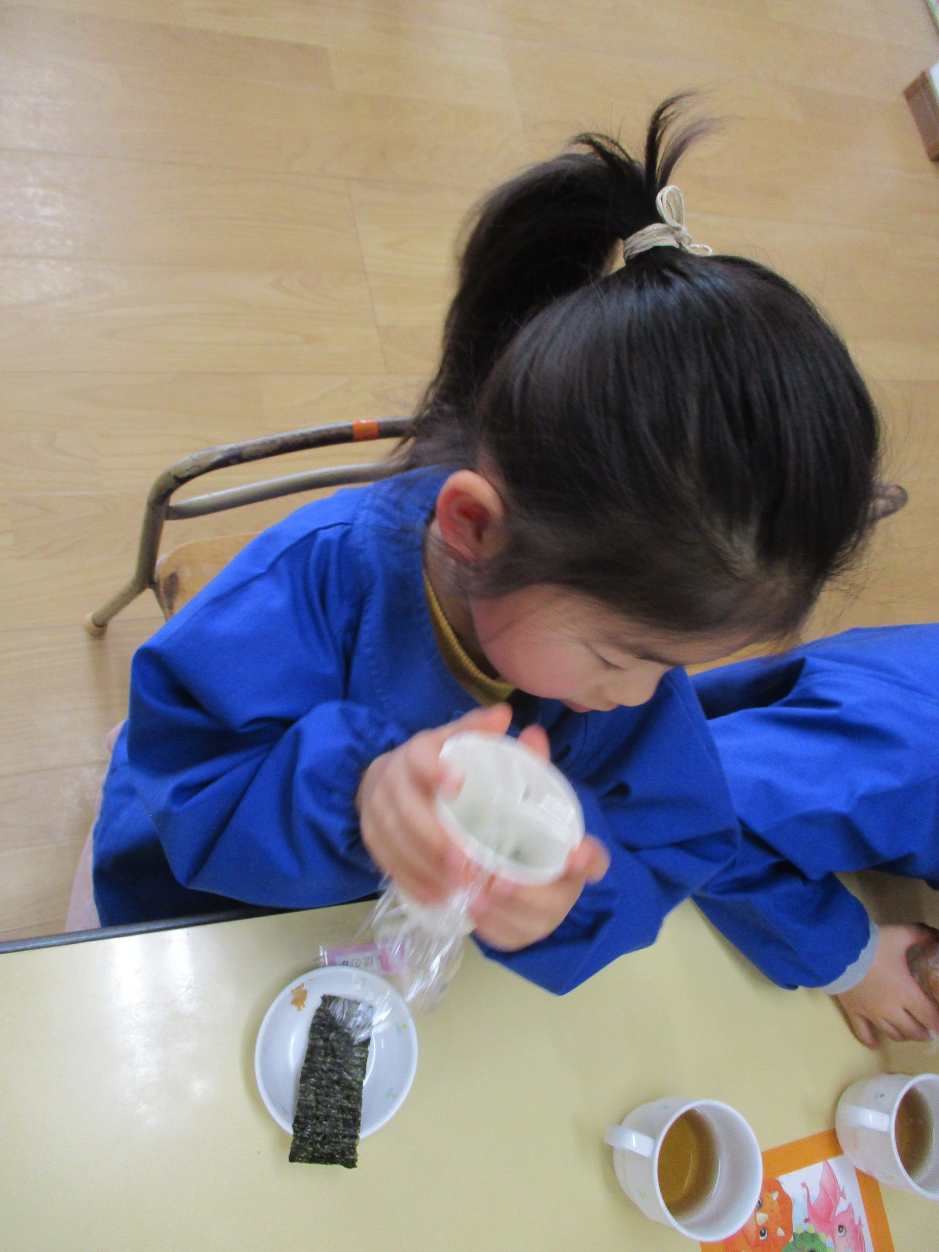 1月19日(月)うさぎ組 「おにぎり作り」 うさぎ組は、シャカシャカおにぎり作りをしました。