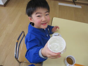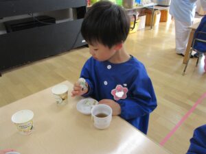 10月のお誕生会でも経験済みのシャカシャカおにぎり。紙コップにほっかほかのご飯を入れて、カップをシャカシャカ振ります。