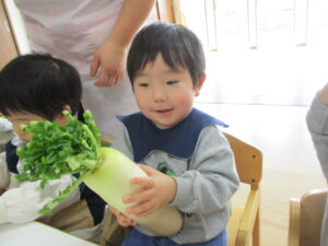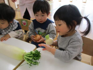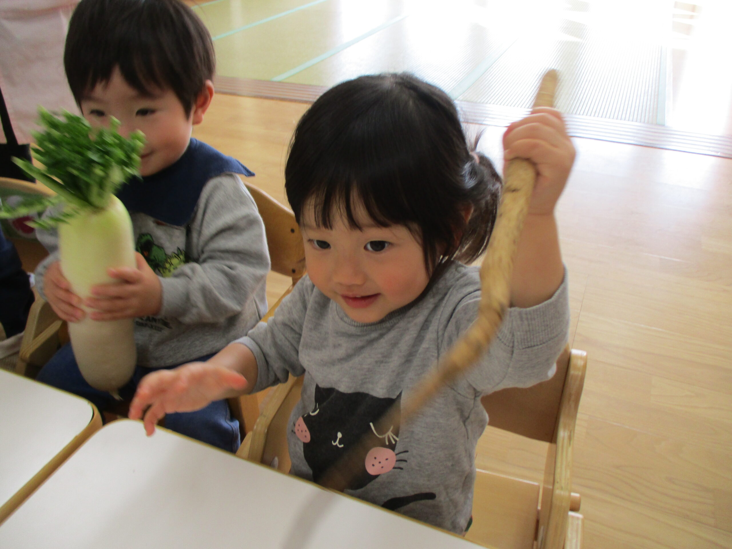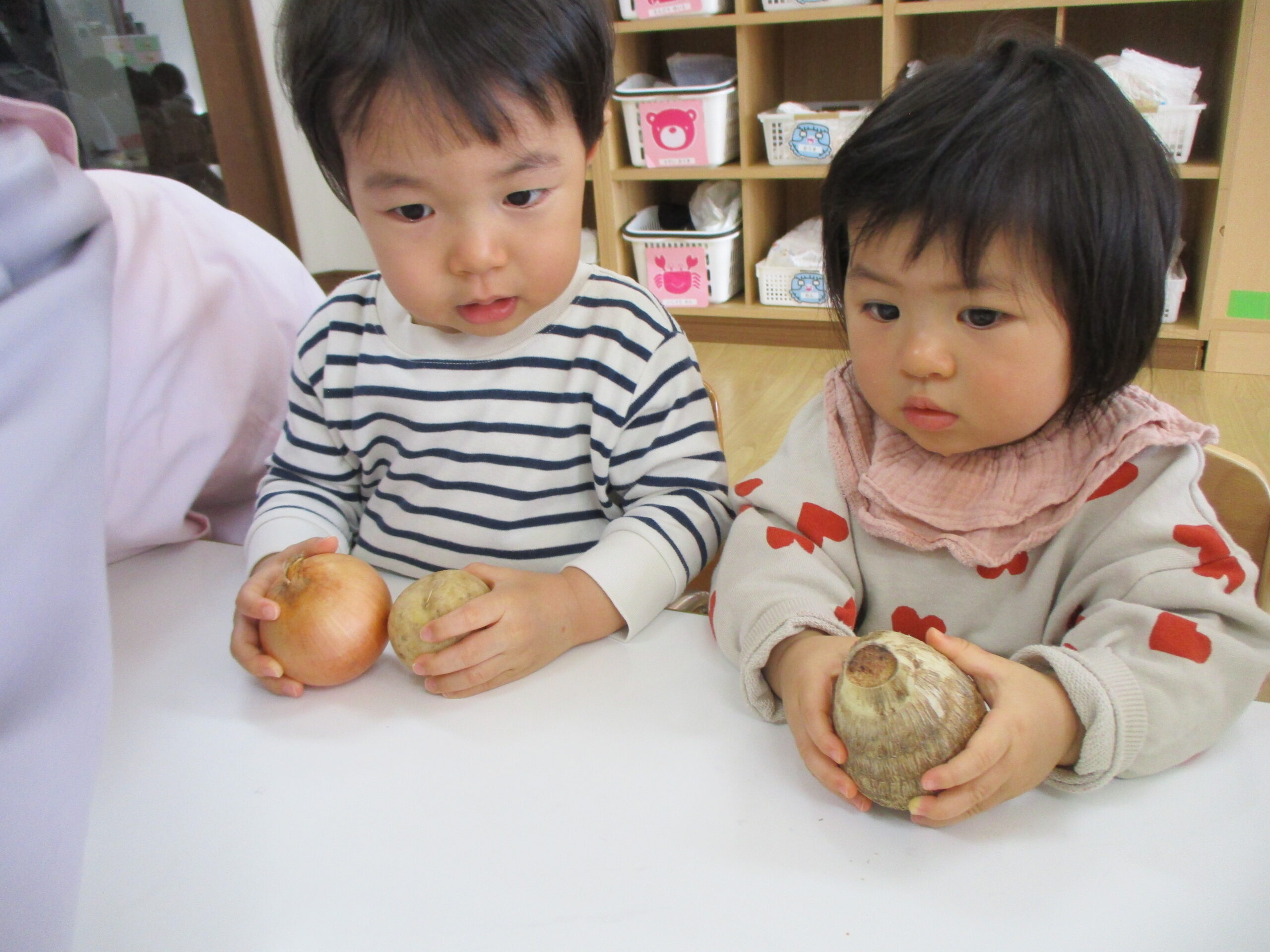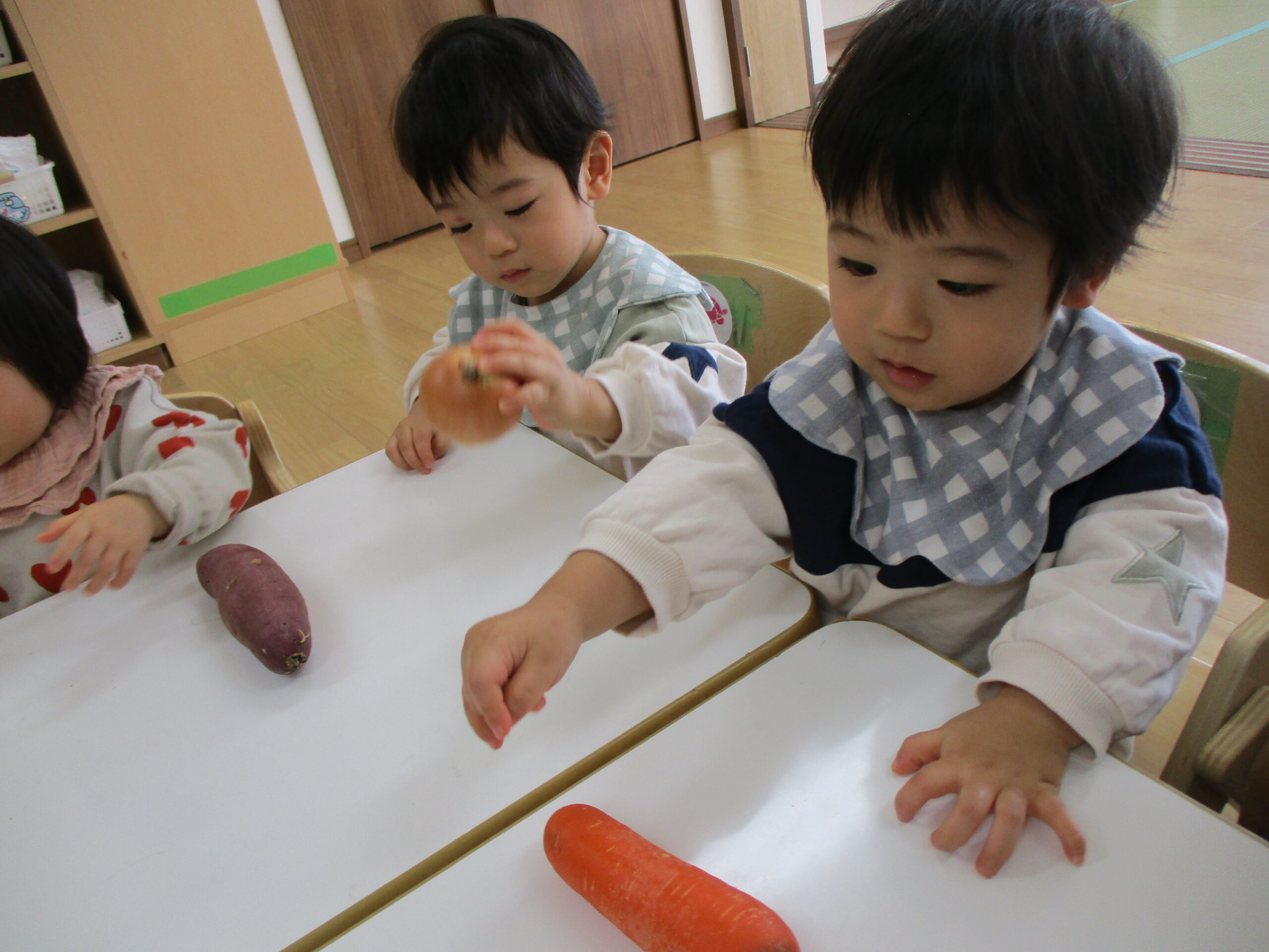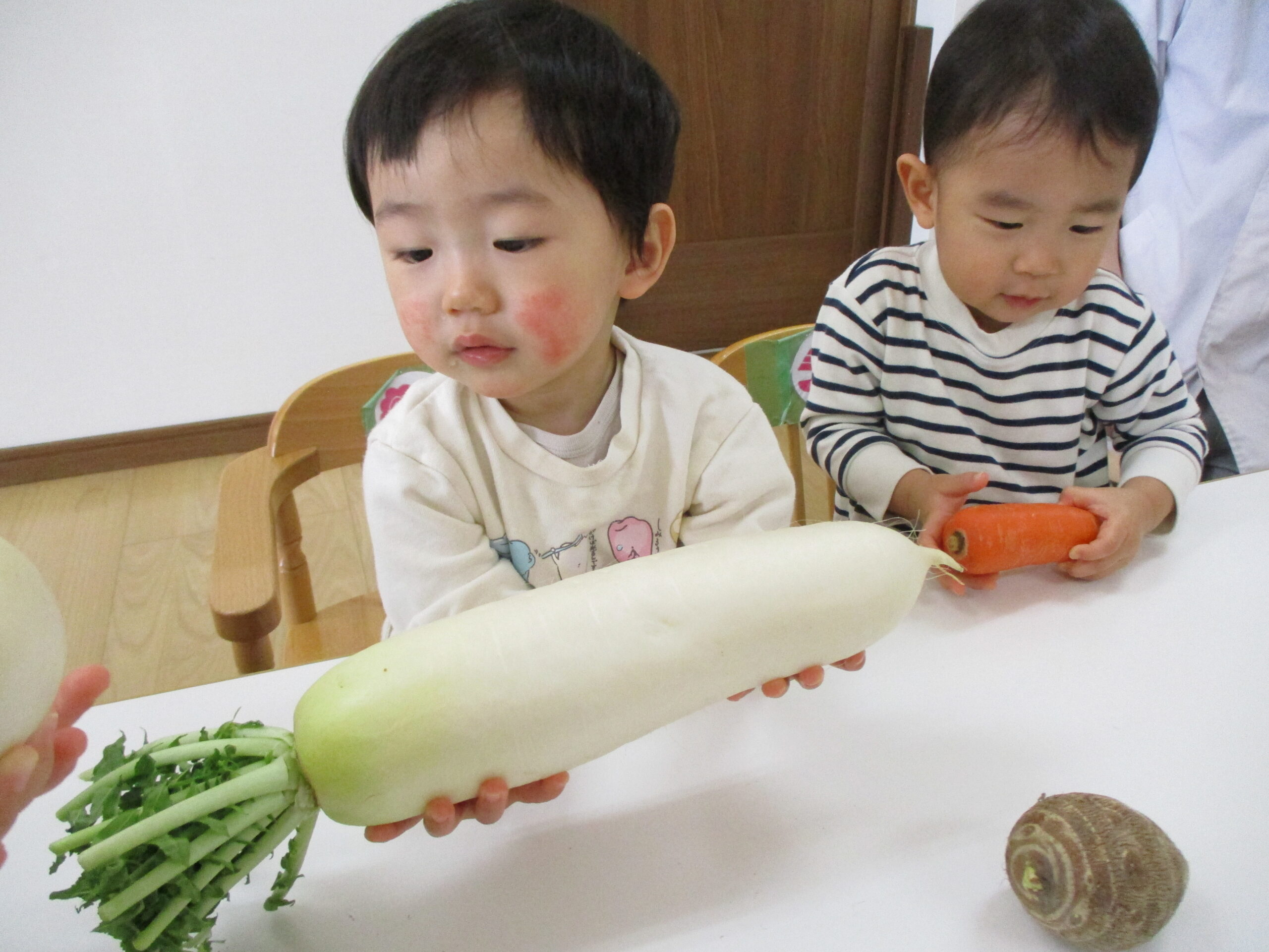 興味津々のひよこ組さん。「ながーい」「まるーい」「おもたーい」と持ち上げたり転がしてみたりと野菜の感触を確かめていました。