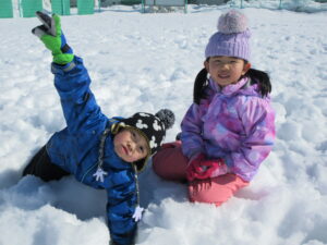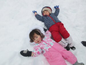 雪の上を歩いたり、寝そべったり、雪玉を作ったりして遊びました。にこにこ笑顔も見られるようになりました。