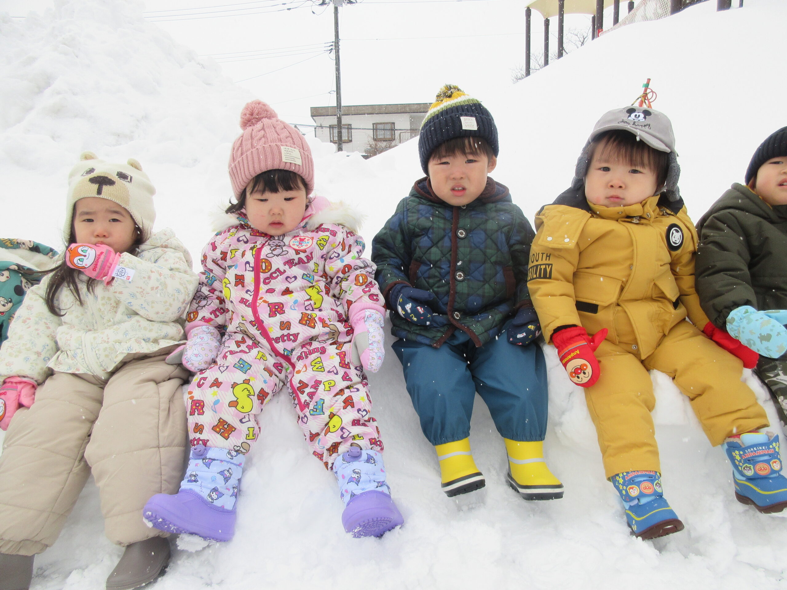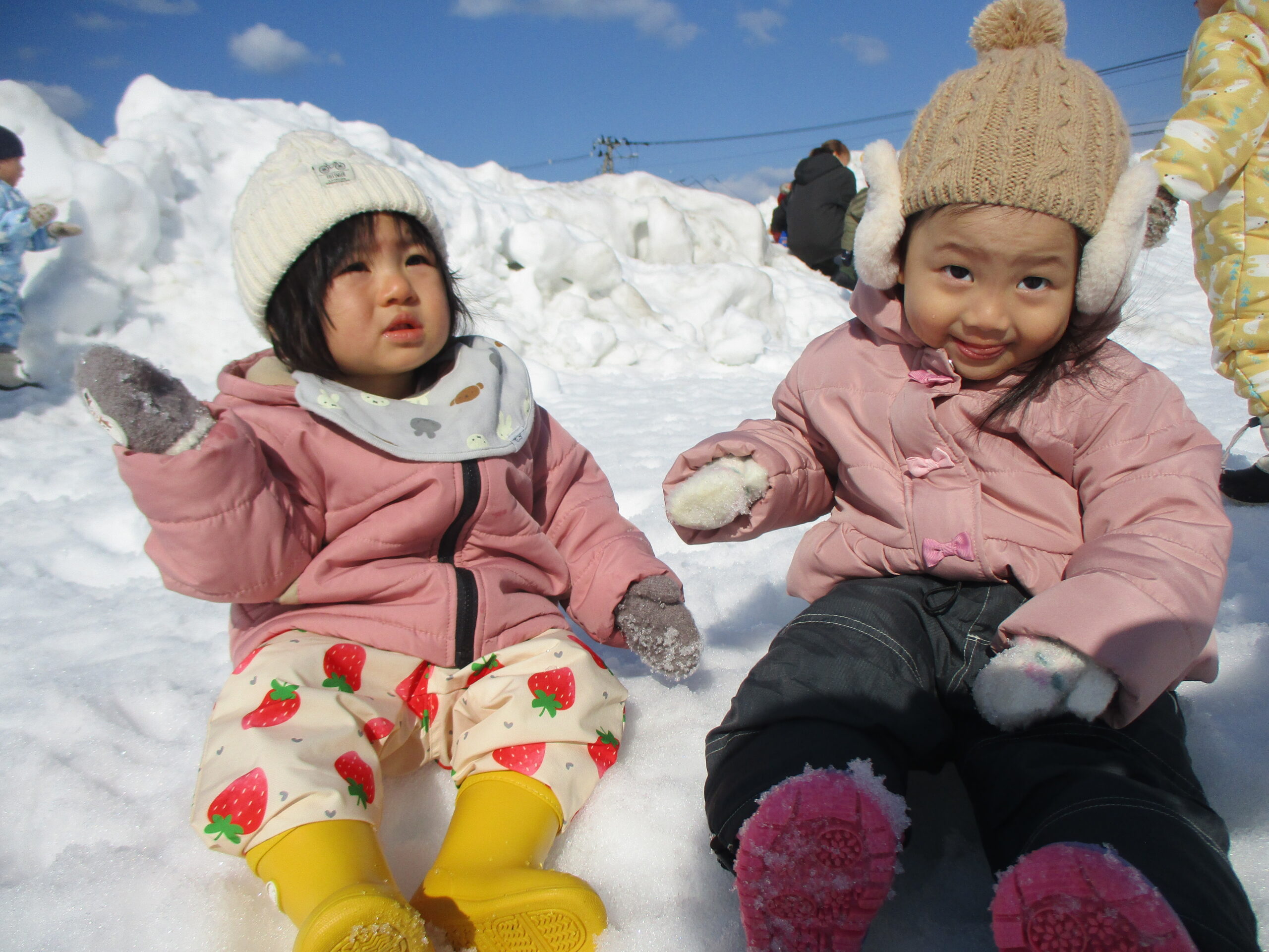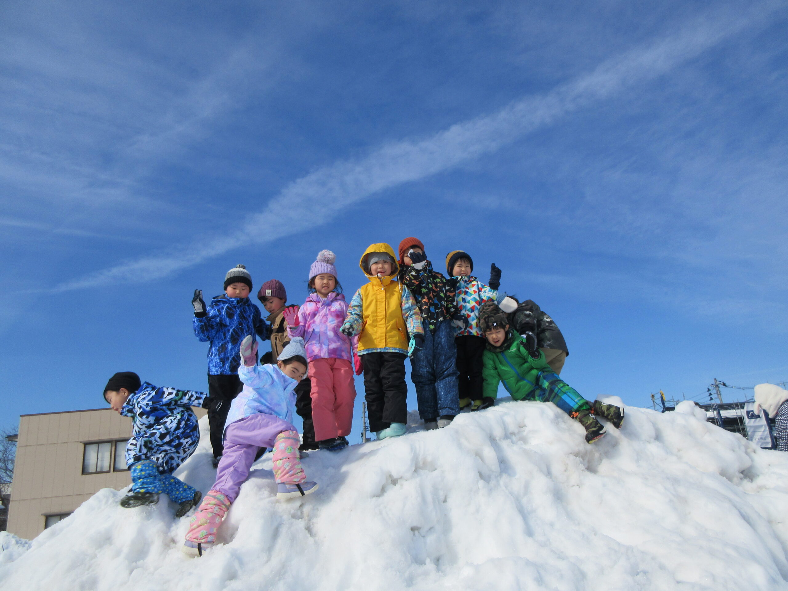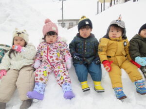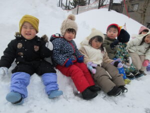 晴れ間を見て、雪遊びを楽しんだ子ども達です。小さいクラスのお友だち、初めは大泣きしたりびっくりしたり、涙が見られた子もいましたが、繰り返し遊ぶうちに楽しんで遊べるようになりました😊雪での遊びにも慣れてきたようです。
