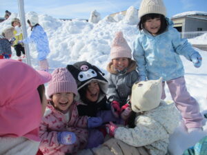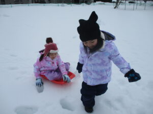 大きいクラスのお友だちは、ダイナミックに遊びを進めます。そり滑りをしたり、雪だるまを作ったり、雪の上で鬼ごっこをして駆け回ったりしました!