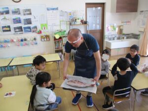普段の給食は、すでに調理されていて切り身になっていますが、今日は実物の鯛を見て、その大きさにびっくりの様子でした!!