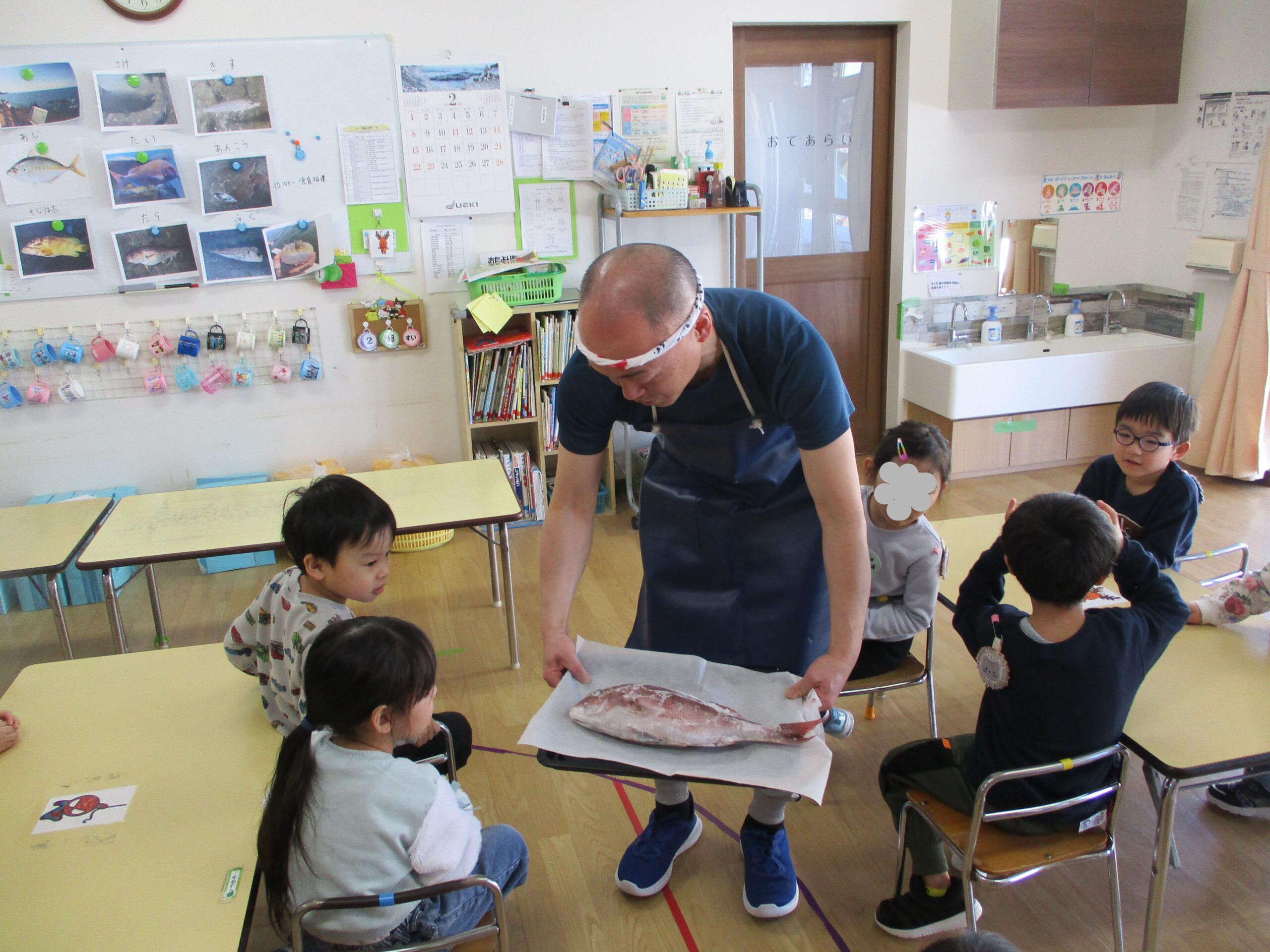 2月18日(水) らいおん組 「柏崎でとれる魚の紹介」  柏崎でとれる魚について学びました。 たい・あんこう・ふぐ・たら・あじ等など、柏崎では色んな魚が獲れることを知りました。