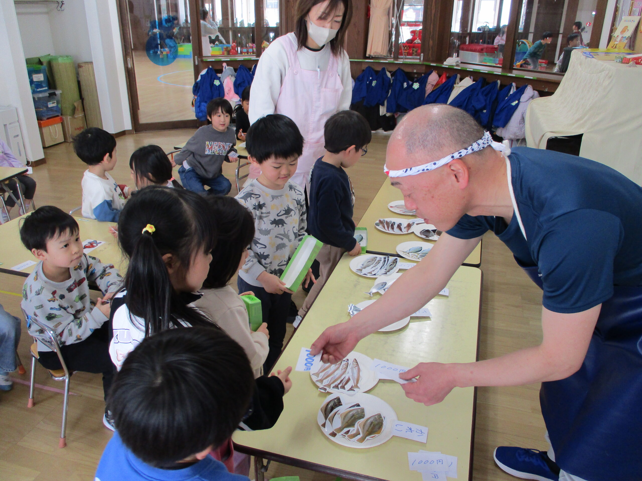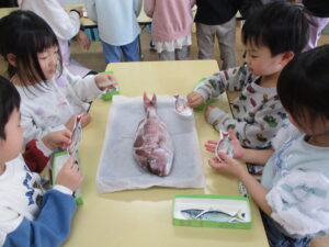 魚屋さんごっこをしながら、魚の形を覚えたり、名前を覚えたりしました。