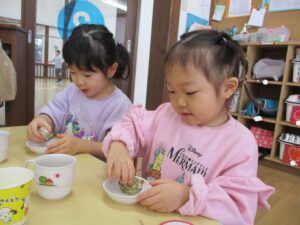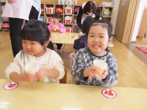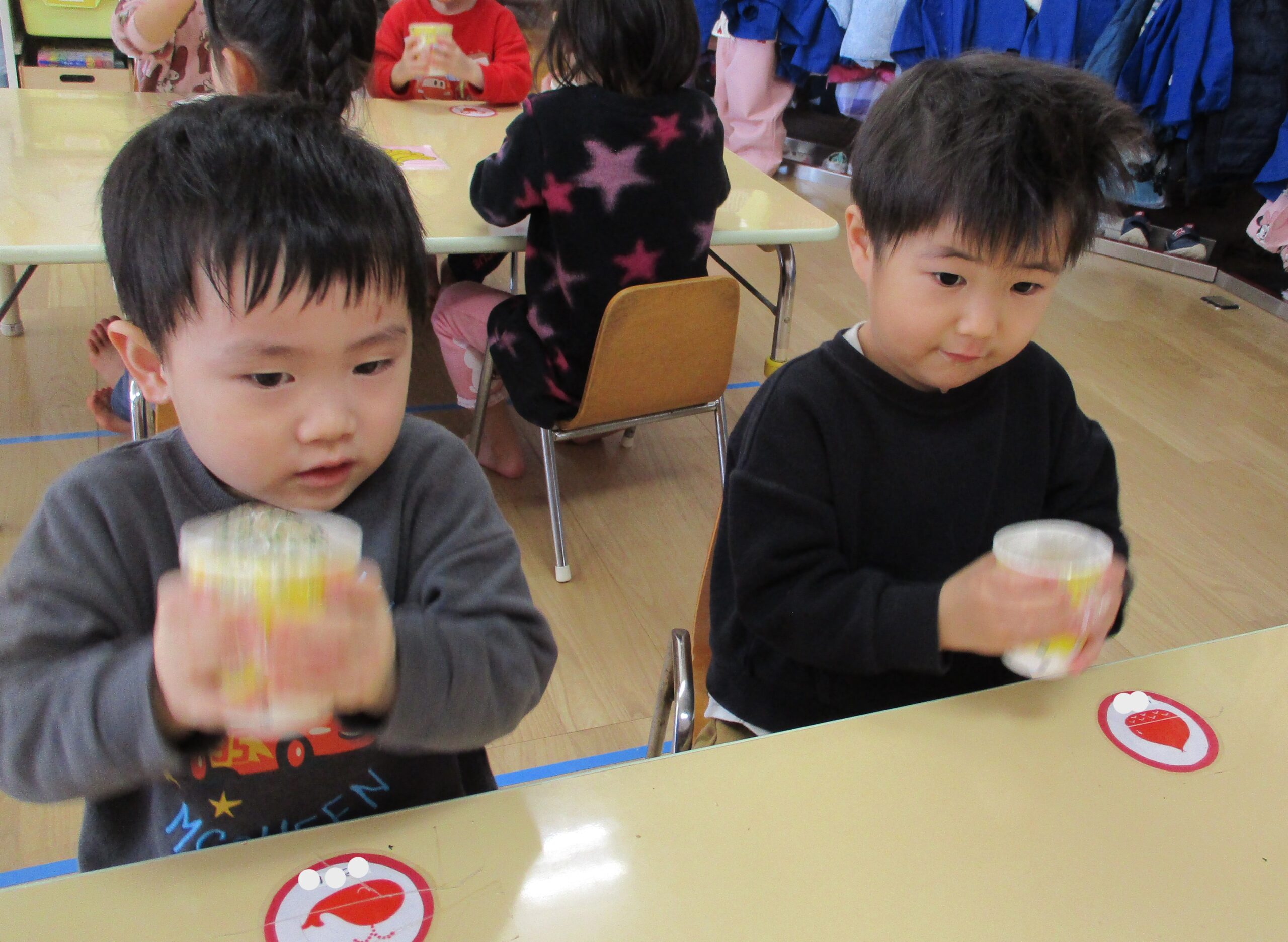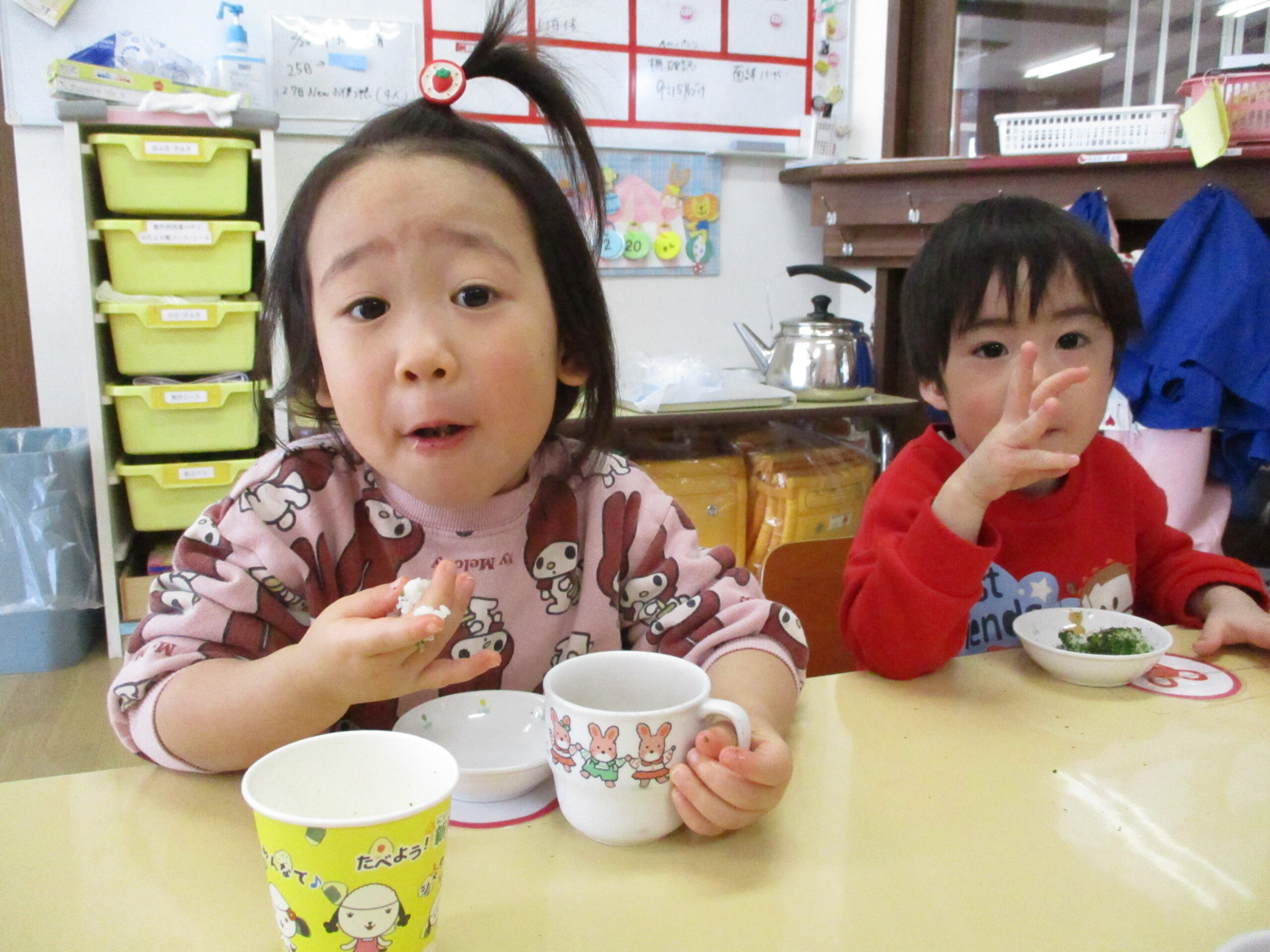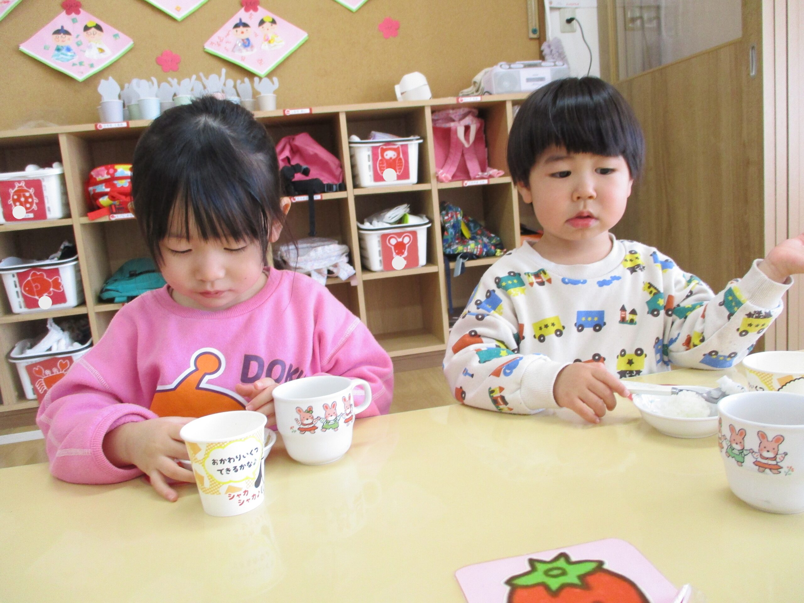 2月20日(金)りす組 「ふりかけおにぎりを作ろう」 りす組は、シャカシャカおにぎり作りをしました。紙コップにほっかほかのご飯とふりかけを入れて、カップをシャカシャカ振ります。一人が、「美味しくなぁれ!」「おいしくなぁれ!」と言うと、他の子達も「美味しくなぁれ!」「おいしくなぁれ!」とみんなで大合唱♪みんなで声を合わせながら、紙コップをシャカシャカシャカ。