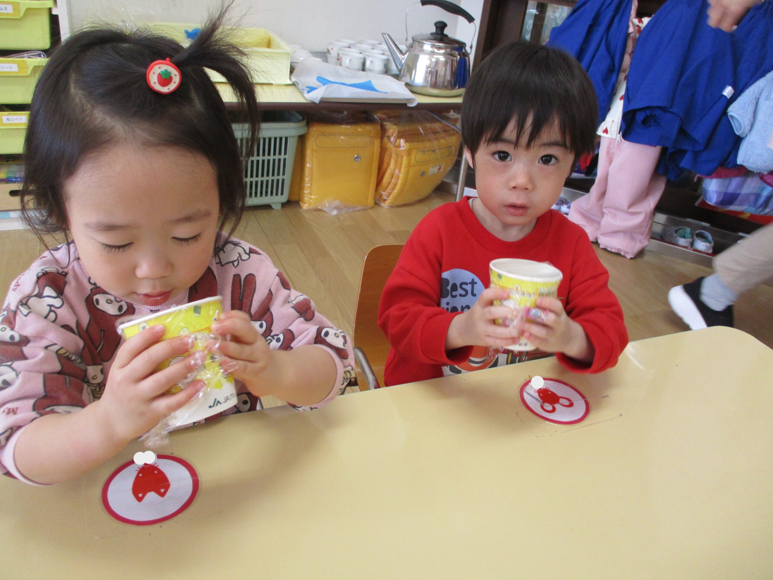 「お家でもおにぎり作れるね。」「やってみようか!」と会話がはずんでいました!2歳児さんにしては、大人な会話のやり取りでした。紙コップでおにぎり作り、ぜひお家でもやってみてくださいね!簡単にでき、満足度も100%!親子での良い時間になると思いますよ♡