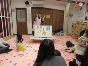 ~おはなし会~ 「♪おでんたーべよ」のミュージックシアターは「おやつたーべよ」の♪替え歌です。おいしいおでんが次々と登場して、コンコン・ドキドキ・ペンペンなど真似っこをして楽しみました。