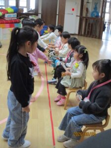 3歳以上児は、~ひしもち運びリレー~です。おひな様チームとおだいり様チームに分かれてリレーです。