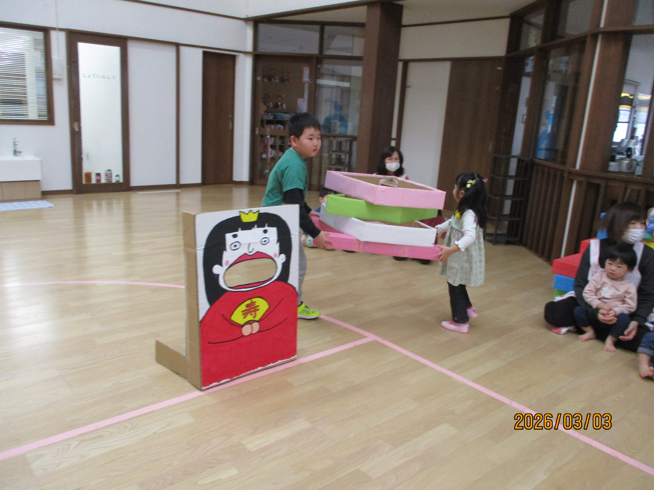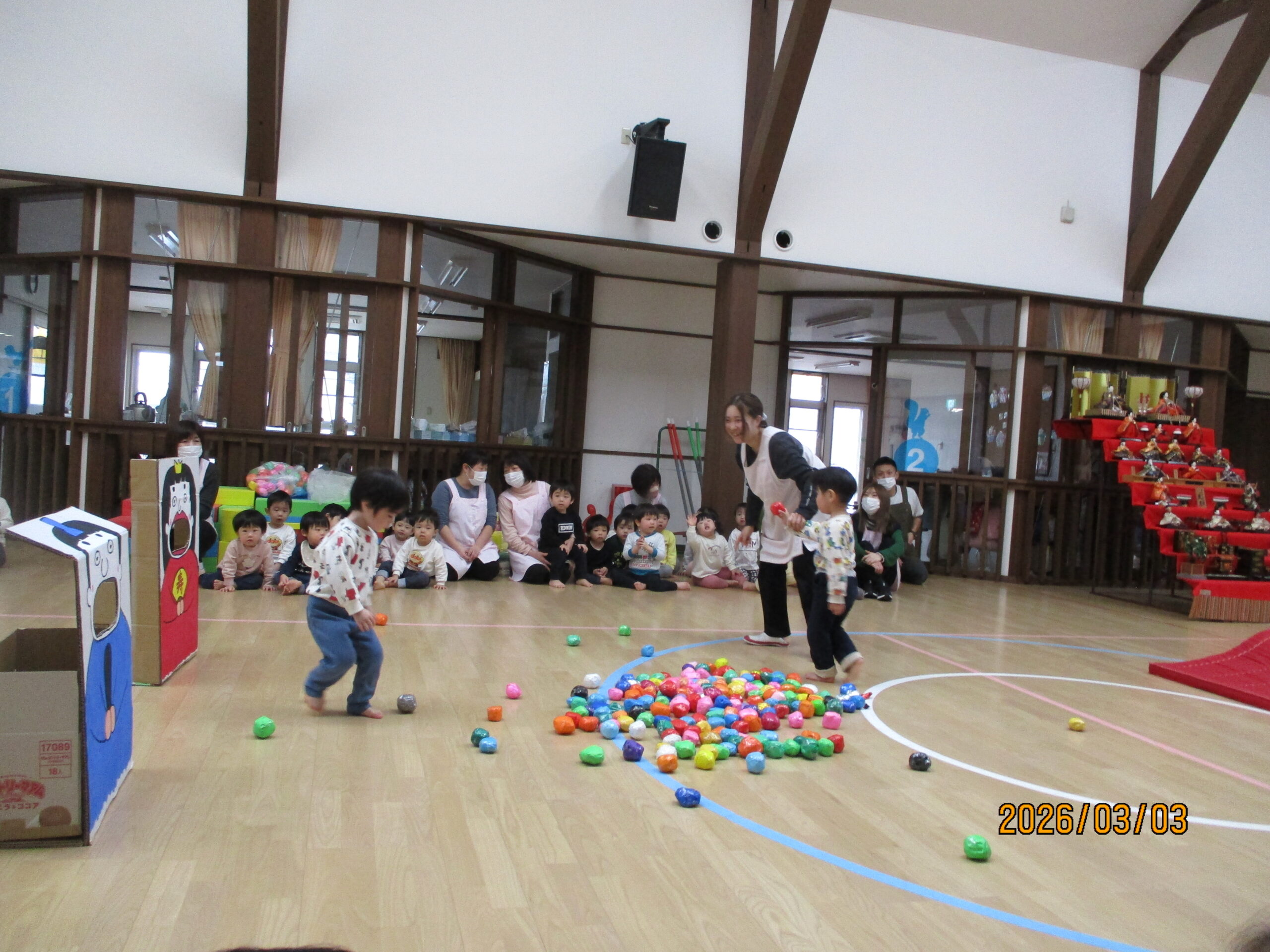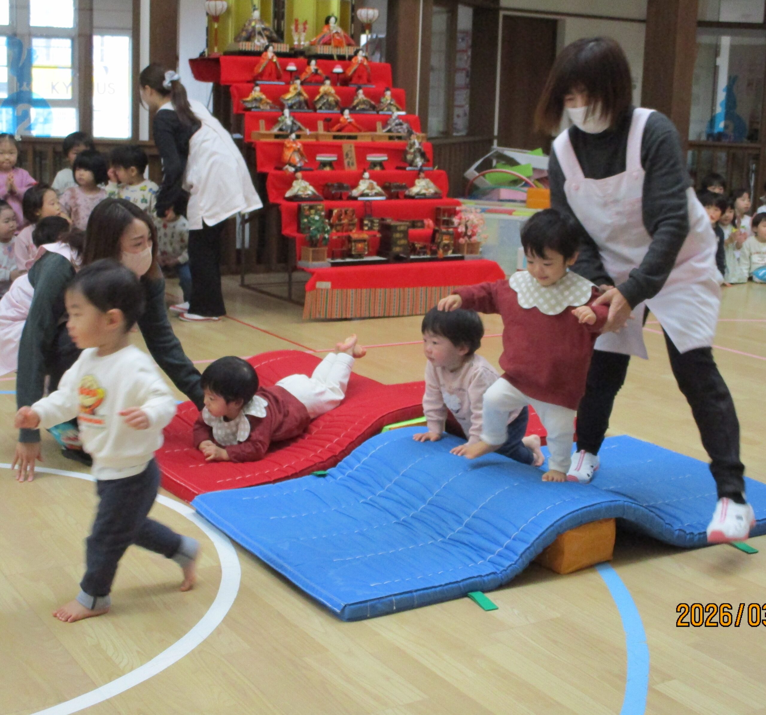 ~ひなまつりの集い~ ひな祭りの由来を聞いたり、ゲームをしたりして楽しみました! 未満児のゲームは~ひなあられを「はい、どうぞ」~です。マットの山を越えて、ひなあられを1つ持っておひな様かおだいり様に食べさせてあげました。