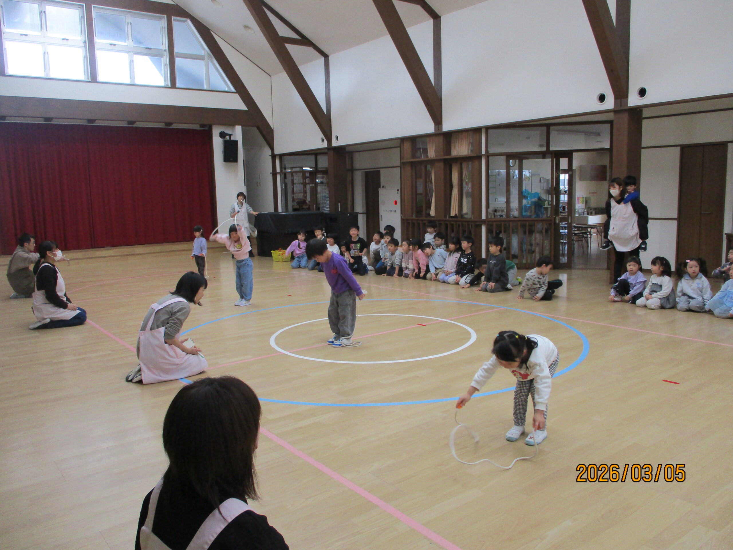 年少さんは初めての縄跳びでしたが、なわとびカードに印が付くのを楽しみに練習を始めました。年中さん、年長さんは、自分の目標を持って、毎日の練習を頑張りました!練習の成果がだせたかな?頑張るぞ!と作戦を練っている子、緊張してしまった子、いつも通り跳べた子、いつもより記録が伸びた子と様々でしたが、一人ひとり、諦めずに頑張る気持ちやできた時の喜びが味わえたと思います。