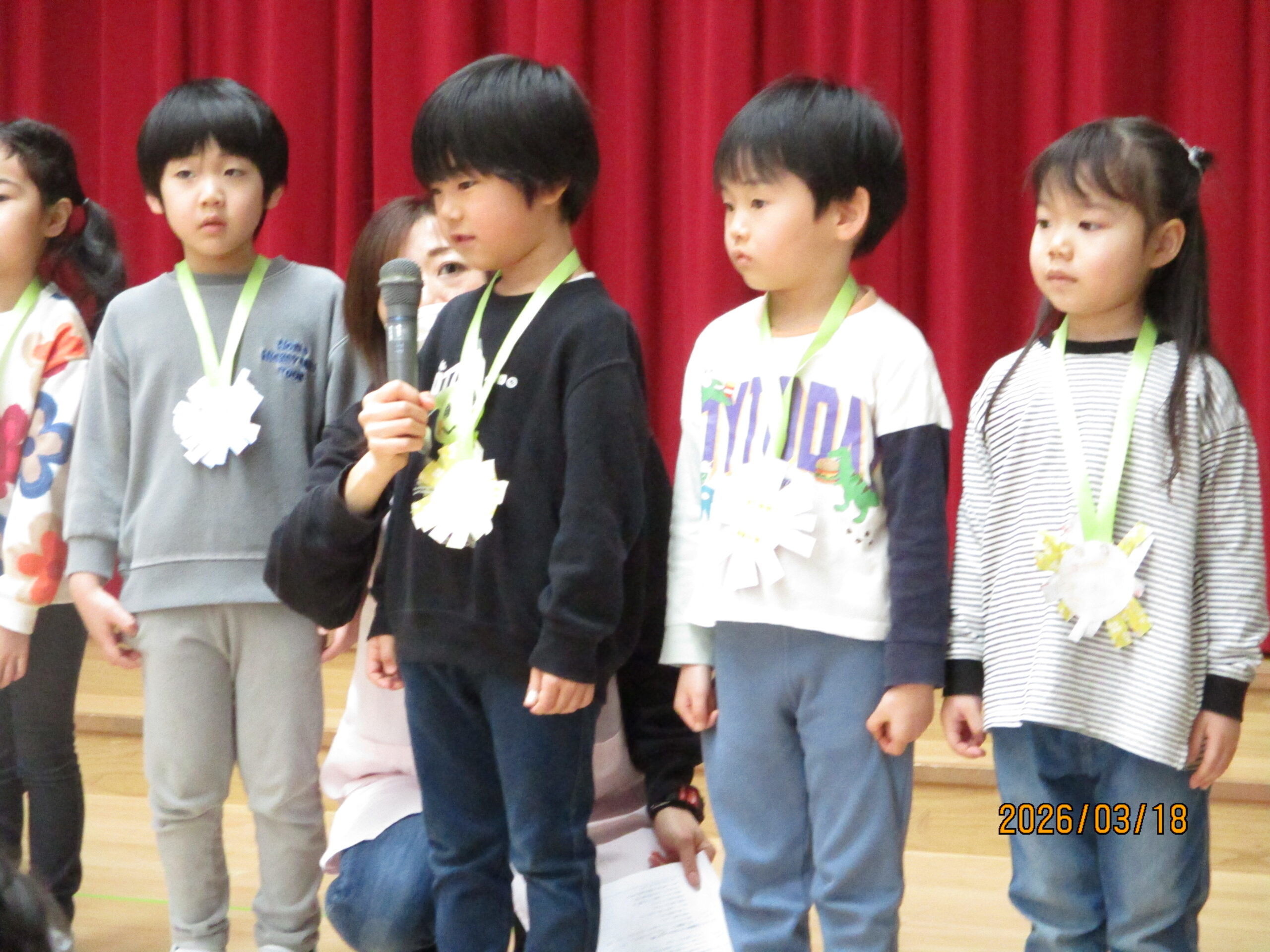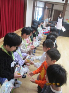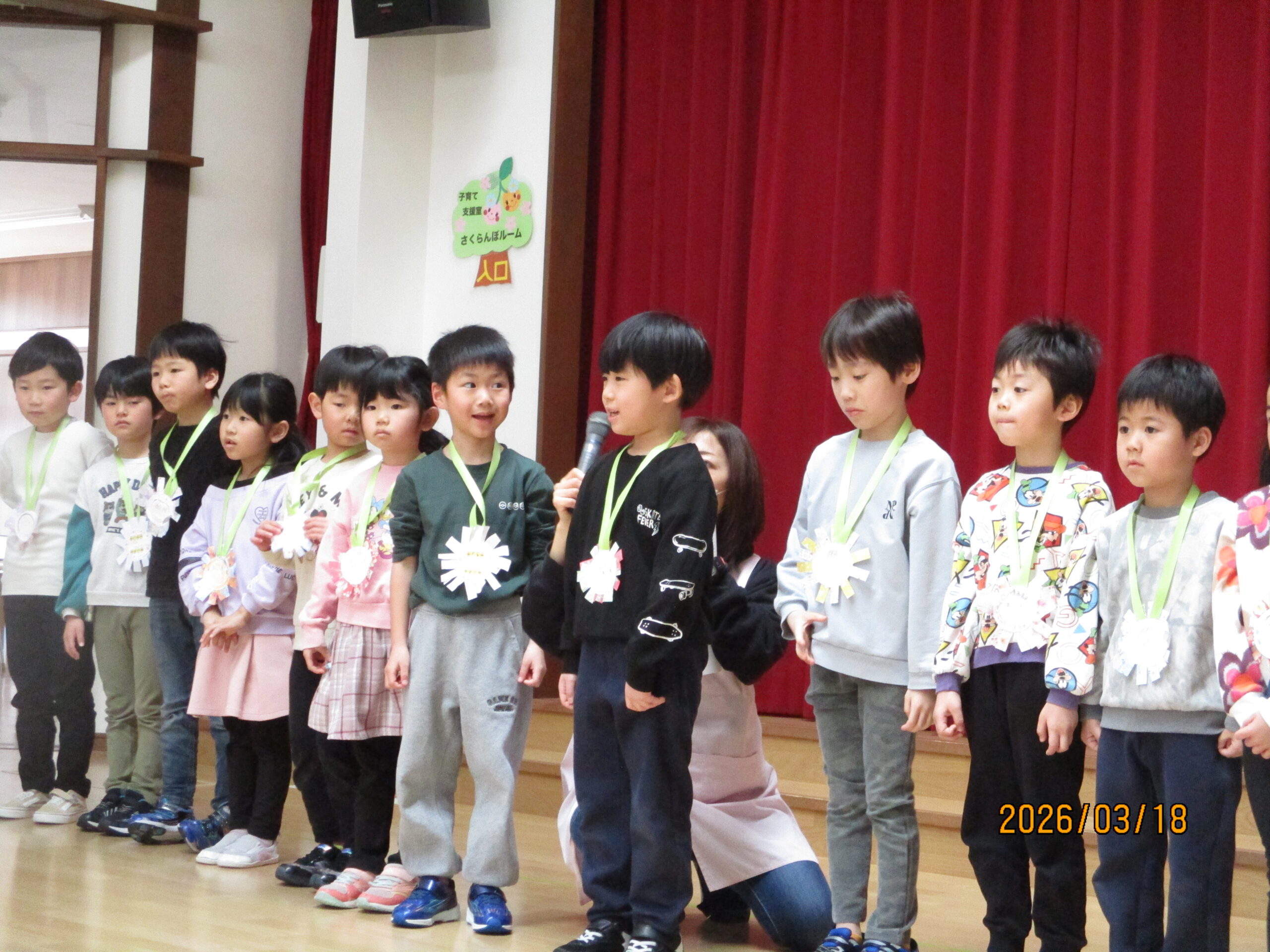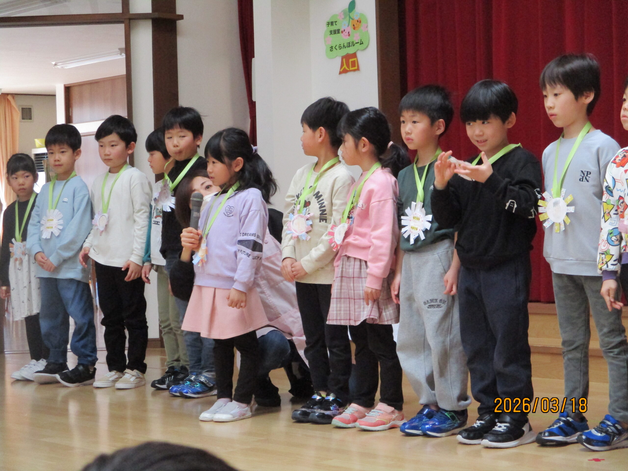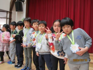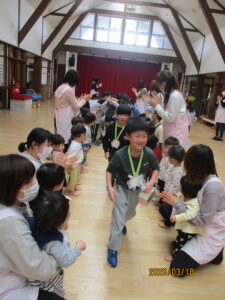 18日(水)、お別れ会がありました。年長組さんは、お別れ会の主役です!今まで保育園で過ごした日々を思い出しながら、お別れ会に参加しました。うさぎ組のお友達からレイを首にかけてもらいました。「卒園おめでとう😊」