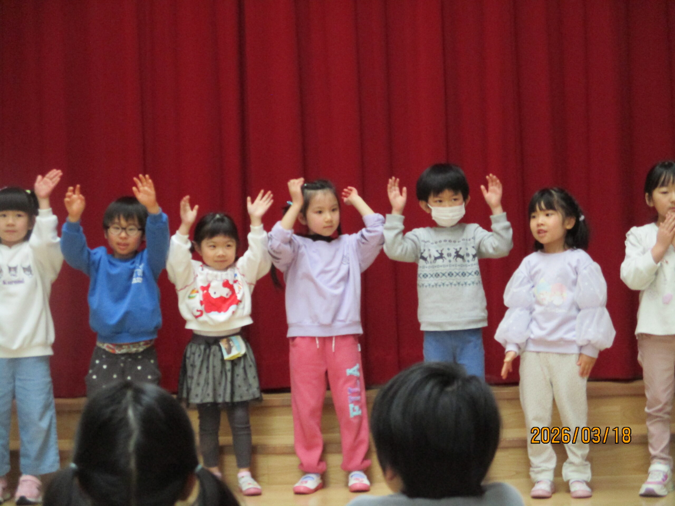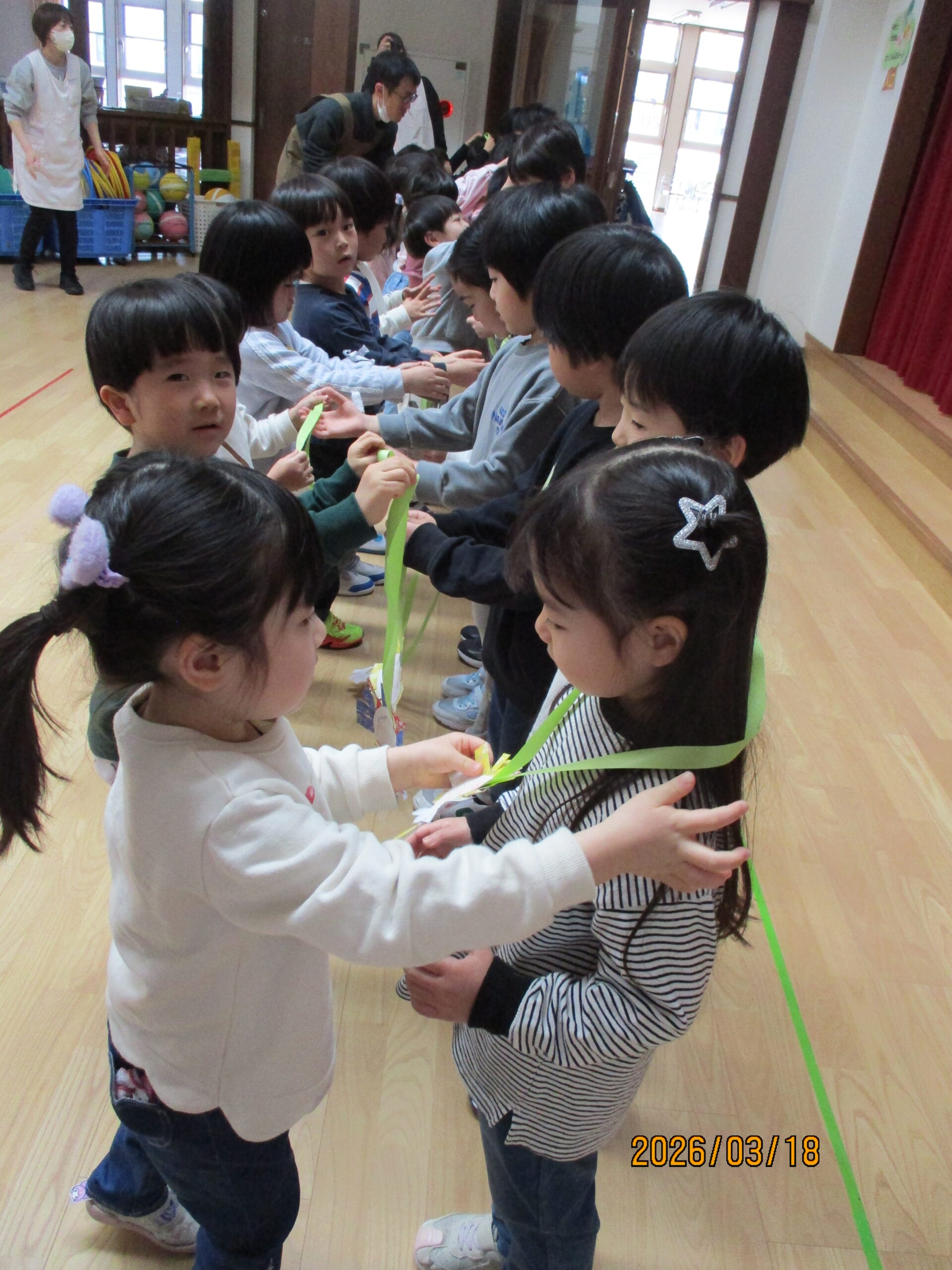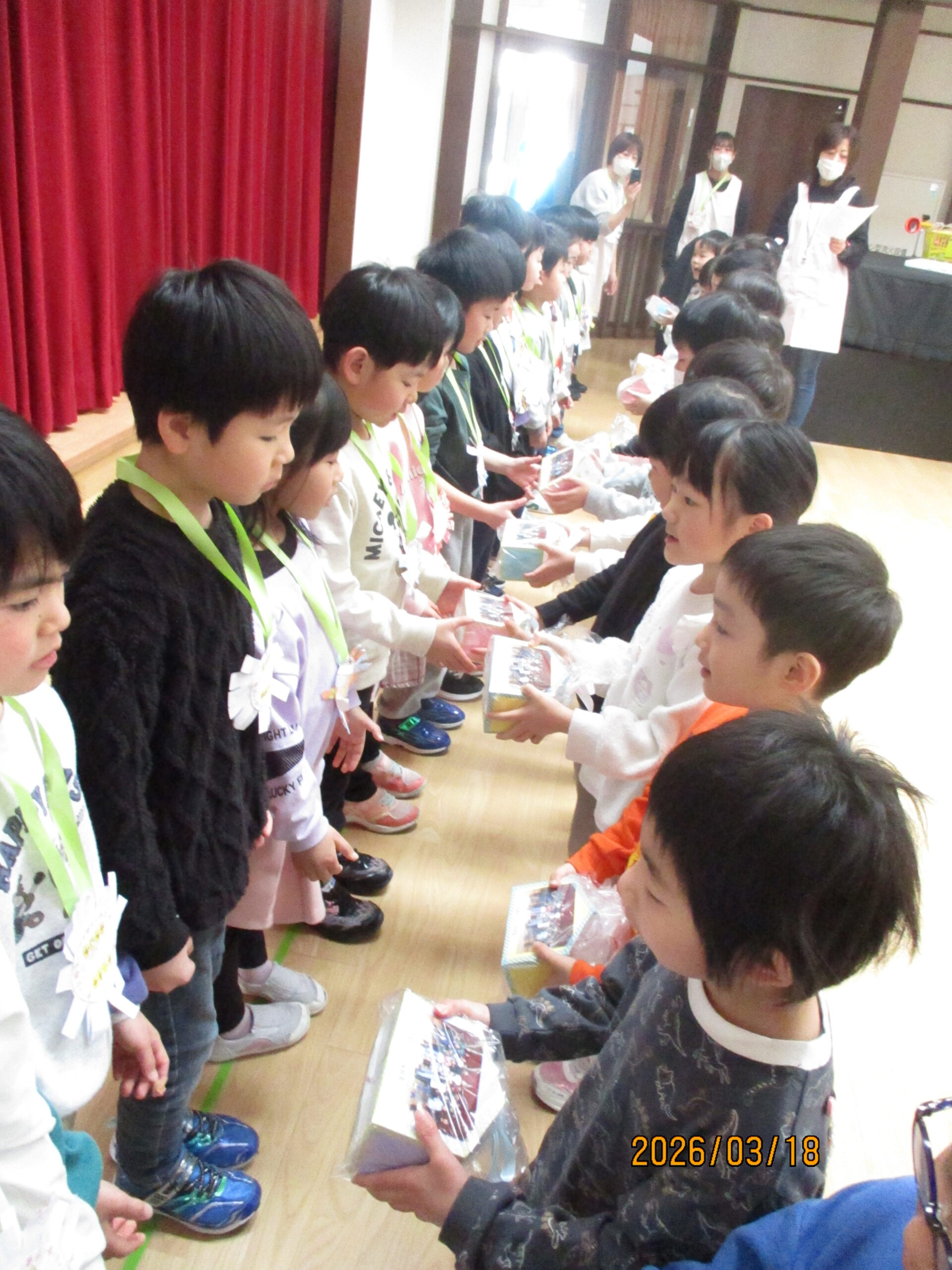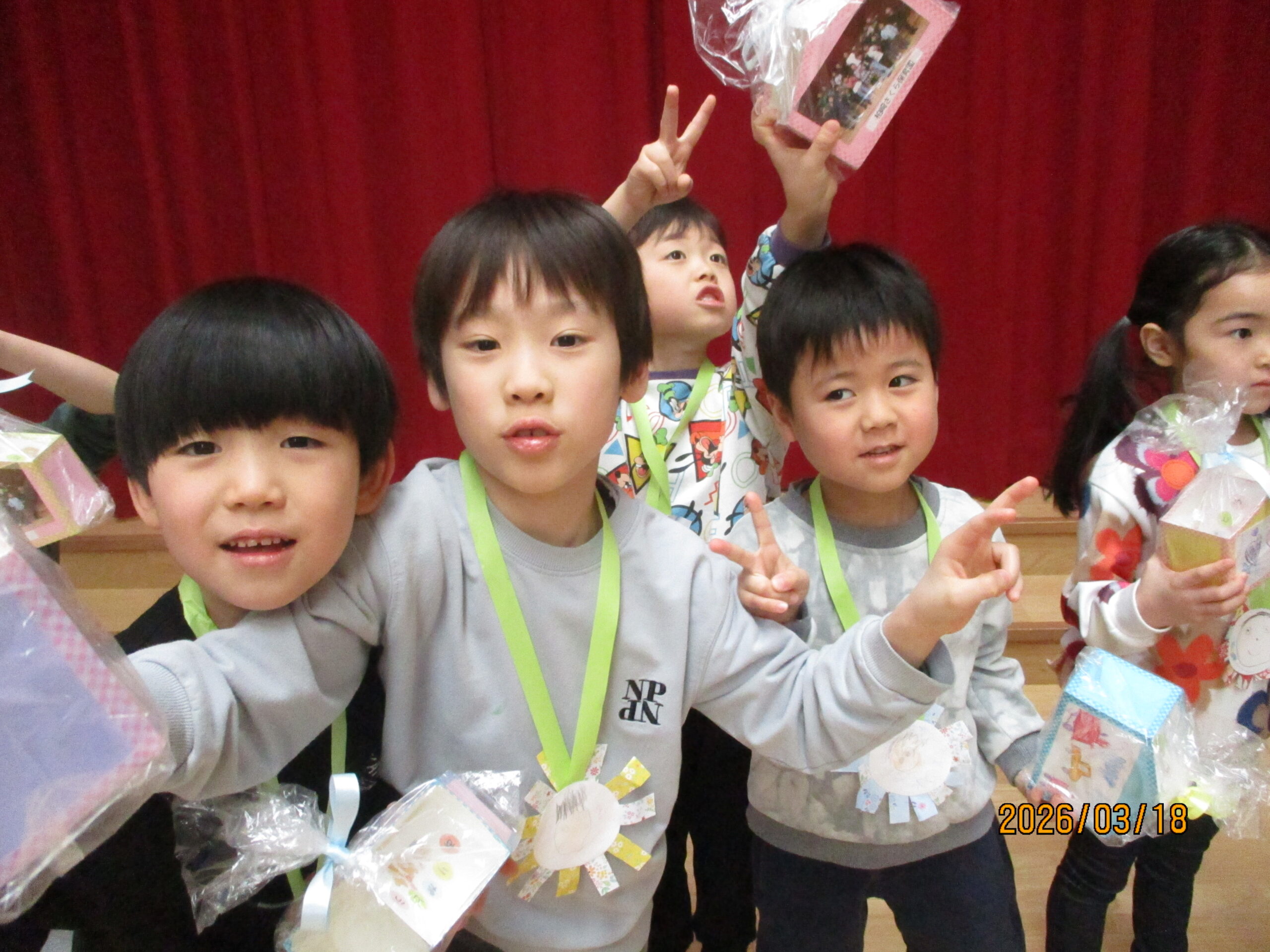 18日(水)、お別れ会がありました。年長組さんは、お別れ会の主役です!今まで保育園で過ごした日々を思い出しながら、お別れ会に参加しました。うさぎ組のお友達からレイを首にかけてもらいました。「卒園おめでとう😊」
