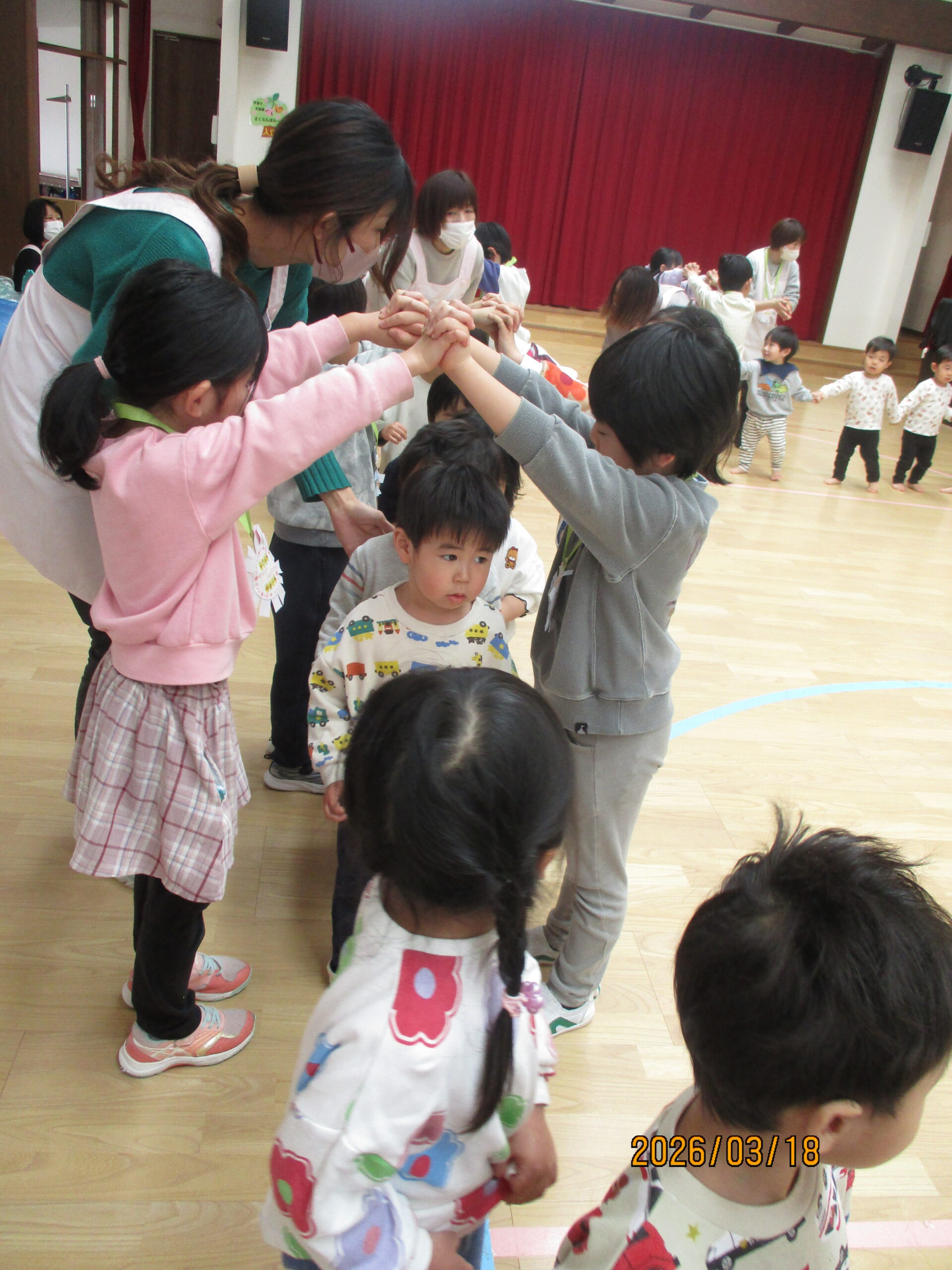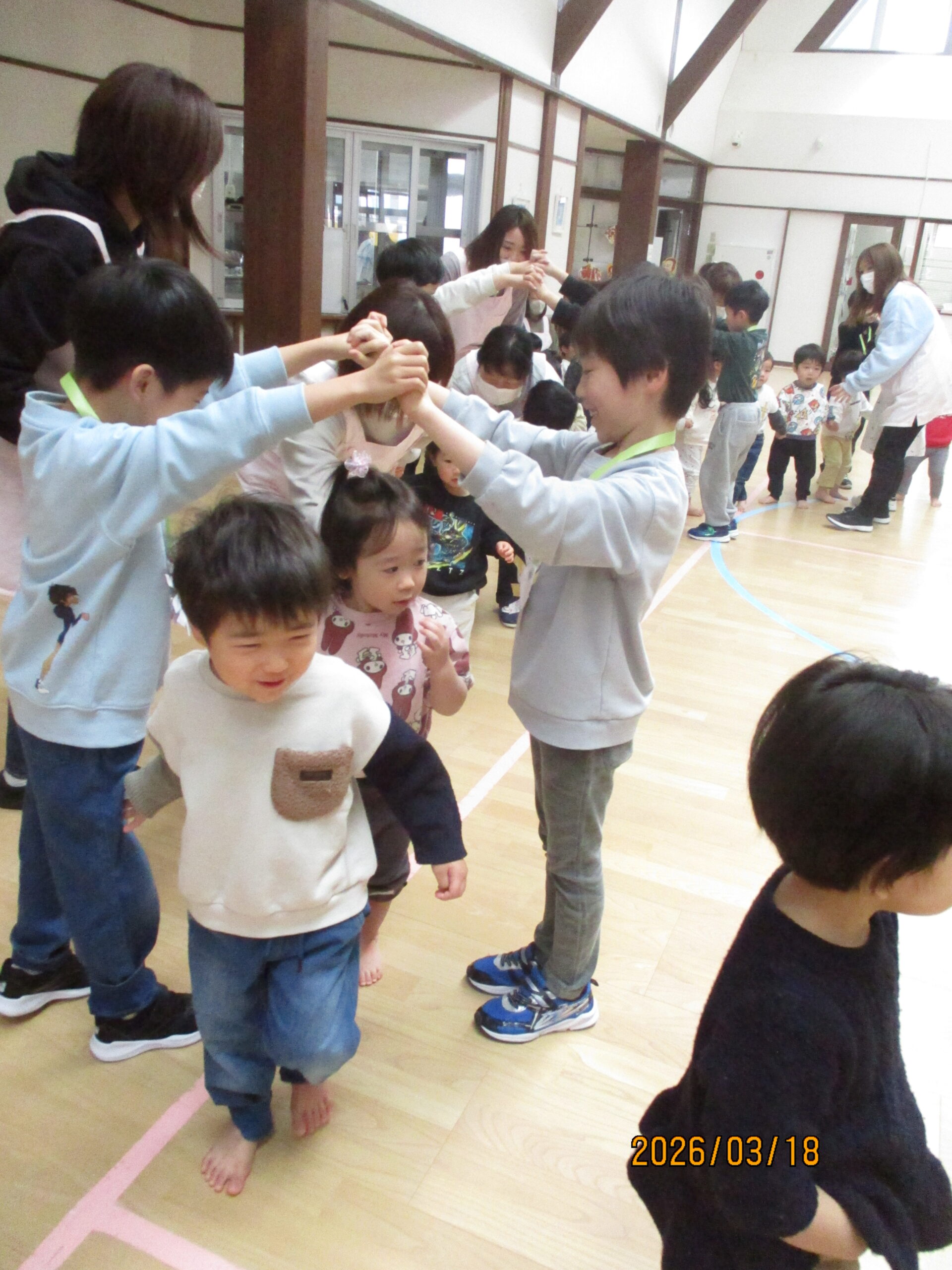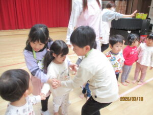 未満児のお友達と年長さんで、『なかよしロンドン橋』をしたよ!年長組さんが2人組になって、橋役になってくれました。音楽に合わせて歩きます♪「橋役のお兄さん・お姉さんにつかまっちゃった!」「ギューってしてもらったよ」