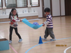 3歳以上児は「ボール運びリレー」のゲームをしました。うさぎ組・くじら組は、タオルの上にボールをのせて運びます。ボールを落とさないように慎重にしんちょうに!