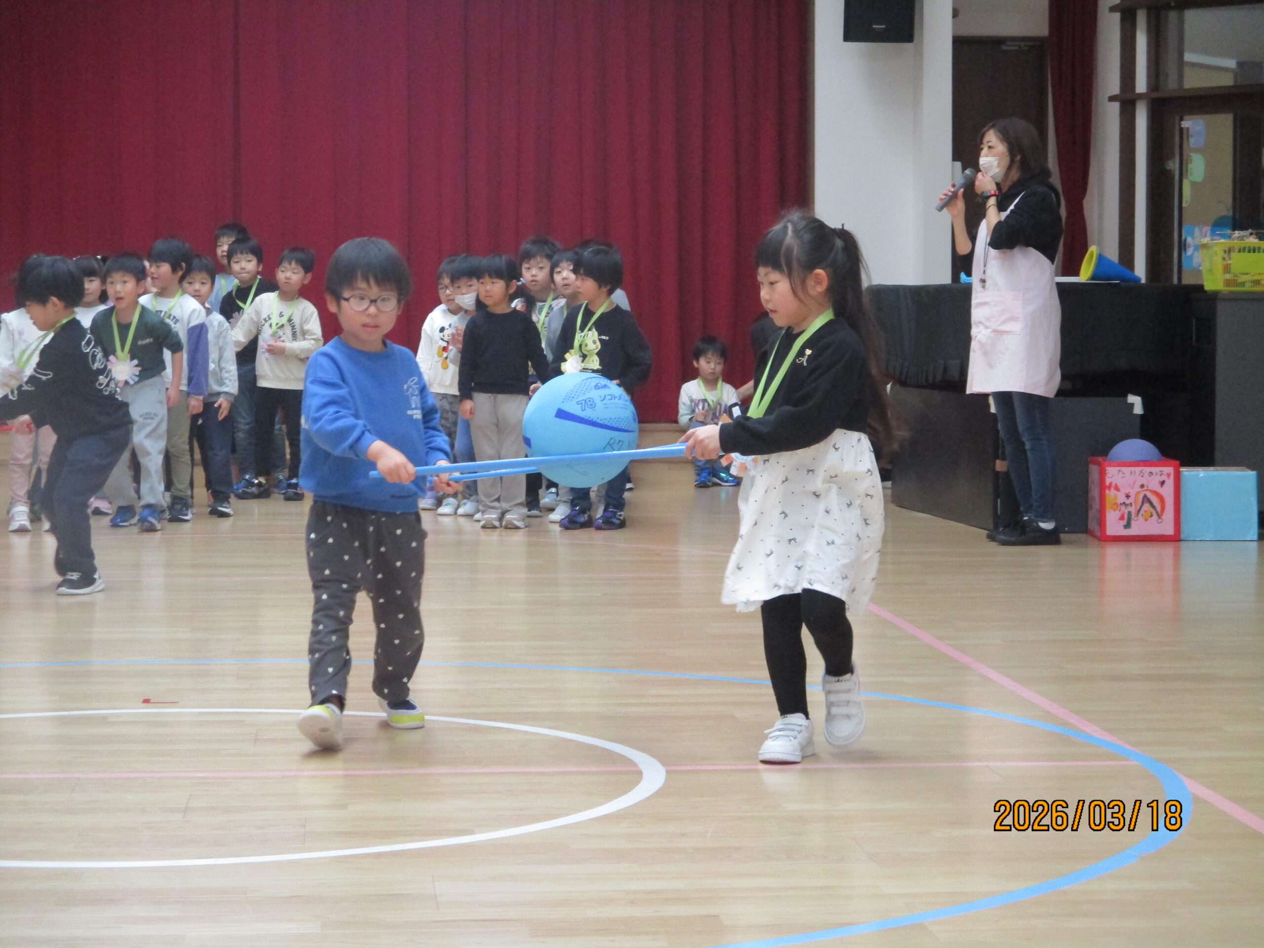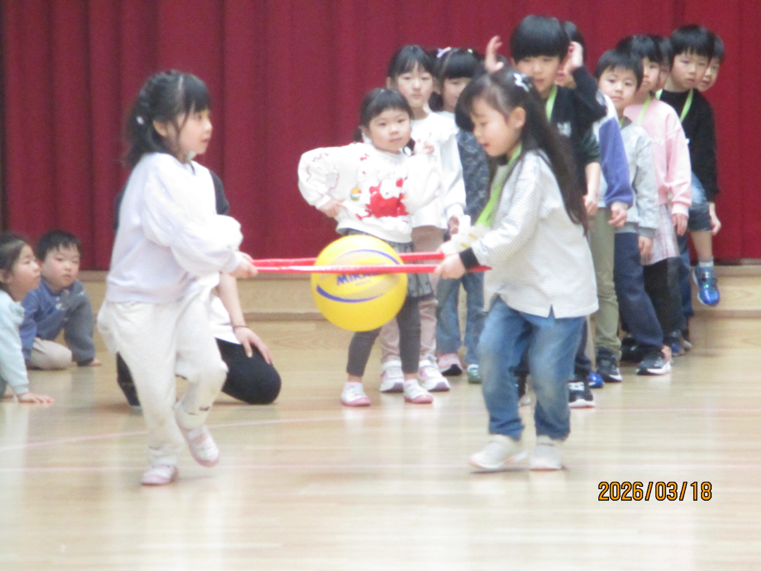 らいおん組とくじら組は、2人で2本の棒を持ち、その上にボールをのせて運びます。年長組がしっかりリードしてくれました!!