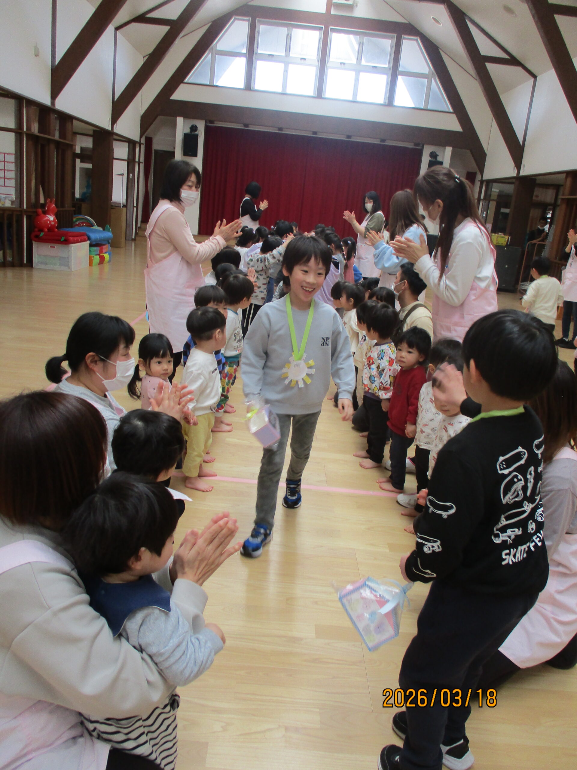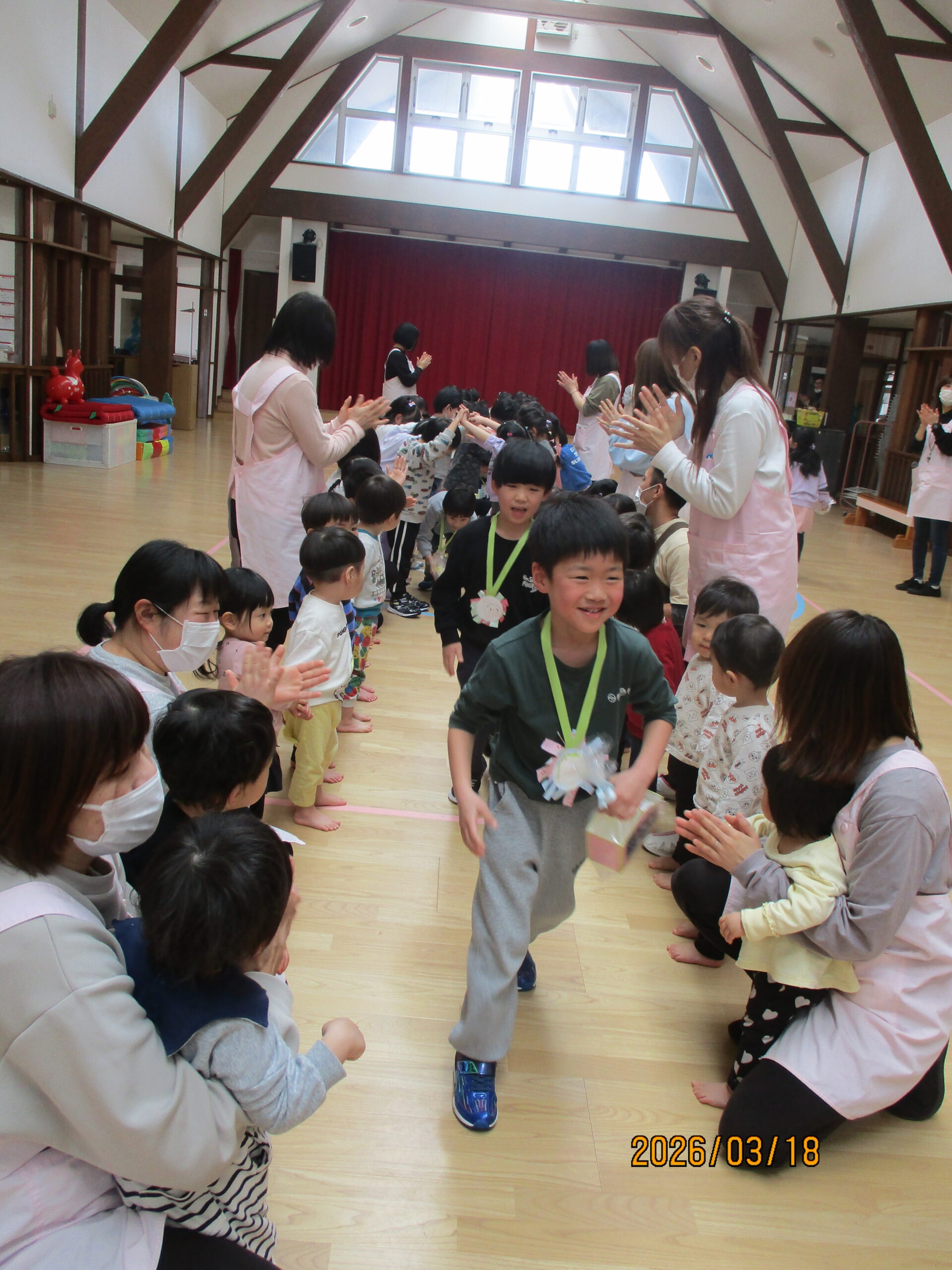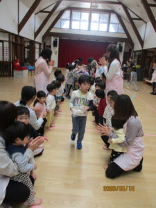 最後は、花道を通って退場です!照れながらも、堂々と歩く姿に成長を感じました。「卒園おめでとう☆、小学校に行っても元気で頑張ってね!」