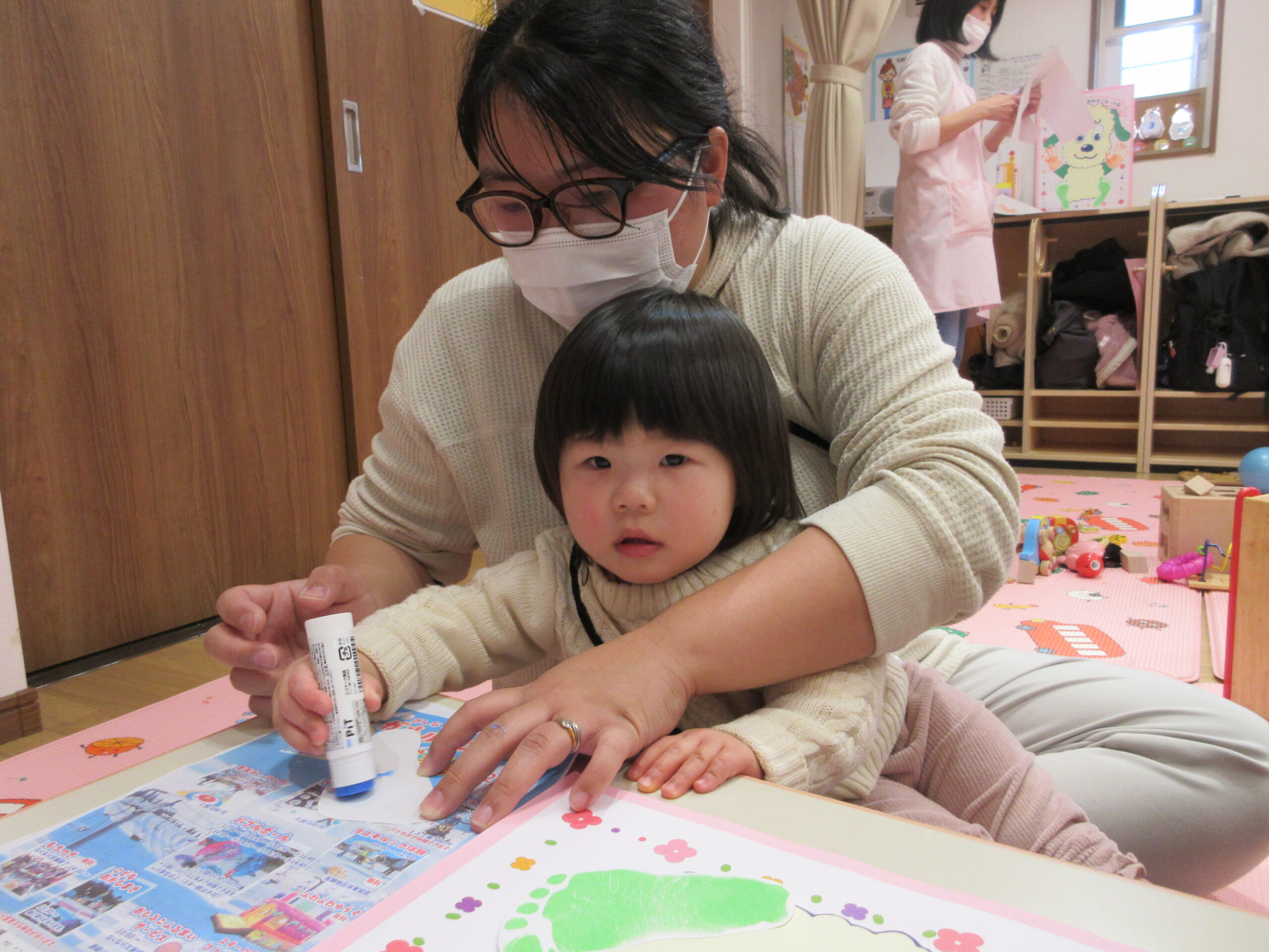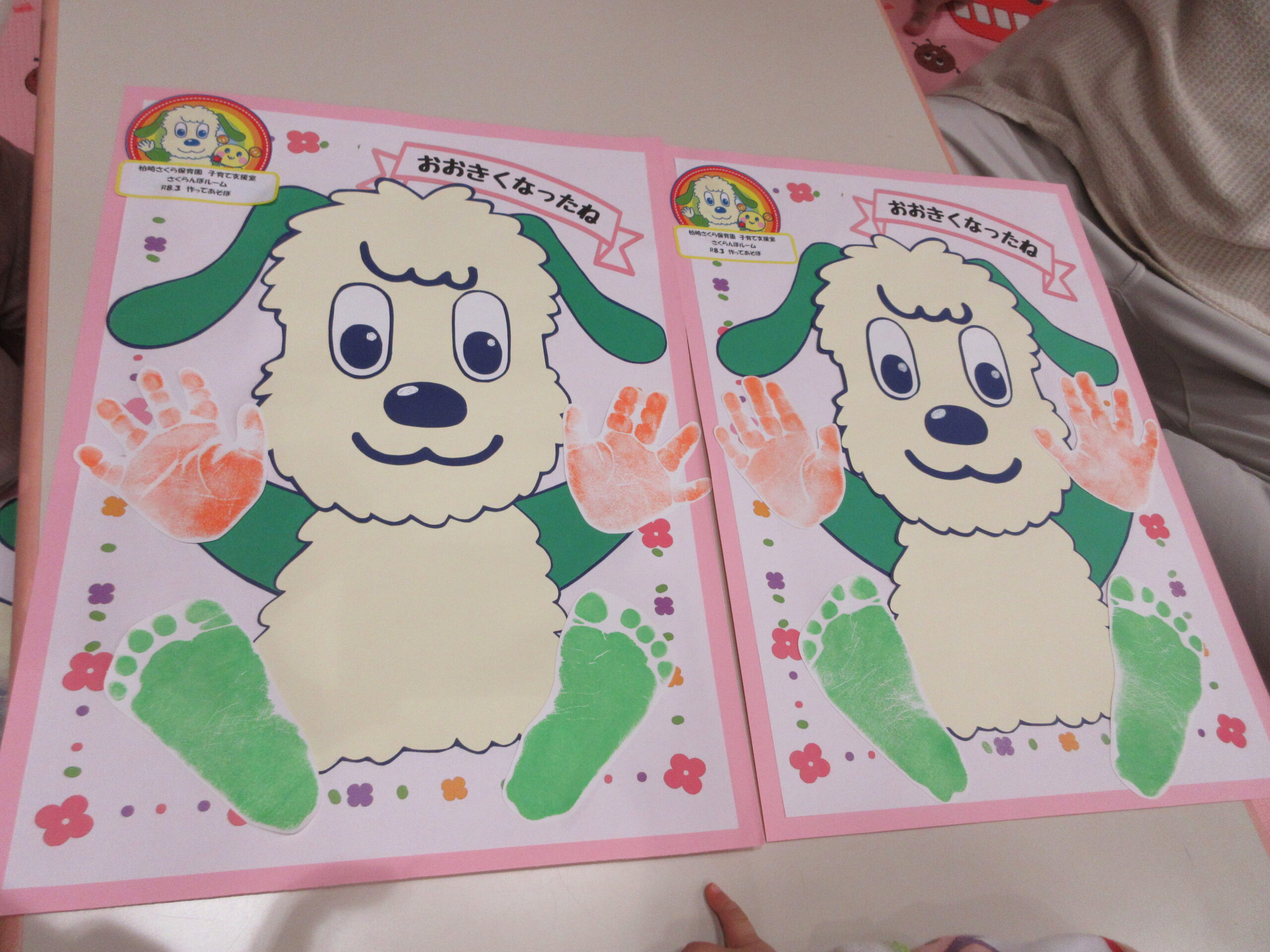 ~作ってあそぼ~ みんな「大きくなったね」と手形・足形をとりました。「数か月しか違わないのに、こんなに違うんだね」「もう、こんなに大きくなったんだね」とお母さんたちも見比べながら成長を実感していました。手形・足形をとることも上手になりましたね。