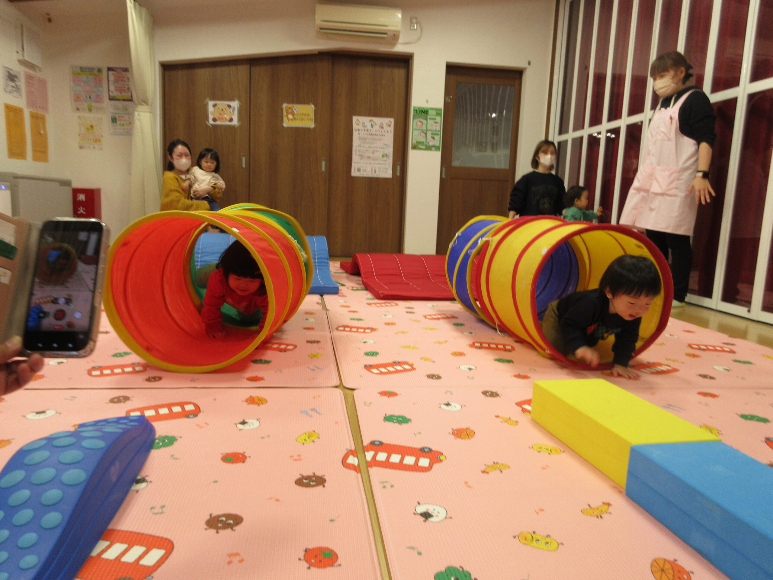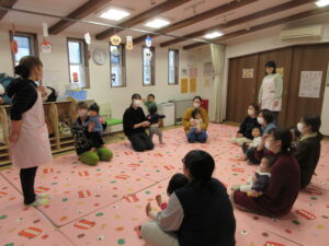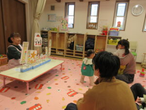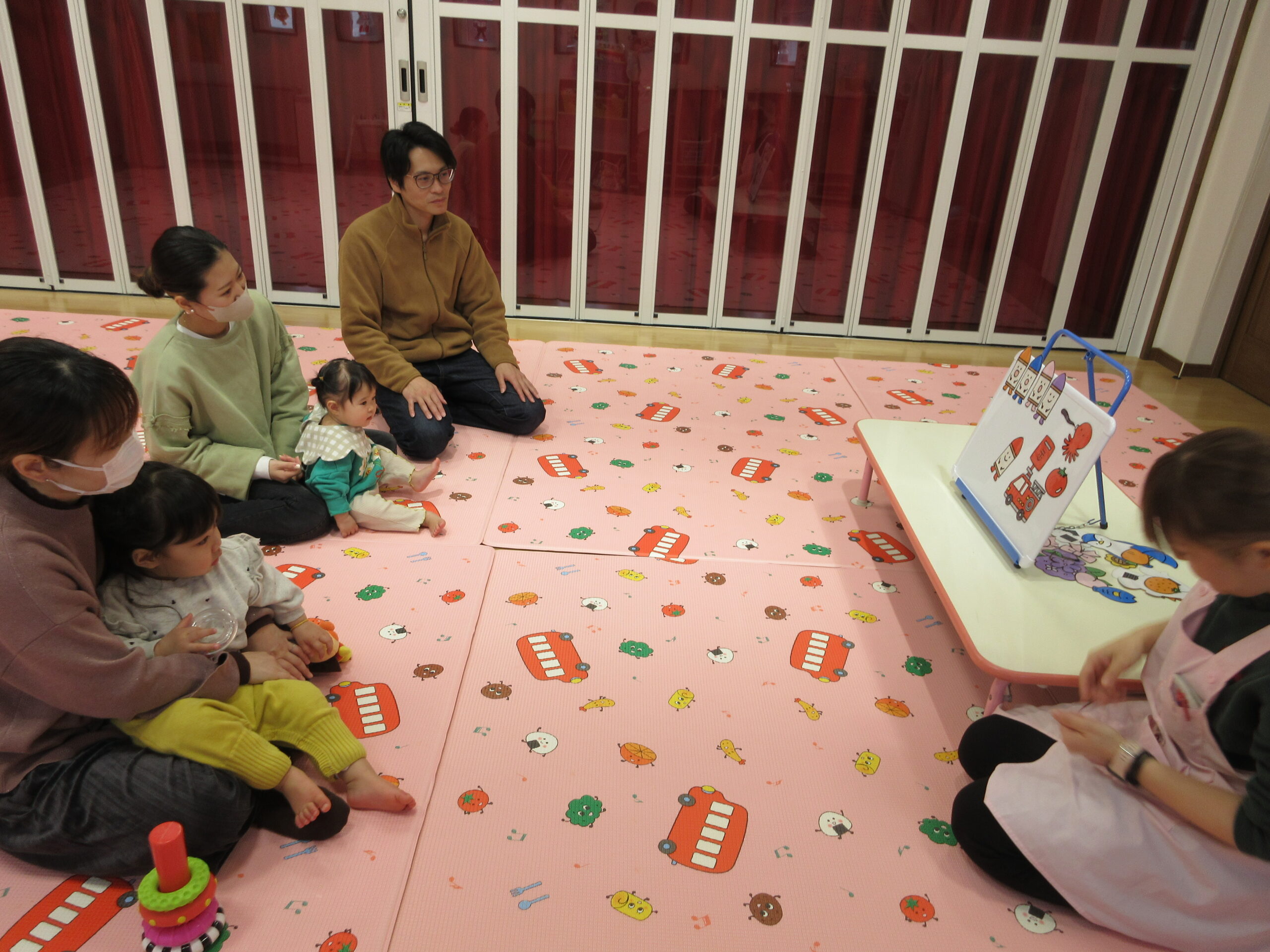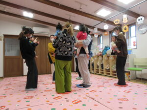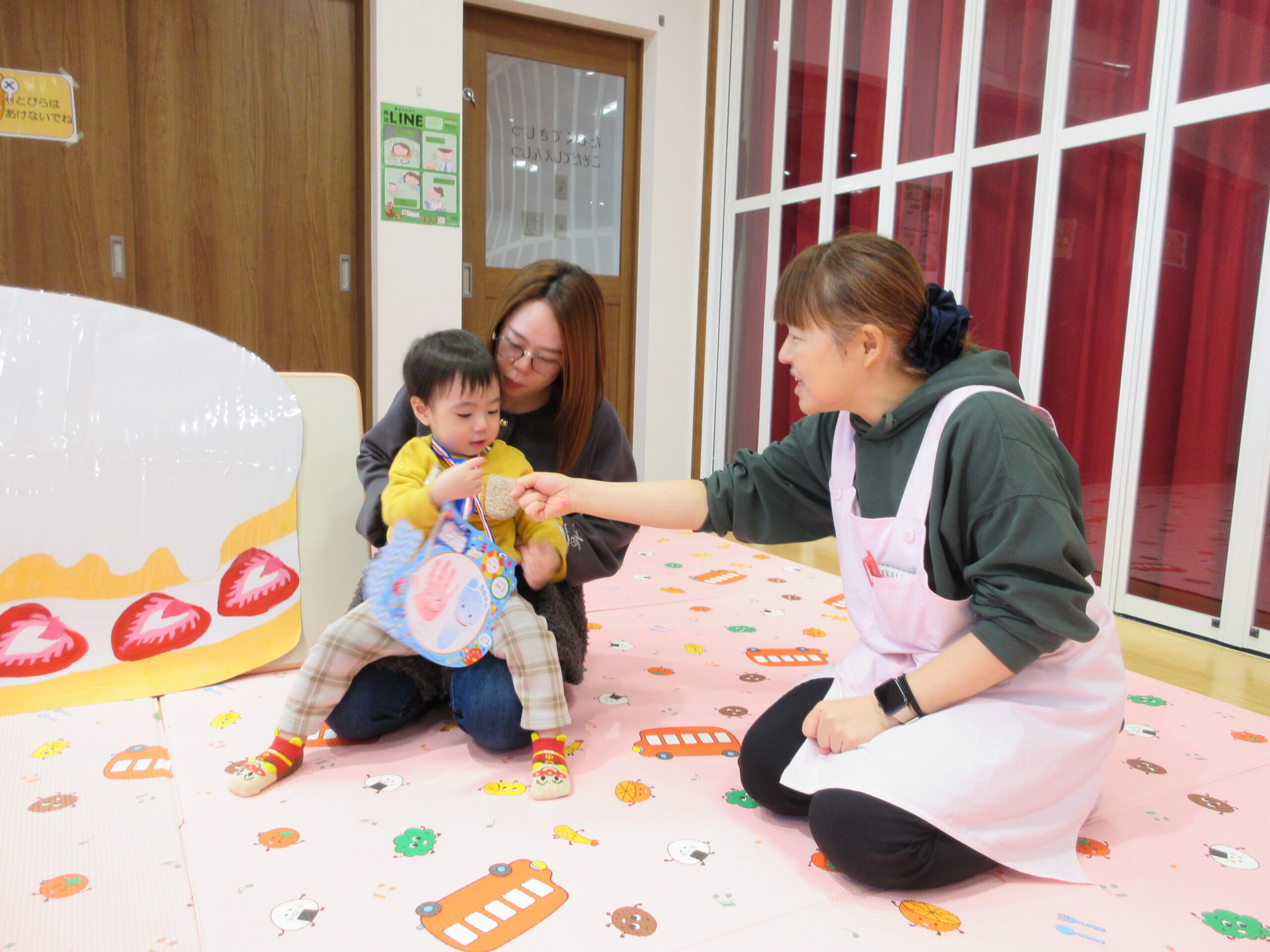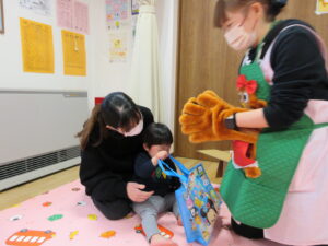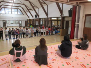 ~お楽しみかい~ 今年度最後のお楽しみかいは、お父さんお母さんのお膝にのってふれあい遊びをしたり、抱っこをしてもらって島とりゲームをしたりして楽しみました。島取りゲームでは、島を取り合ったり、「どうぞ、どうぞ」と譲り合ったり、白熱した時間でした。優勝したお母さんには、みんなからの「県内どこでもおすすめの遊び場は?」「柏崎ならどこのお店がおすすめ?」「子どもが寝ない時の対処法を教えて」「ディズニーどうでしたか?」など質問タイムで更に盛り上がりました。最後は、「また遊びに来てね」「保育園に行ってもがんばってね」とゴリラのゴリ子さんからプレゼントがありました。