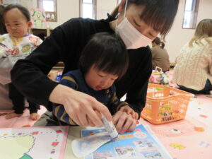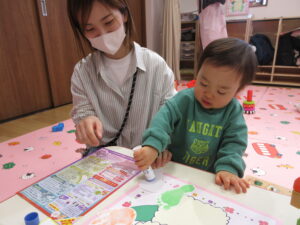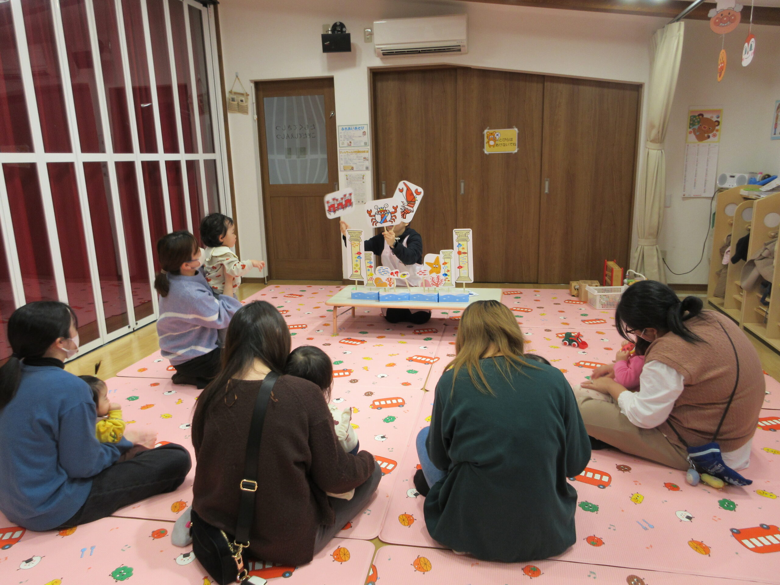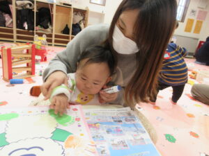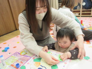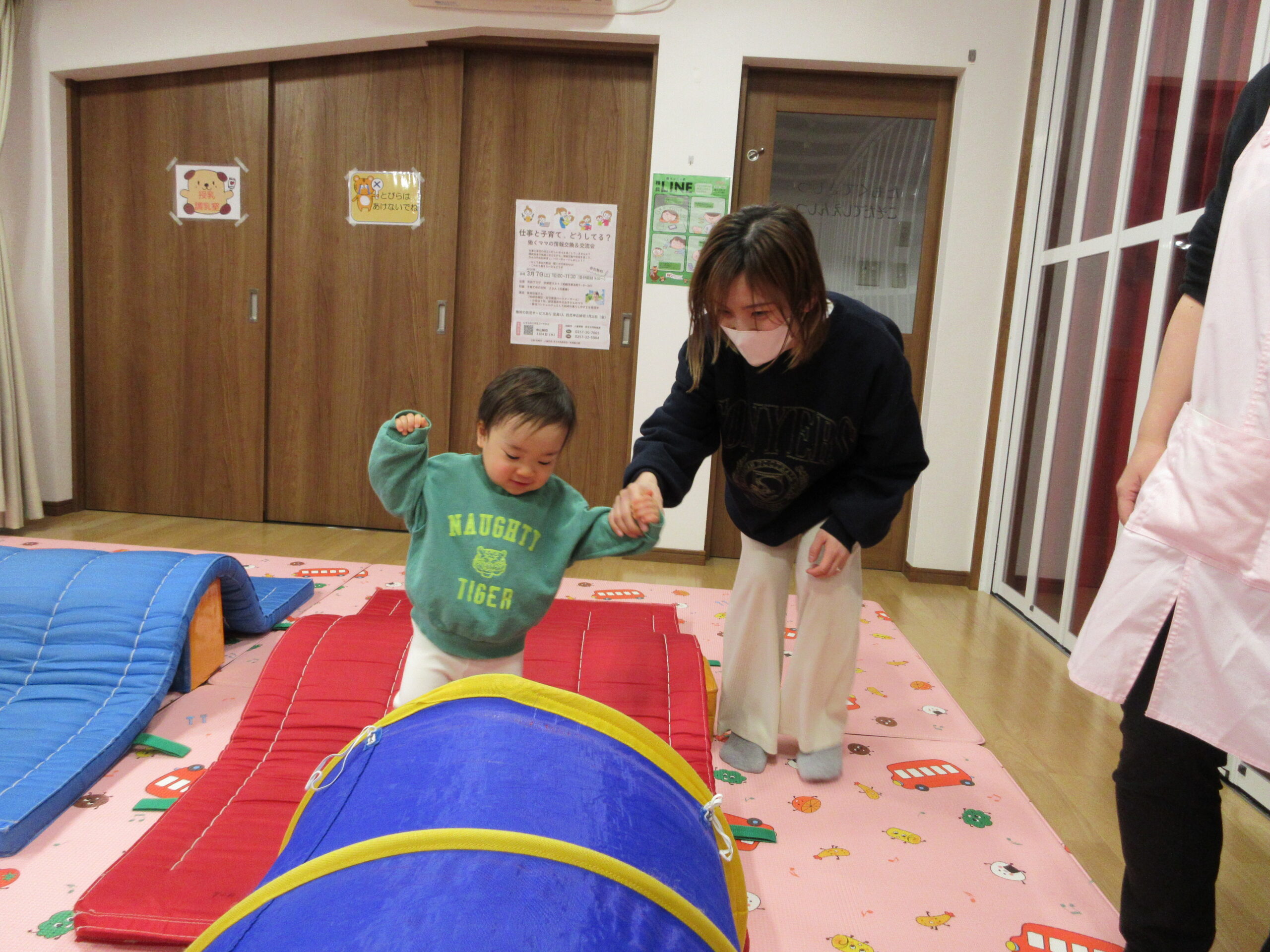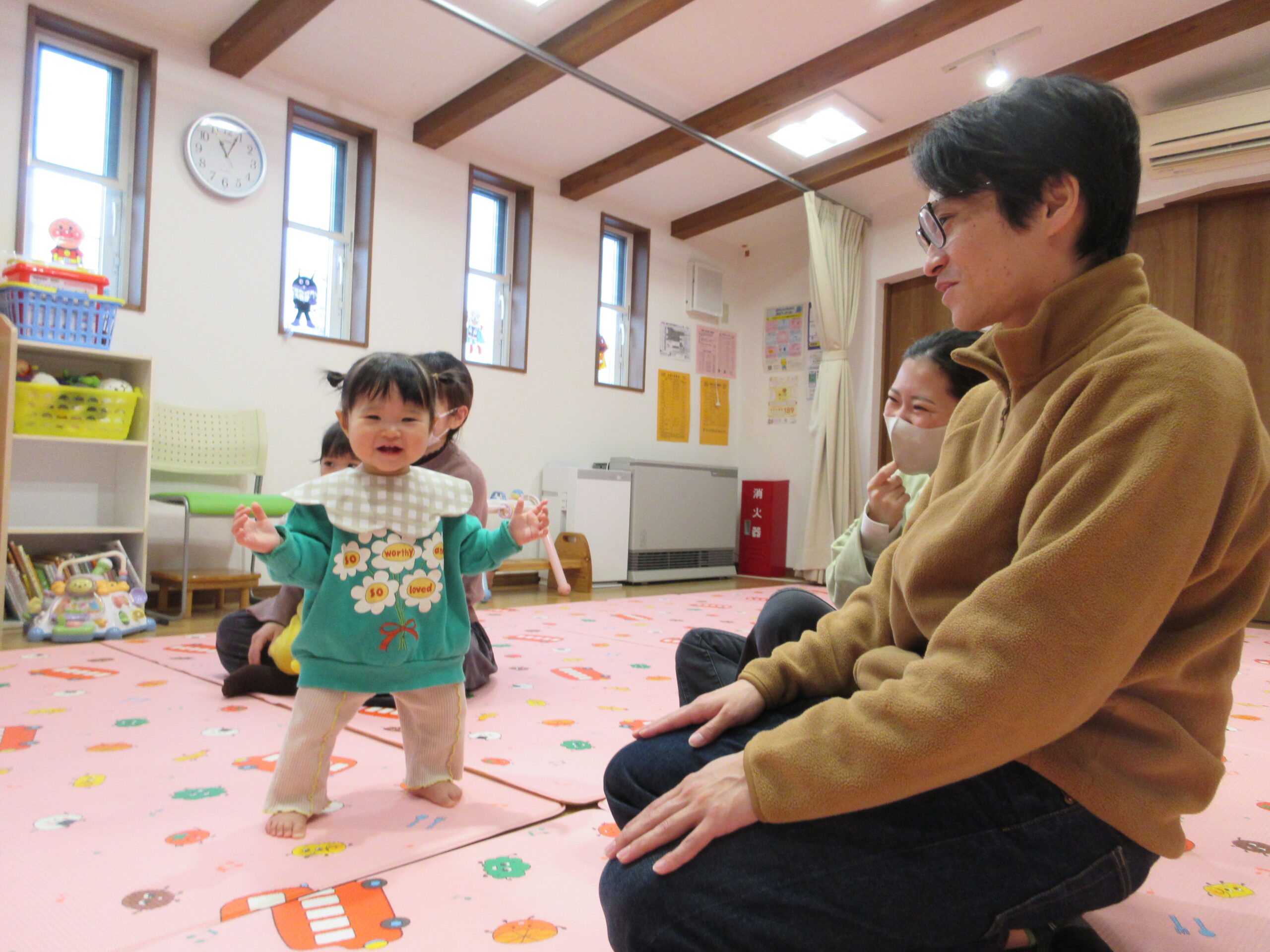 ~お楽しみかい~ 今年度最後のお楽しみかいは、お父さんお母さんのお膝にのってふれあい遊びをしたり、抱っこをしてもらって島とりゲームをしたりして楽しみました。島取りゲームでは、島を取り合ったり、「どうぞ、どうぞ」と譲り合ったり、白熱した時間でした。優勝したお母さんには、みんなからの「県内どこでもおすすめの遊び場は?」「柏崎ならどこのお店がおすすめ?」「子どもが寝ない時の対処法を教えて」「ディズニーどうでしたか?」など質問タイムで更に盛り上がりました。最後は、「また遊びに来てね」「保育園に行ってもがんばってね」とゴリラのゴリ子さんからプレゼントがありました。