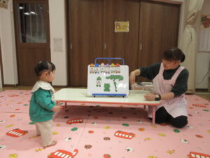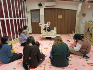 ~おはなし会~ ♪どんないろがすきのミュージックシアターは、歌に合わせていろいろな色のものが出てきました。知っているものが出てくると近くに出てきたり、指をさしたり大喜び!全部の色が揃うと大きな虹になりました。