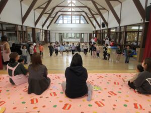 ~誕生会~ いつものようにカードとメダルのプレゼントをお友だちからもらって、インタビュータイム。今月のお楽しみは保育園の年長児さんから歌のプレゼントと、年中児さんからダンスのプレゼントでした。